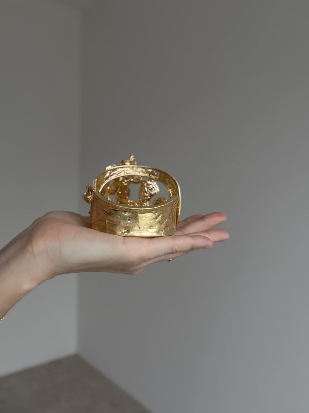 Ta bransoletka to wyrazisty dodatek biżuteryjny, który wygląda jak mała rzeźba na nadgarstku. Ma usztywnianą formę mankietu i efektowny, przestrzenny motyw inspirowany płatkami, dzięki czemu od razu przyciąga wzrok i nadaje stylizacji odświętny charakter. Zapięcie ułatwia zakładanie i sprawia, że bransoletka dobrze trzyma się na ręce zarówno na co dzień, jak i wieczorem.