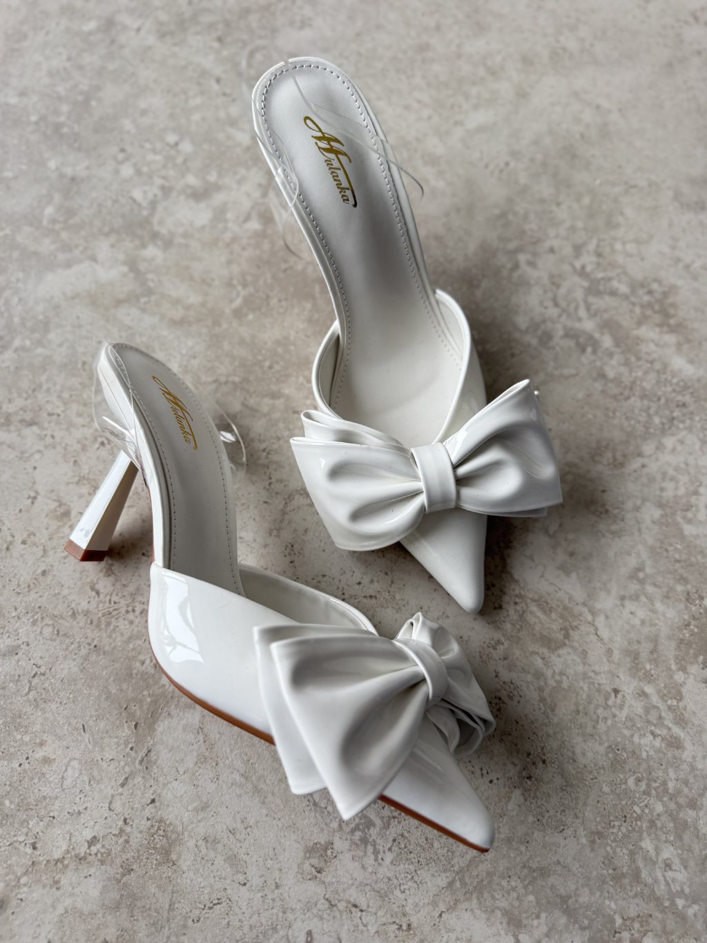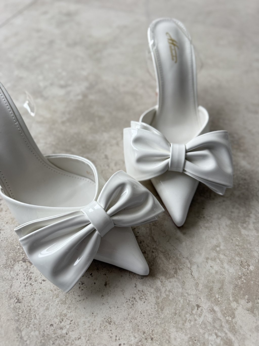 Eleganckie czółenka na obcasie z odkrytą piętą i wyrazistą kokardą z przodu to idealne dopełnienie stylizacji na przyjęcia, wesela i wyjątkowe okazje. Smukły obcas o wysokości 9 cm optycznie wydłuża nogi, nadając sylwetce lekkiego, kobiecego charakteru. Wąski, wydłużony nosek wysmukla stopę, a delikatny pasek z tyłu pomaga utrzymać but stabilnie na nodze. Gładkie, lekko błyszczące wykończenie dodaje im luksusowego wyglądu i sprawia, że stają się mocnym akcentem całej stylizacji.