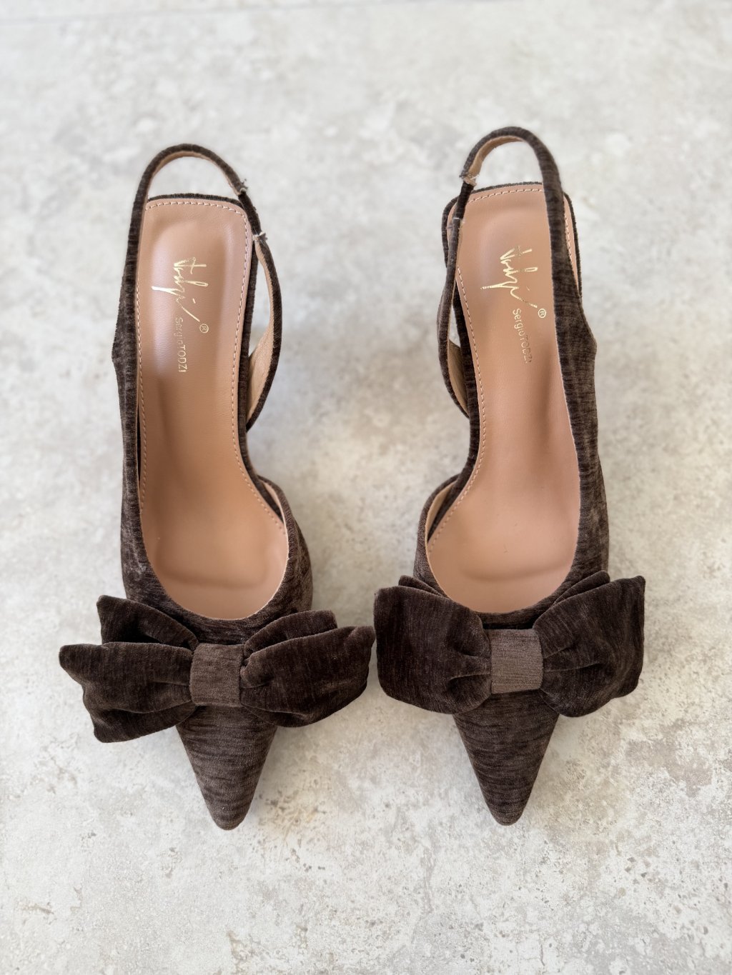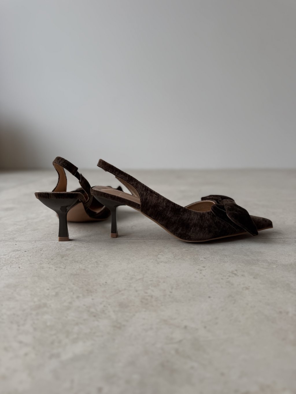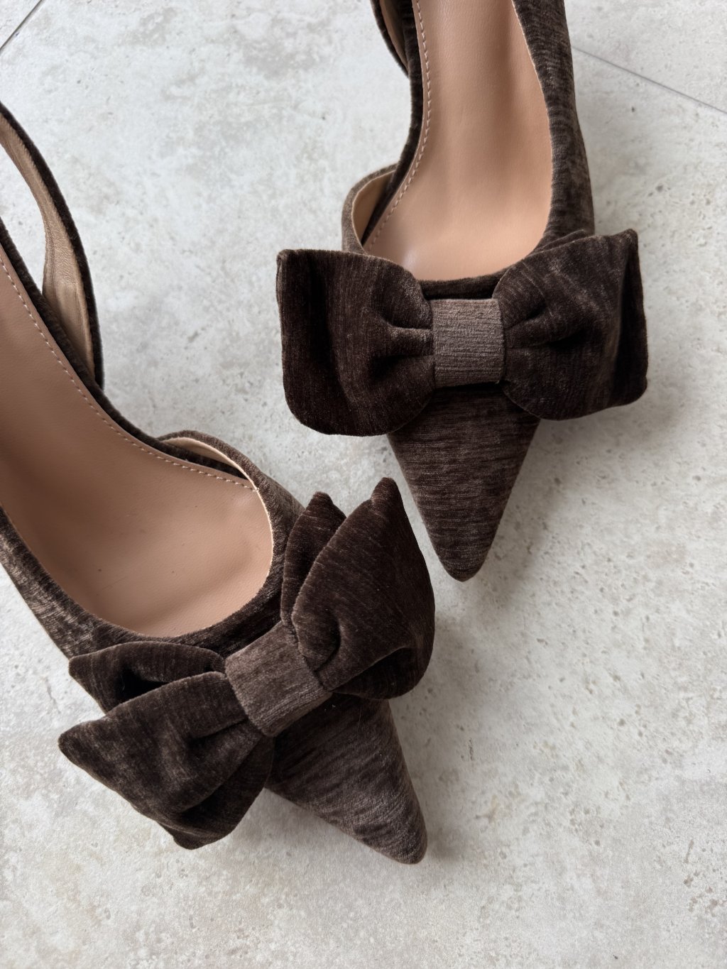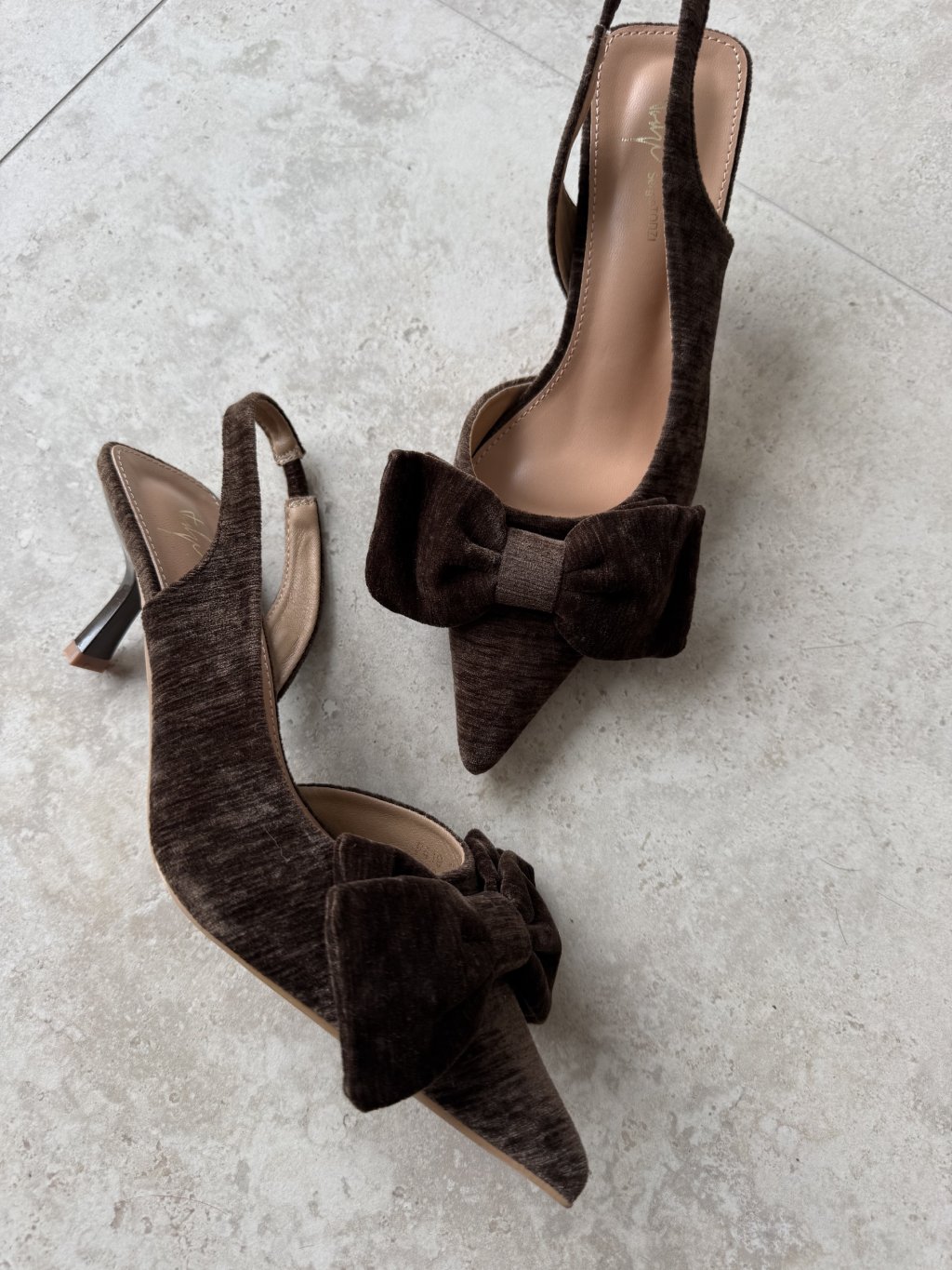 Stylowe czółenka na niższym obcasie, które przyciągają uwagę wyrazistą kokardą umieszczoną na czubku. Odkryta pięta oraz zapięcie wokół kostki zapewniają wygodę nawet podczas dłuższych dni. Dzięki eleganckiemu fasonowi i subtelnym detalom sprawdzą się na uroczystościach, a także jako stylowe uzupełnienie codziennej stylizacji.