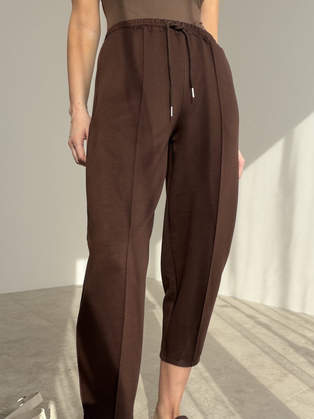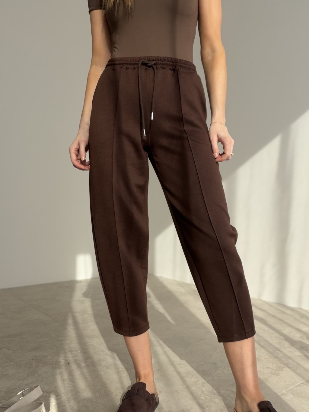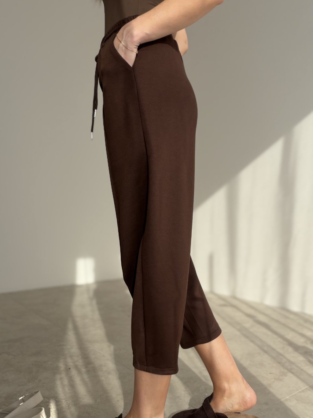 Wygodne spodnie dresowe o czystym, eleganckim wyglądzie to świetny wybór na co dzień i w podróży. Mają elastyczną talię ze sznurkiem do regulacji, dzięki czemu dobrze dopasowują się do sylwetki i trzymają się na miejscu. Krój jest luźniejszy, ale dzięki dopracowanym liniom prezentuje się schludnie i nowocześnie. Długość przed kostkę oraz lekko zwężane nogawki ładnie układają sylwetkę i pasują zarówno do sneakersów, jak i miejskiego obuwia.