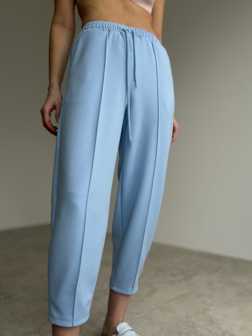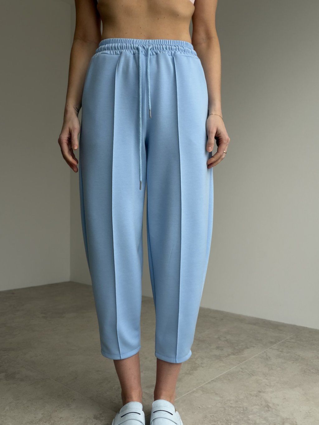 Wygodne spodnie dresowe o czystym, eleganckim wyglądzie to świetny wybór na co dzień i w podróży. Mają elastyczną talię ze sznurkiem do regulacji, dzięki czemu dobrze dopasowują się do sylwetki i trzymają się na miejscu. Krój jest luźniejszy, ale dzięki dopracowanym liniom prezentuje się schludnie i nowocześnie. Długość przed kostkę oraz lekko zwężane nogawki ładnie układają sylwetkę i pasują zarówno do sneakersów, jak i miejskiego obuwia.