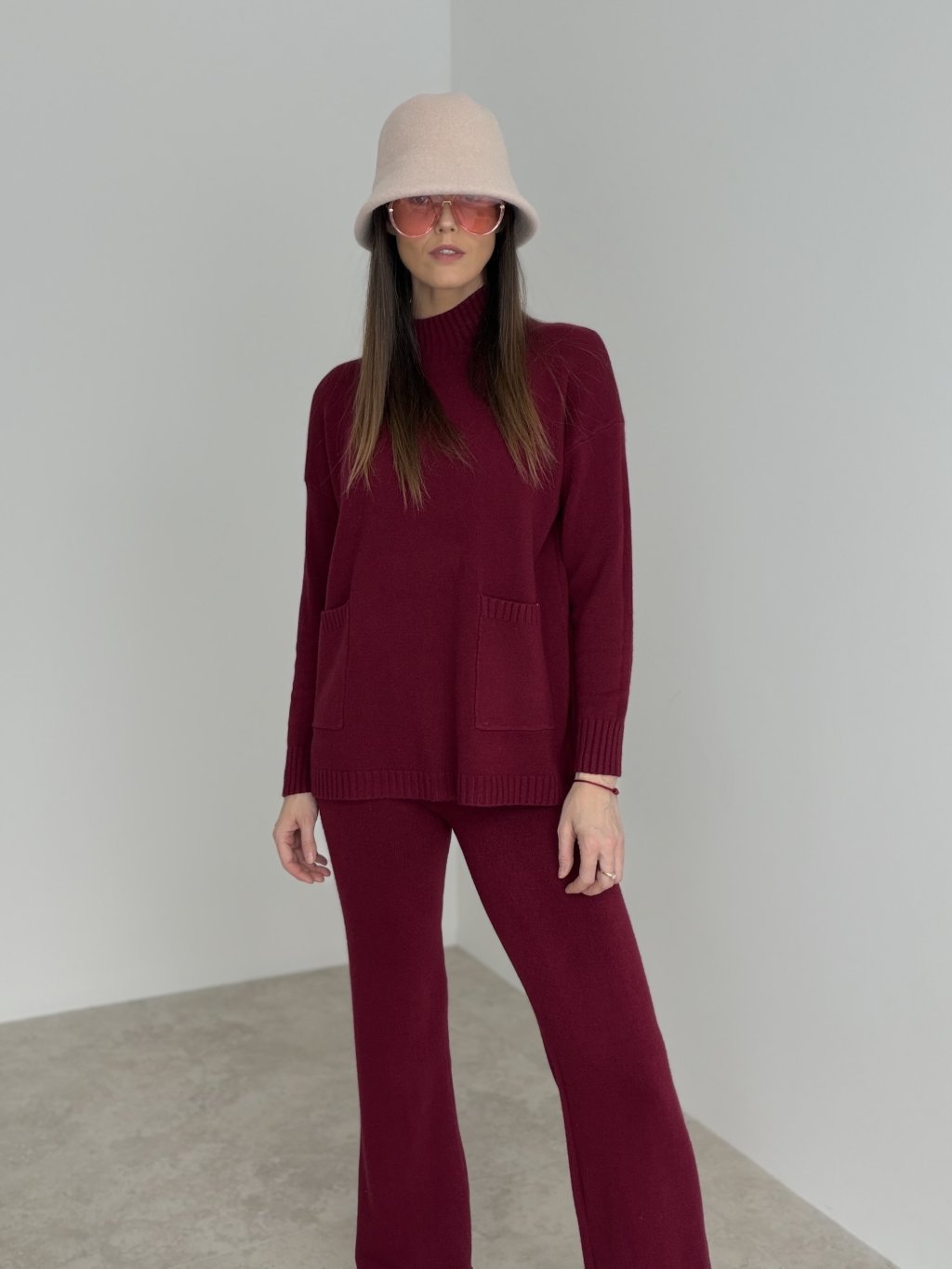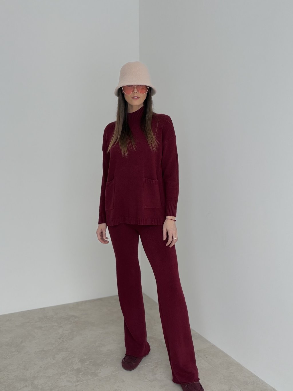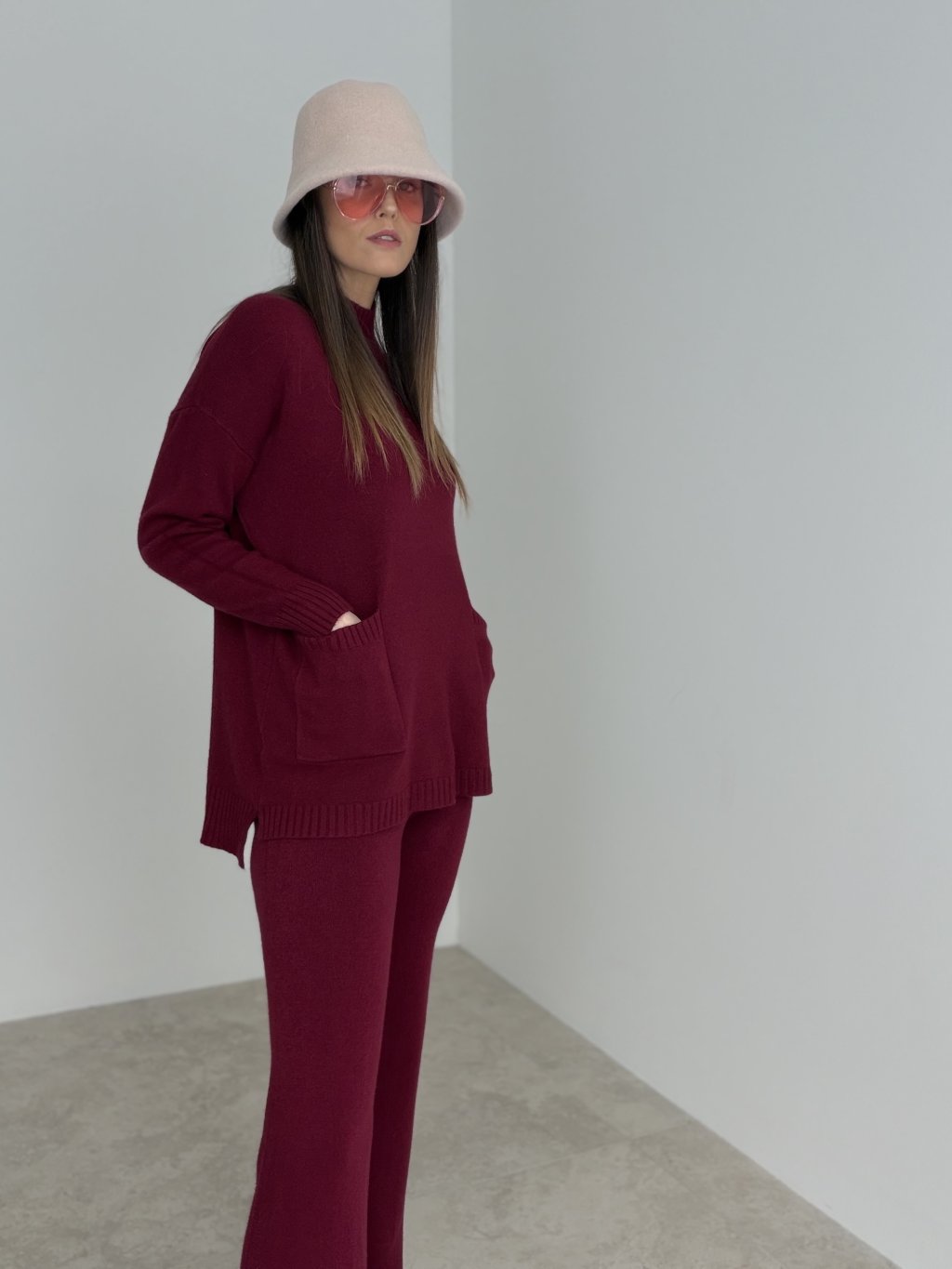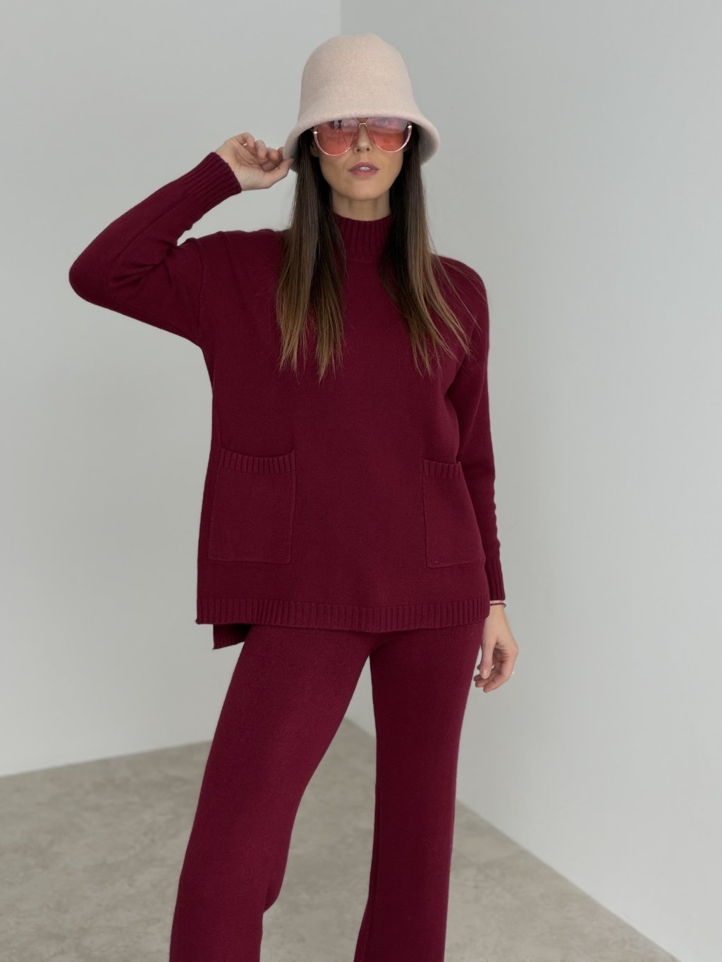 Dwuczęściowy komplet z dzianiny, który łączy wygodę z dopracowanym wyglądem. Góra ma luźniejszy krój, długie rękawy i klasyczny okrągły dekolt, dzięki czemu jest ponadczasowa i świetnie sprawdzi się także osobno. Spodnie mają wygodną, elastyczną talię oraz lekko rozszerzane nogawki, które optycznie wydłużają sylwetkę i dodają elegancji nawet w codziennym wydaniu. Materiał jest przyjemny dla skóry, a komplet idealnie pasuje na miasto, podróże, do pracy w luźniejszym dress codzie oraz na domowe stylizacje. Oba elementy możesz nosić oddzielnie, tworząc więcej zestawów z jednej bazy.