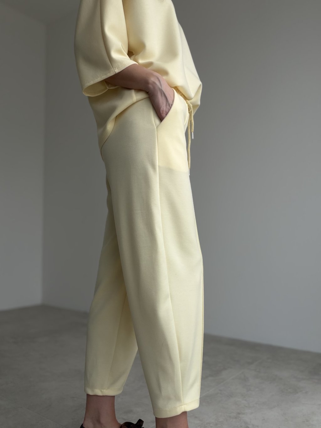 Dwuczęściowy komplet z miękkiej dzianiny: luźna góra i spodnie z elastycznym pasem oraz sznurkiem. Wygodny krój z kieszeniami, idealny na co dzień.