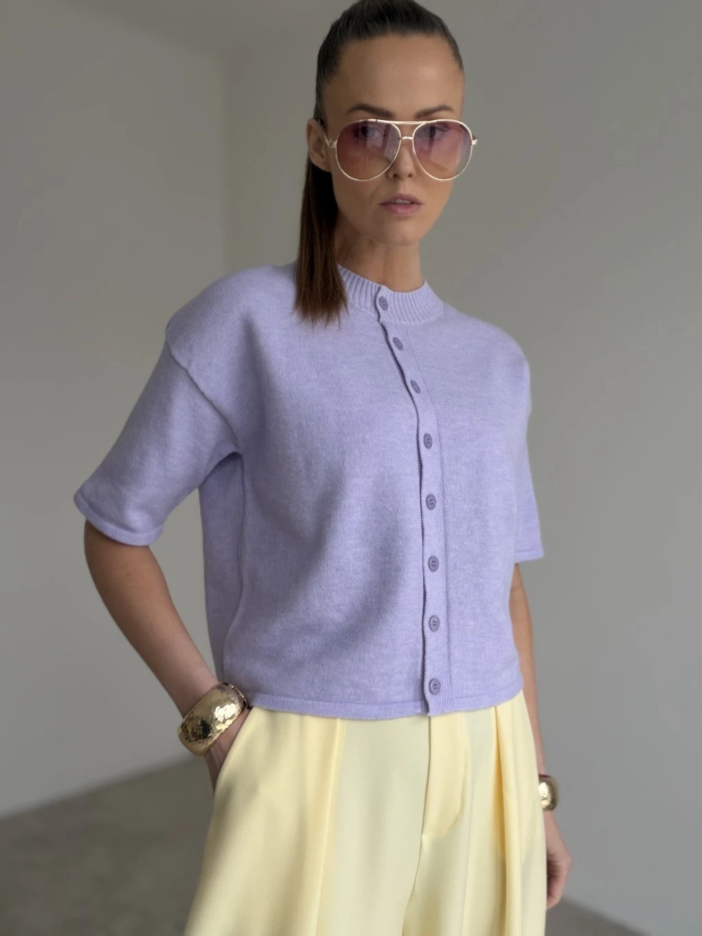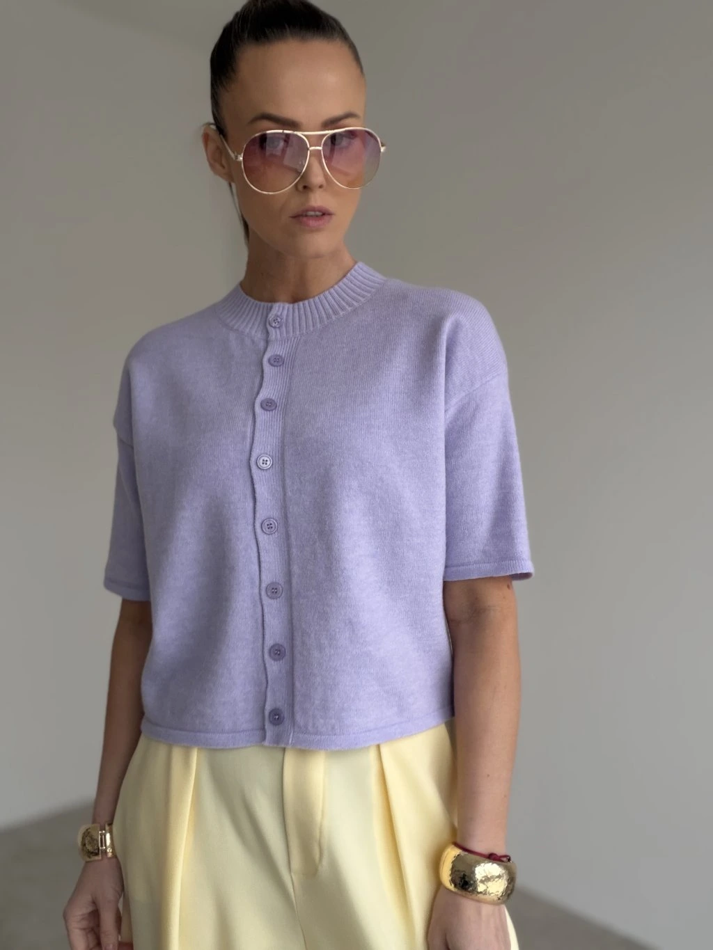 Ten dwustronny sweter na guziki prezentuje się delikatnie, elegancko i bardzo praktycznie. Minimalistyczny fason z krótkim rękawem i czystą linią tworzy ponadczasowy model, który łatwo stylizować, a jednocześnie daje wiele możliwości noszenia. Guziki są w pełni rozpinane, dzięki czemu sweter możesz nosić klasycznie zapięty, lekko rozpięty lub odwrócony odwrotnie – w zależności od efektu, jaki chcesz uzyskać.