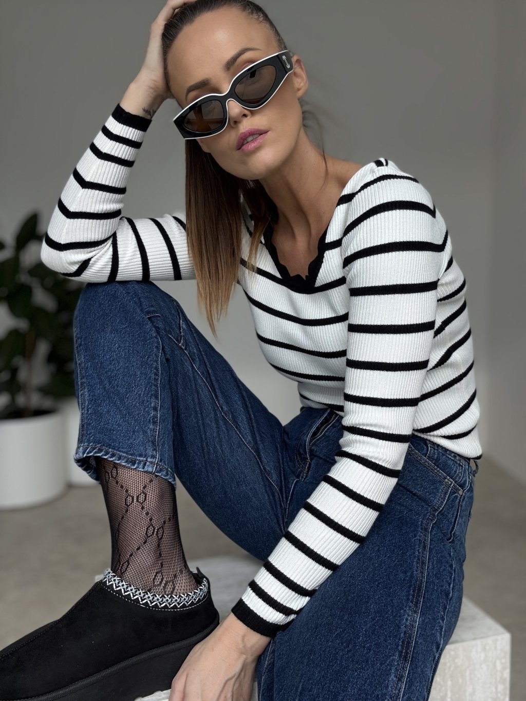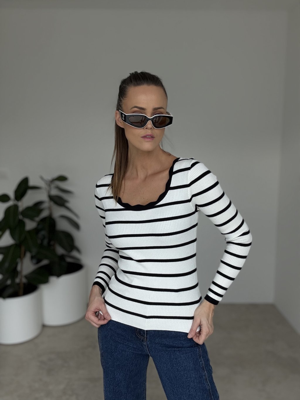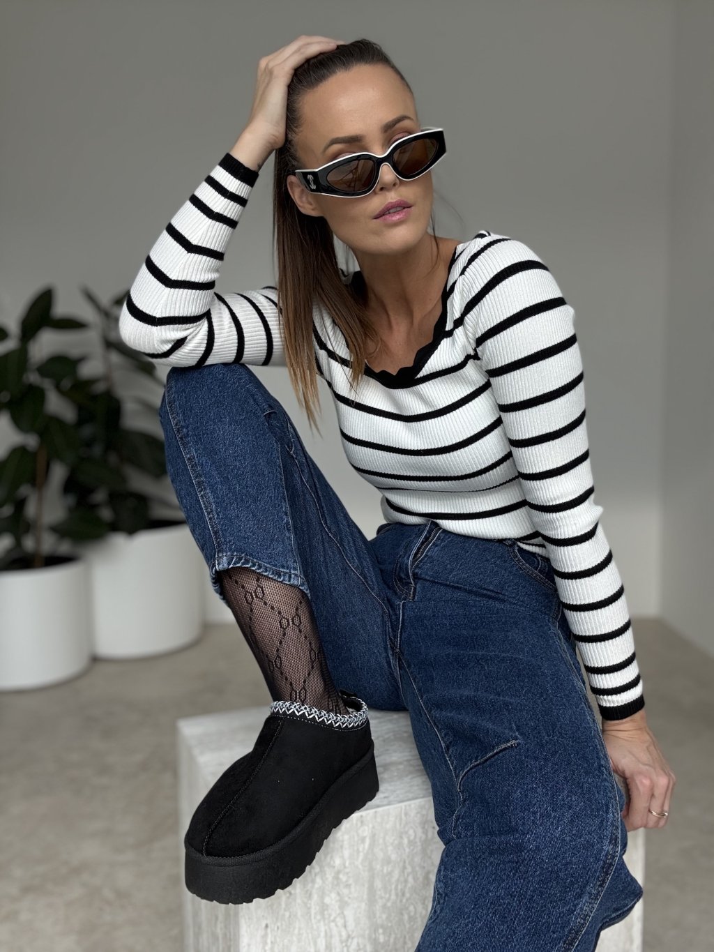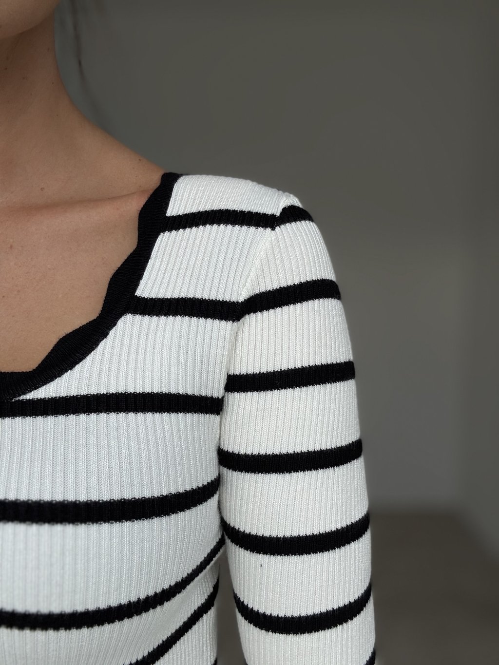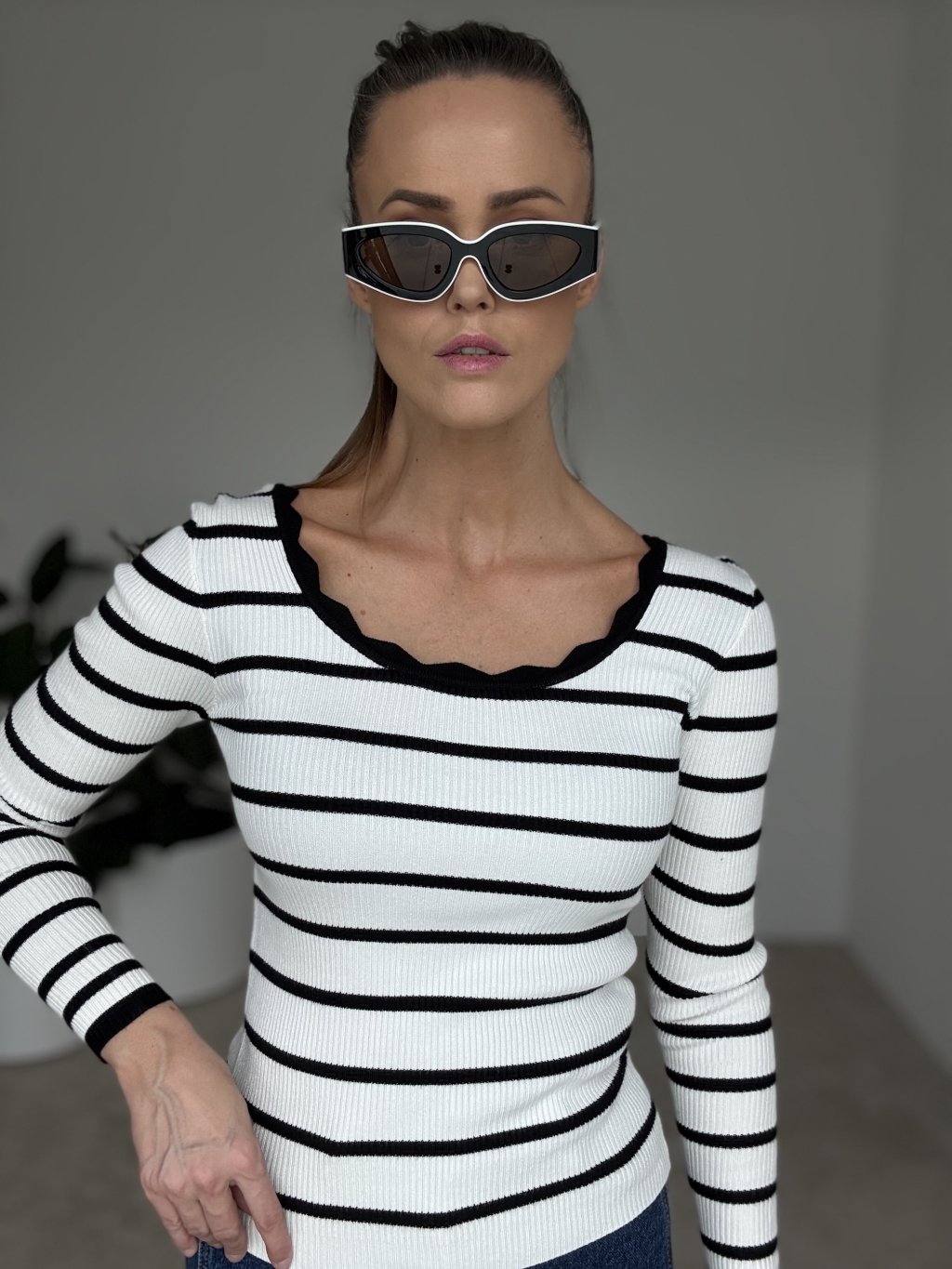 Dzianinowy, prążkowany top z delikatnie falowanym dekoltem podkreśla sylwetkę i wygodnie przylega do ciała. Miękka, elastyczna przędza dobrze trzyma kształt, a długie rękawy i pasiasty wzór nadają mu ponadczasowy charakter. Łatwo łączy się z dżinsami, eleganckimi spodniami lub spódnicą; świetny do warstwowania pod marynarkę czy kardigan. Pielęgnacja: delikatne pranie, suszyć na płasko.