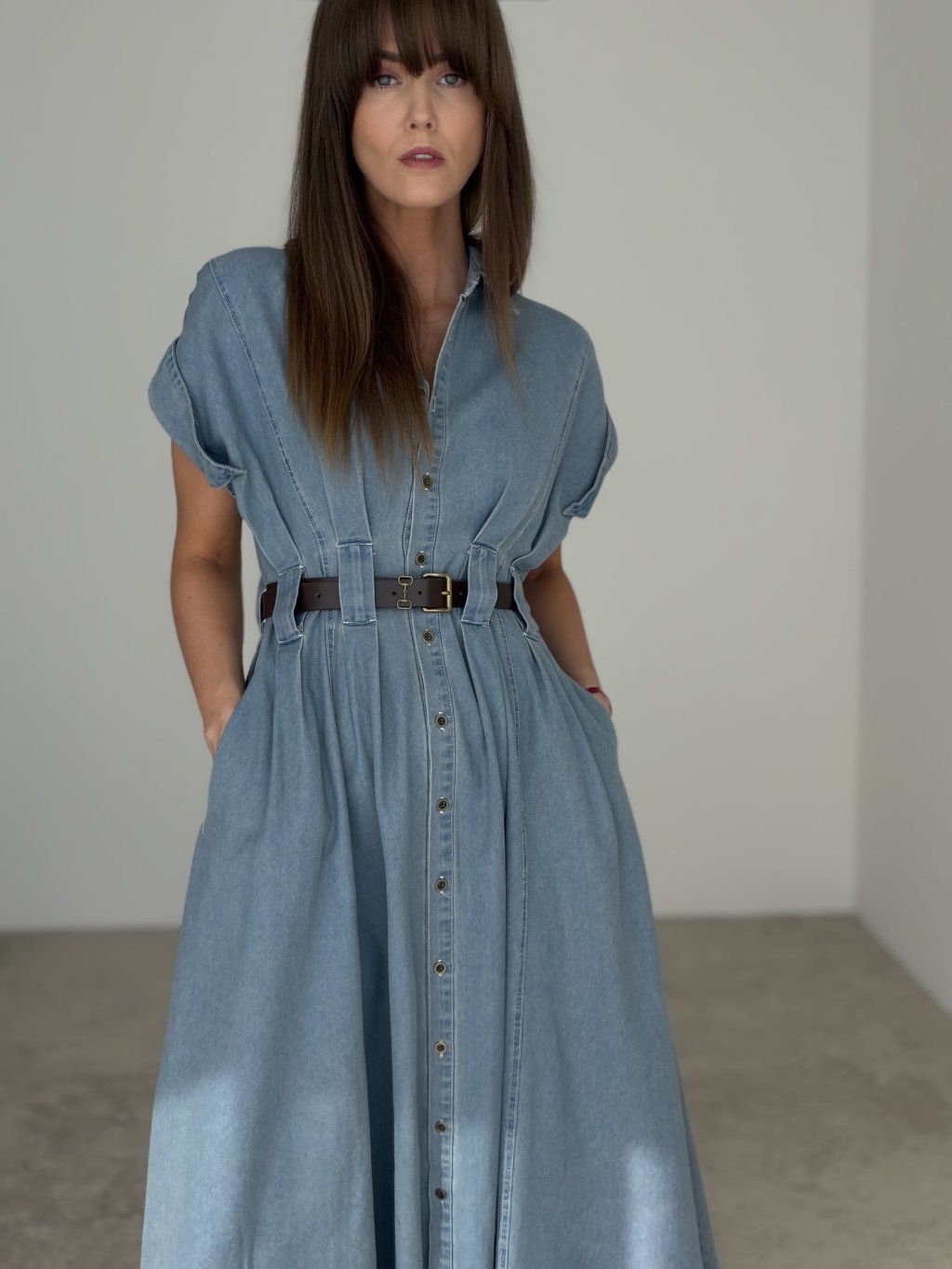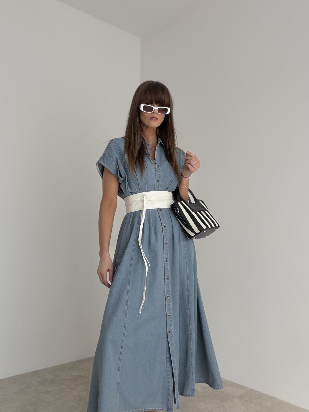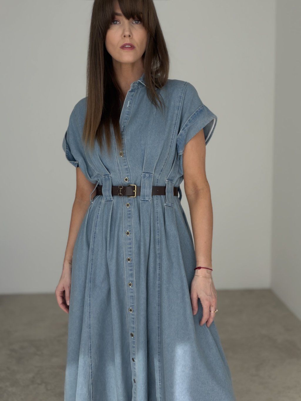 Dżinsowa sukienka maxi o długim, lekko płynącym kroju i z paskiem pięknie podkreśla sylwetkę oraz nadaje stylizacji kobiecy, nowoczesny charakter. To wygodny i ponadczasowy model na co dzień i na bardziej dopracowane okazje.