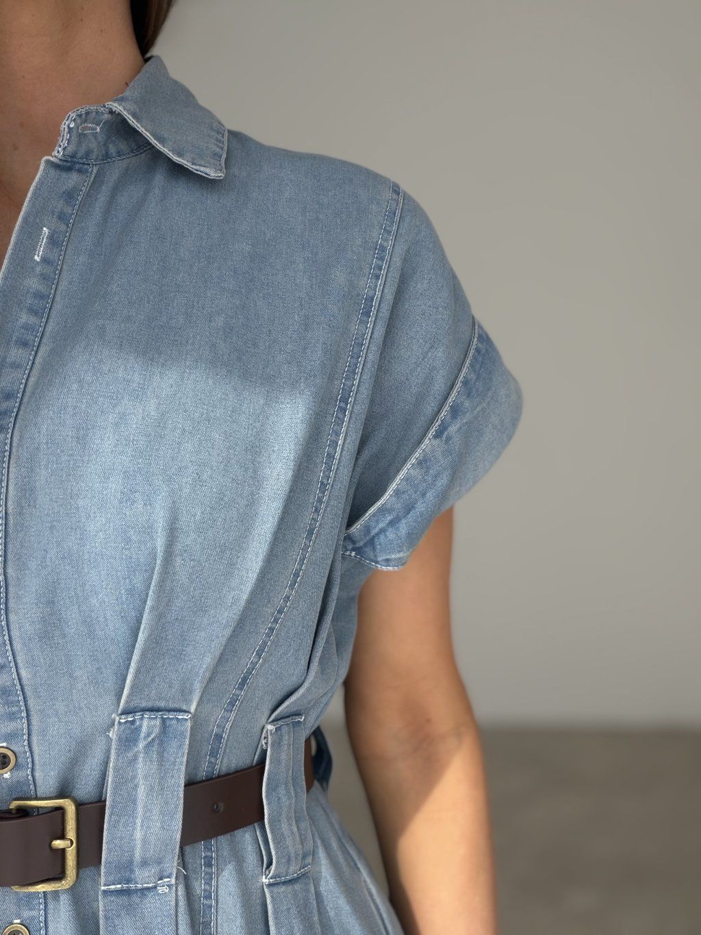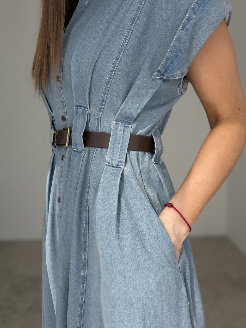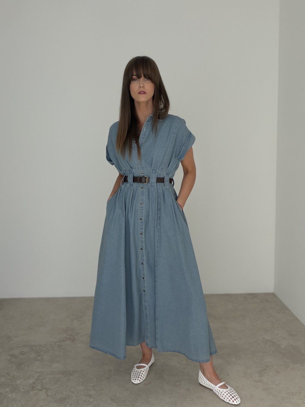 Dżinsowa sukienka maxi o długim, lekko płynącym kroju i z paskiem pięknie podkreśla sylwetkę oraz nadaje stylizacji kobiecy, nowoczesny charakter. To wygodny i ponadczasowy model na co dzień i na bardziej dopracowane okazje.