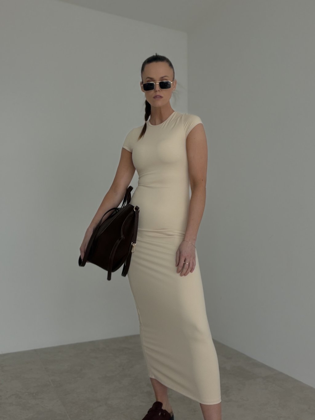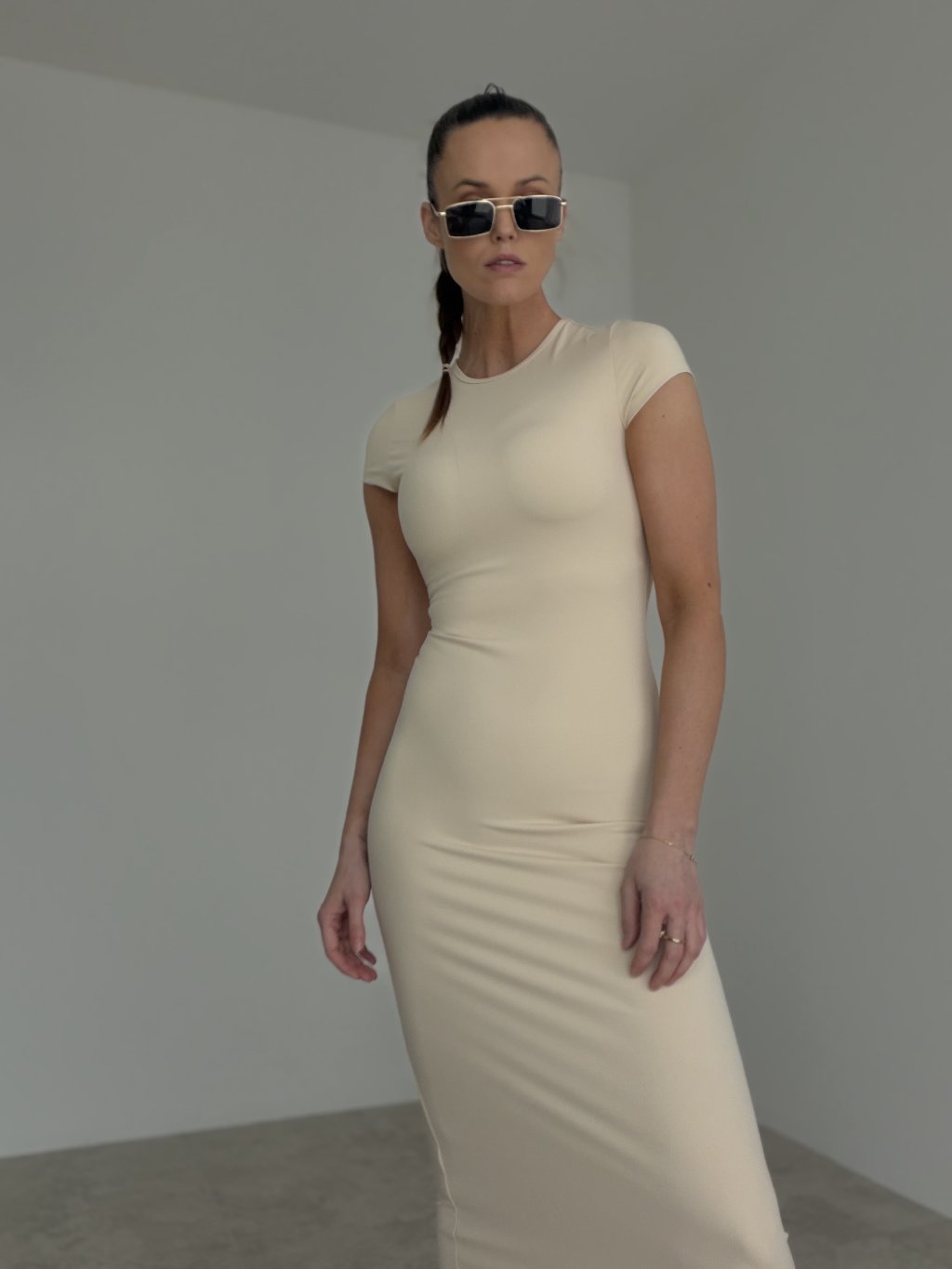 Elastyczna sukienka o minimalistycznym kroju, z okrągłym dekoltem i krótkim rękawem. Dopasowany model o długości za kolano.