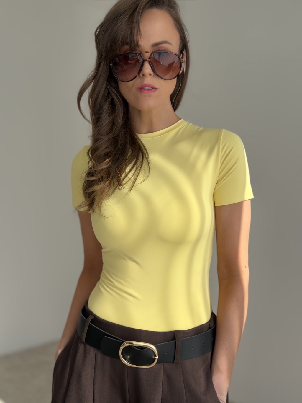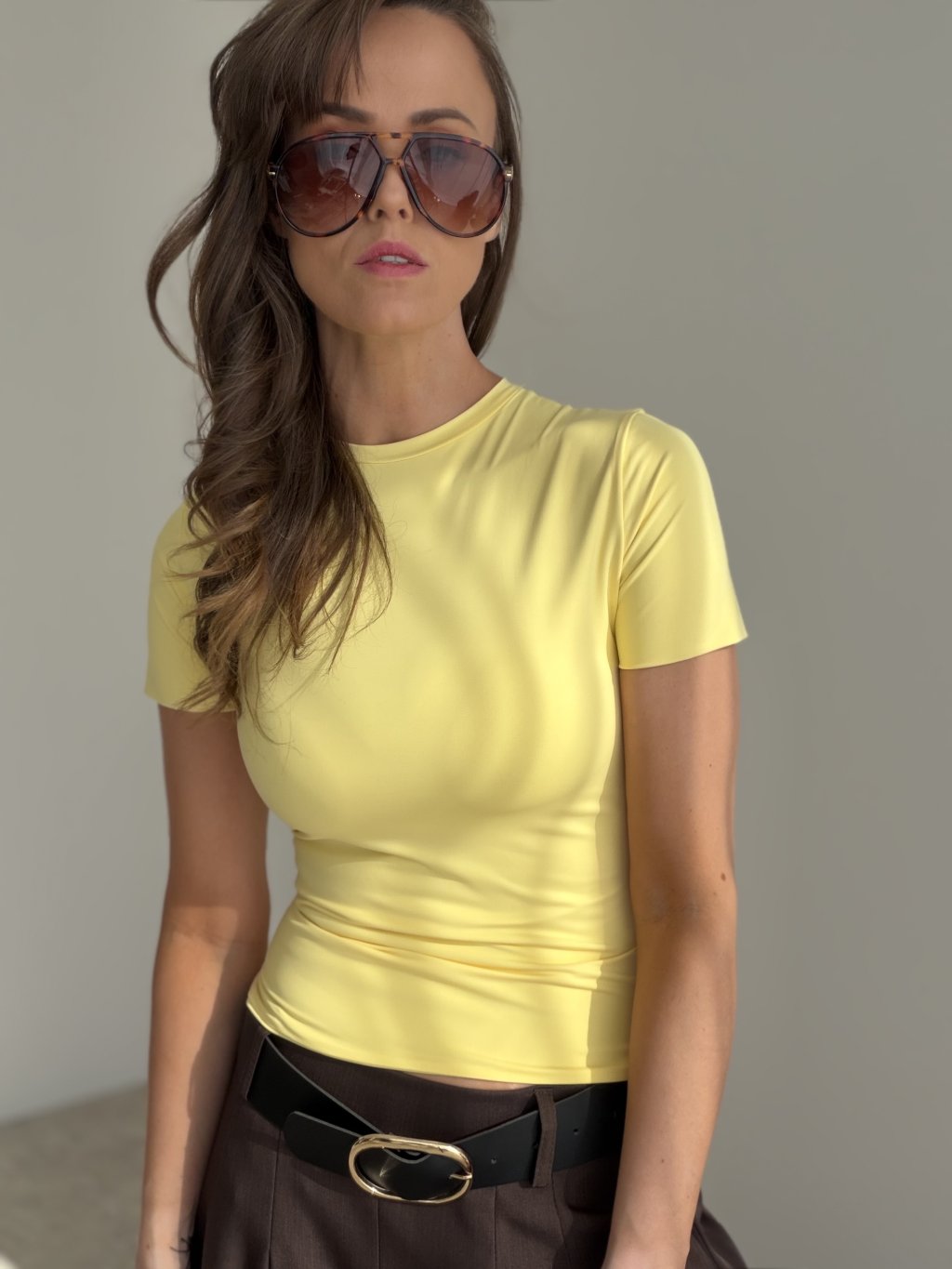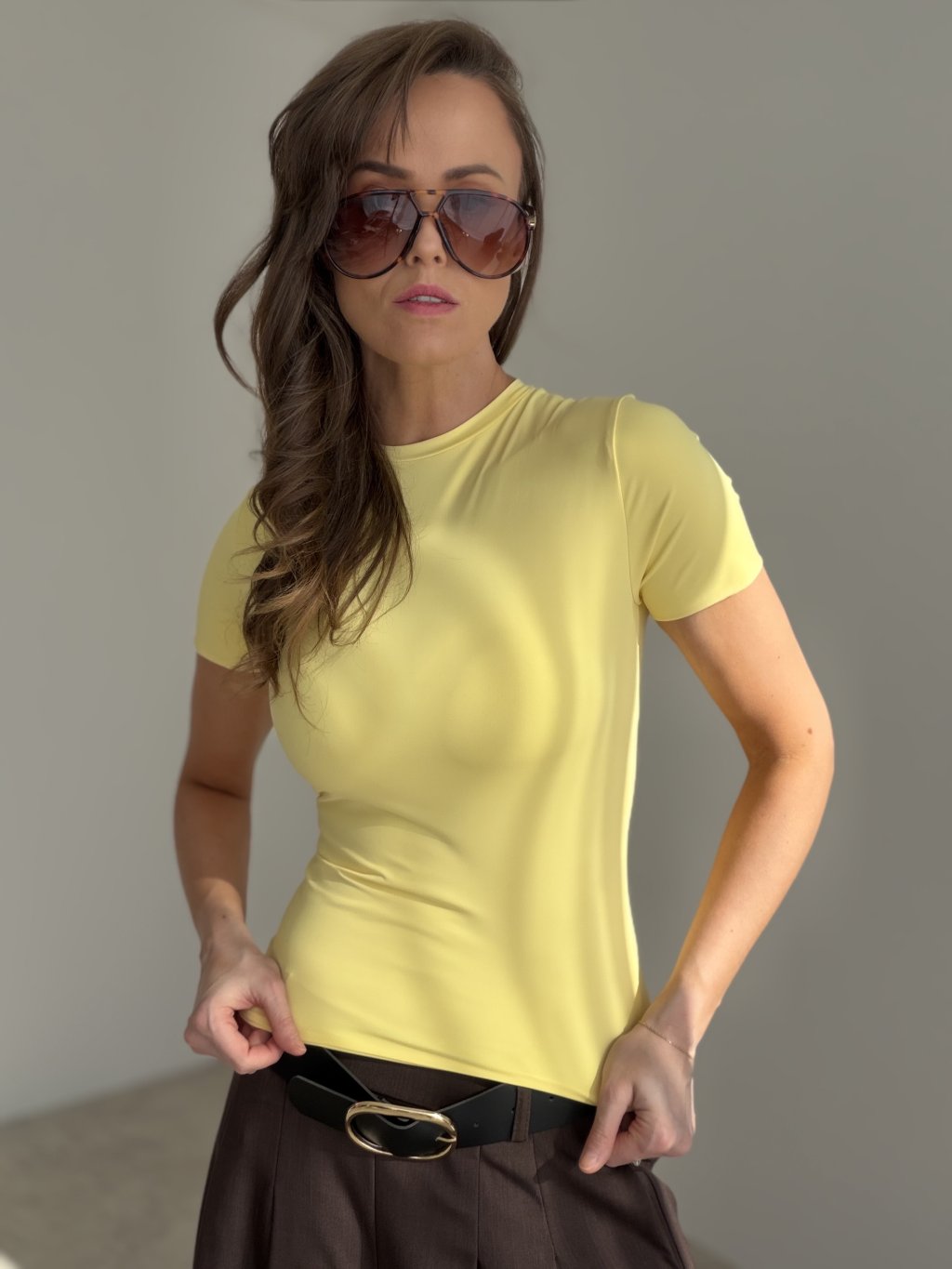 Elastyczny top z krótkim rękawem i dopasowanym krojem, który podkreśla kobiecą sylwetkę. Gładki materiał przyjemny w dotyku dopasowuje się do ciała i zapewnia maksymalny komfort przez cały dzień. Prosty, minimalistyczny fason z okrągłym dekoltem łatwo połączyć zarówno z eleganckim, jak i codziennym stylem. Klasyczny element każdej garderoby.