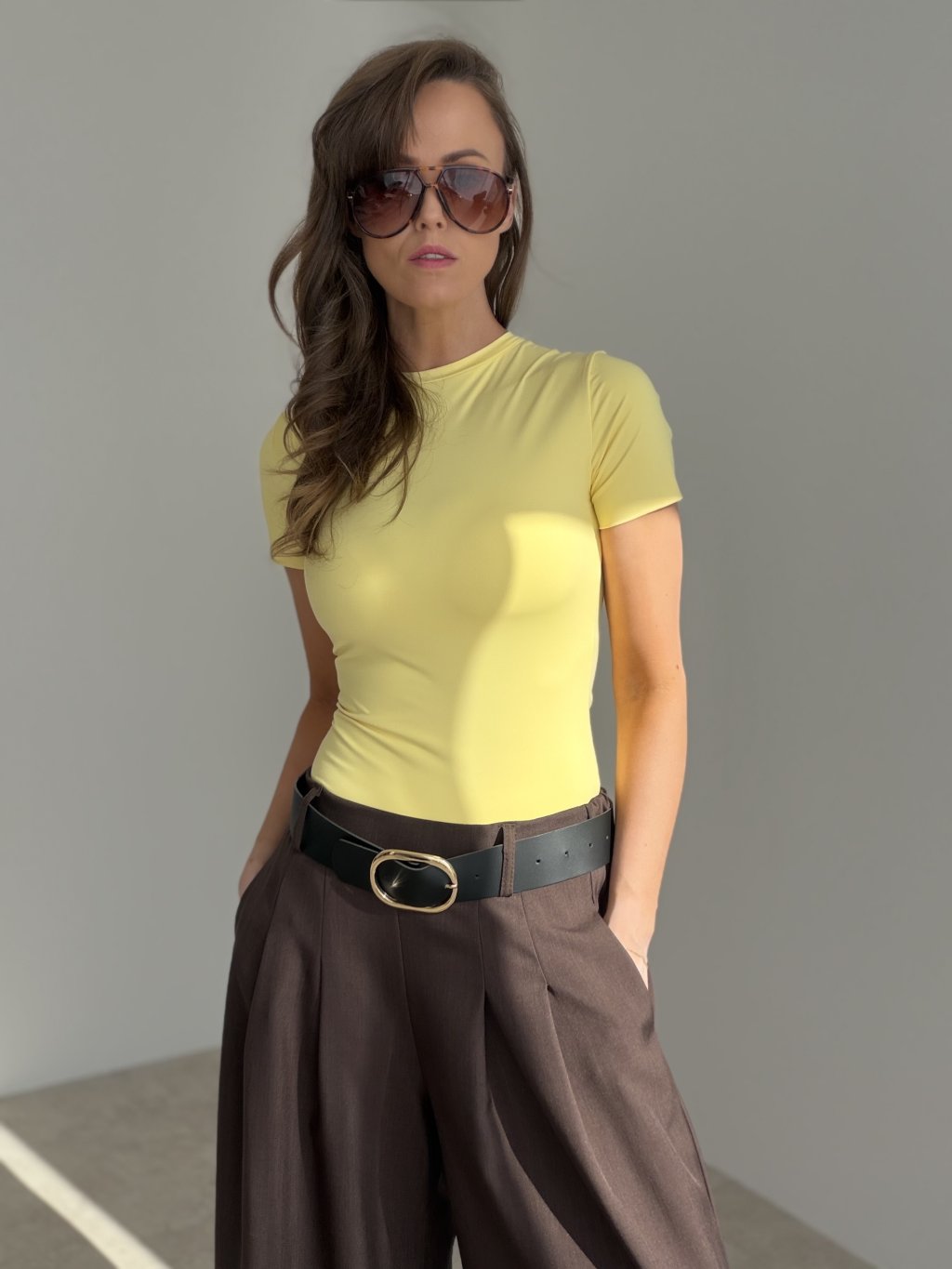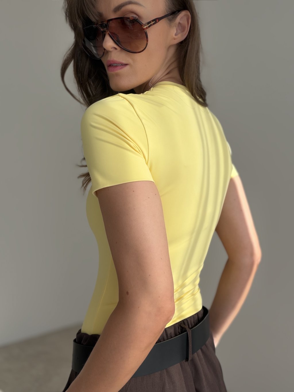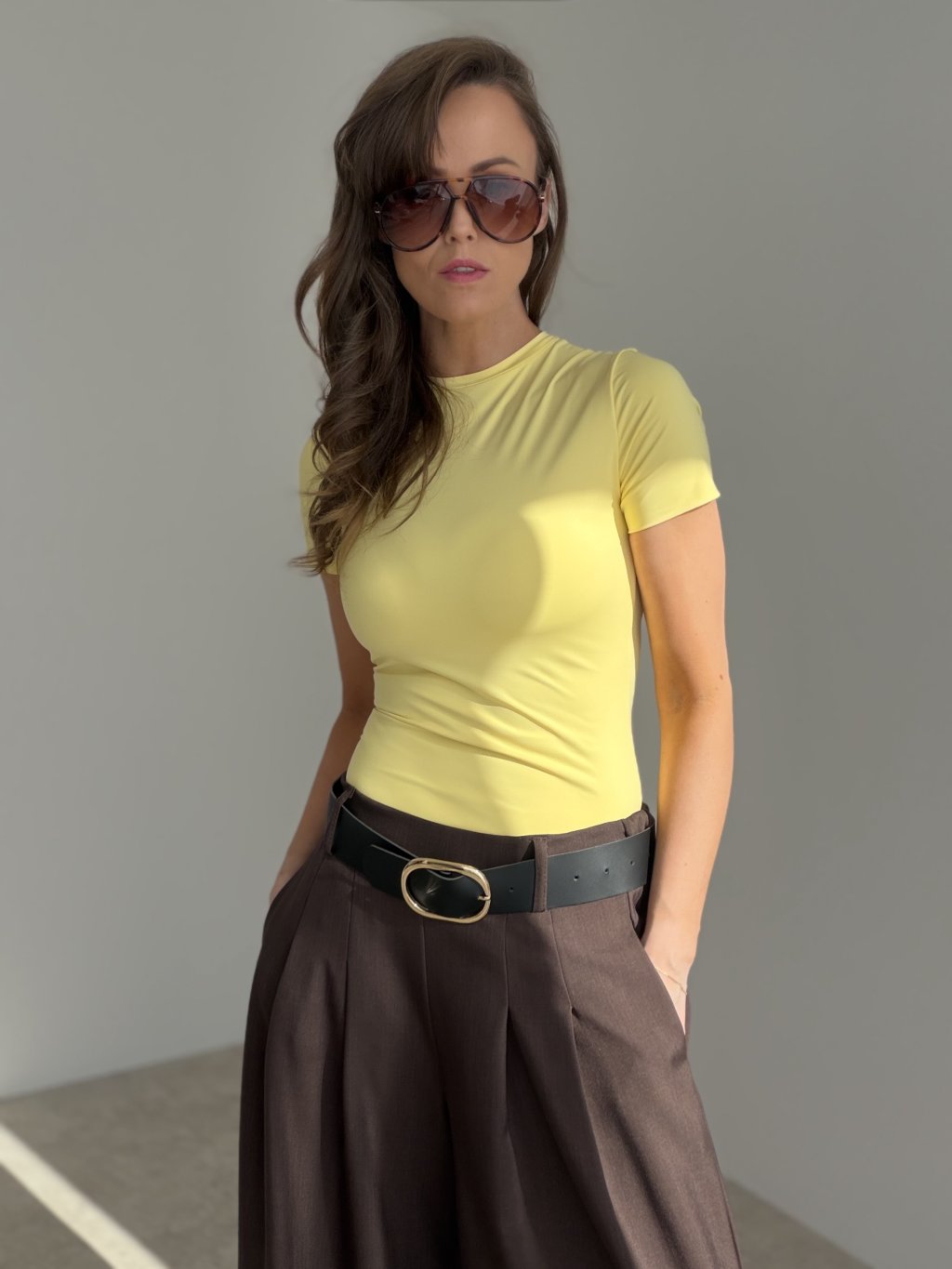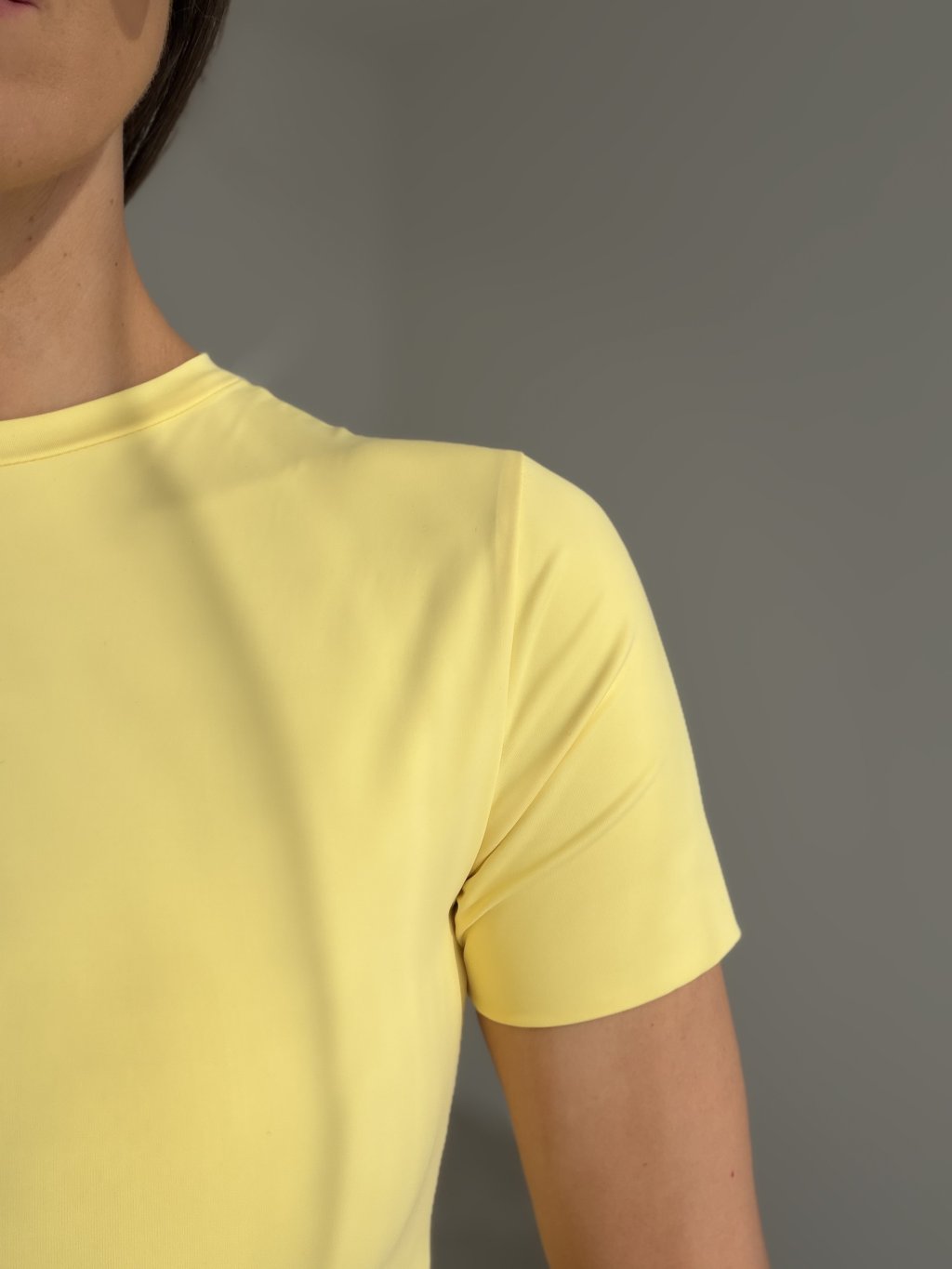Elastyczny top z krótkim rękawem i dopasowanym krojem, który podkreśla kobiecą sylwetkę. Gładki materiał przyjemny w dotyku dopasowuje się do ciała i zapewnia maksymalny komfort przez cały dzień. Prosty, minimalistyczny fason z okrągłym dekoltem łatwo połączyć zarówno z eleganckim, jak i codziennym stylem. Klasyczny element każdej garderoby.