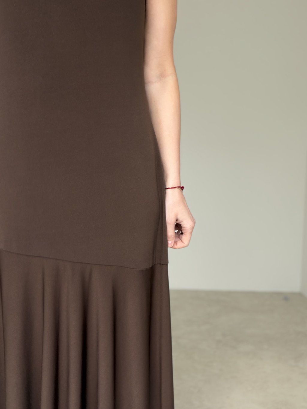 Ta sukienka prezentuje się bardzo kobieco, elegancko i subtelnie nowocześnie. Ma pięknie lejący fason, który naturalnie układa się w ruchu i tworzy lekki, wysmakowany efekt. Górna część jest utrzymana w czystej, minimalistycznej linii, natomiast dół dodaje całości szlachetności i bardziej wyrazistego charakteru. To idealny wybór na bardziej uroczyste okazje, przyjęcia, kolacje, rodzinne wydarzenia oraz wszędzie tam, gdzie chcesz wyglądać stylowo, delikatnie i z klasą.