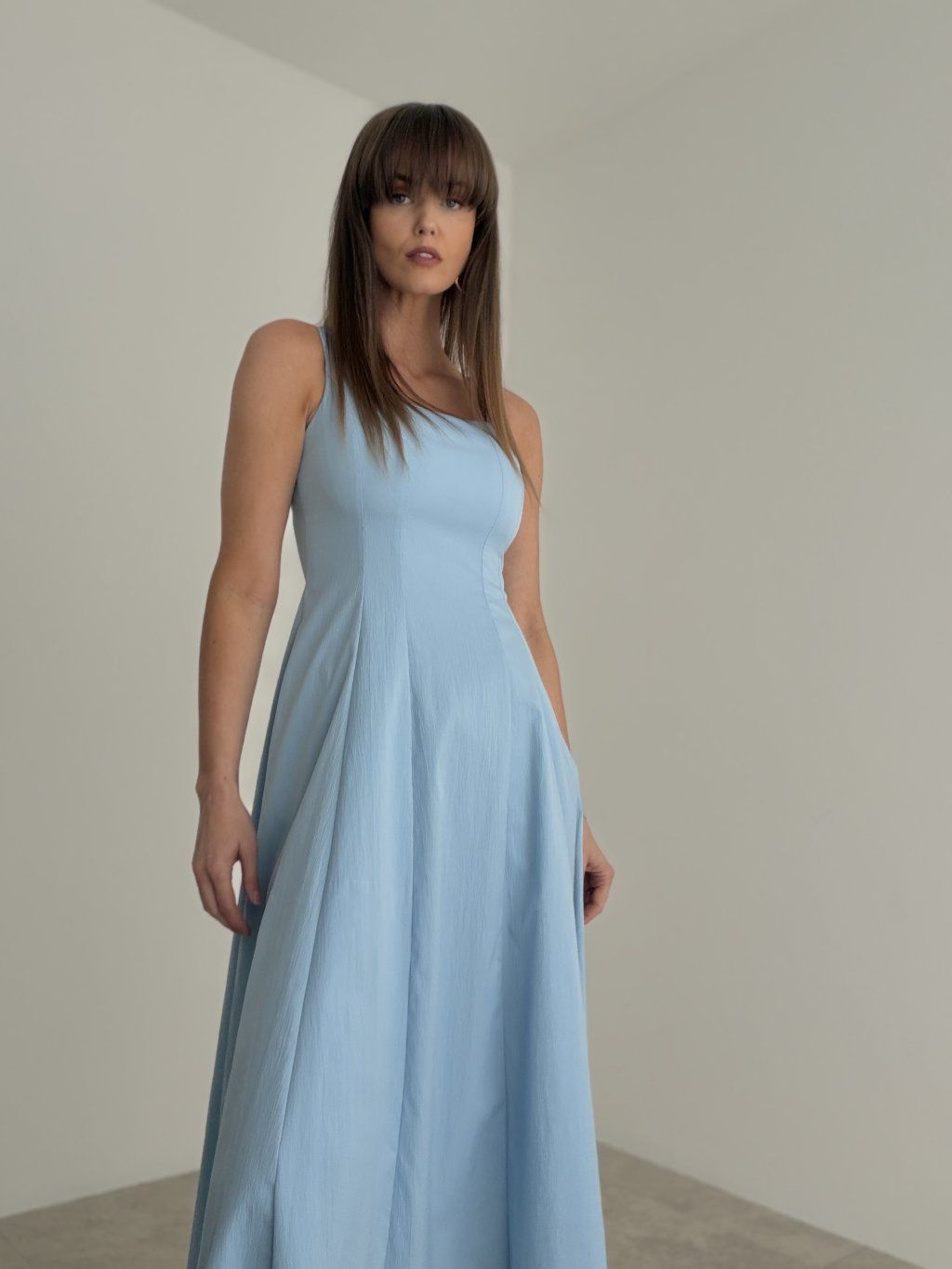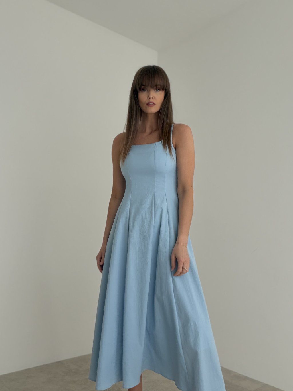 Elegancka sukienka midi z dopasowaną górą, cienkimi ramiączkami i rozkloszowanym dołem. Ponadczasowy, kobiecy fason sprawia, że jest to idealny wybór na wesela, uroczystości i inne wyjątkowe okazje.