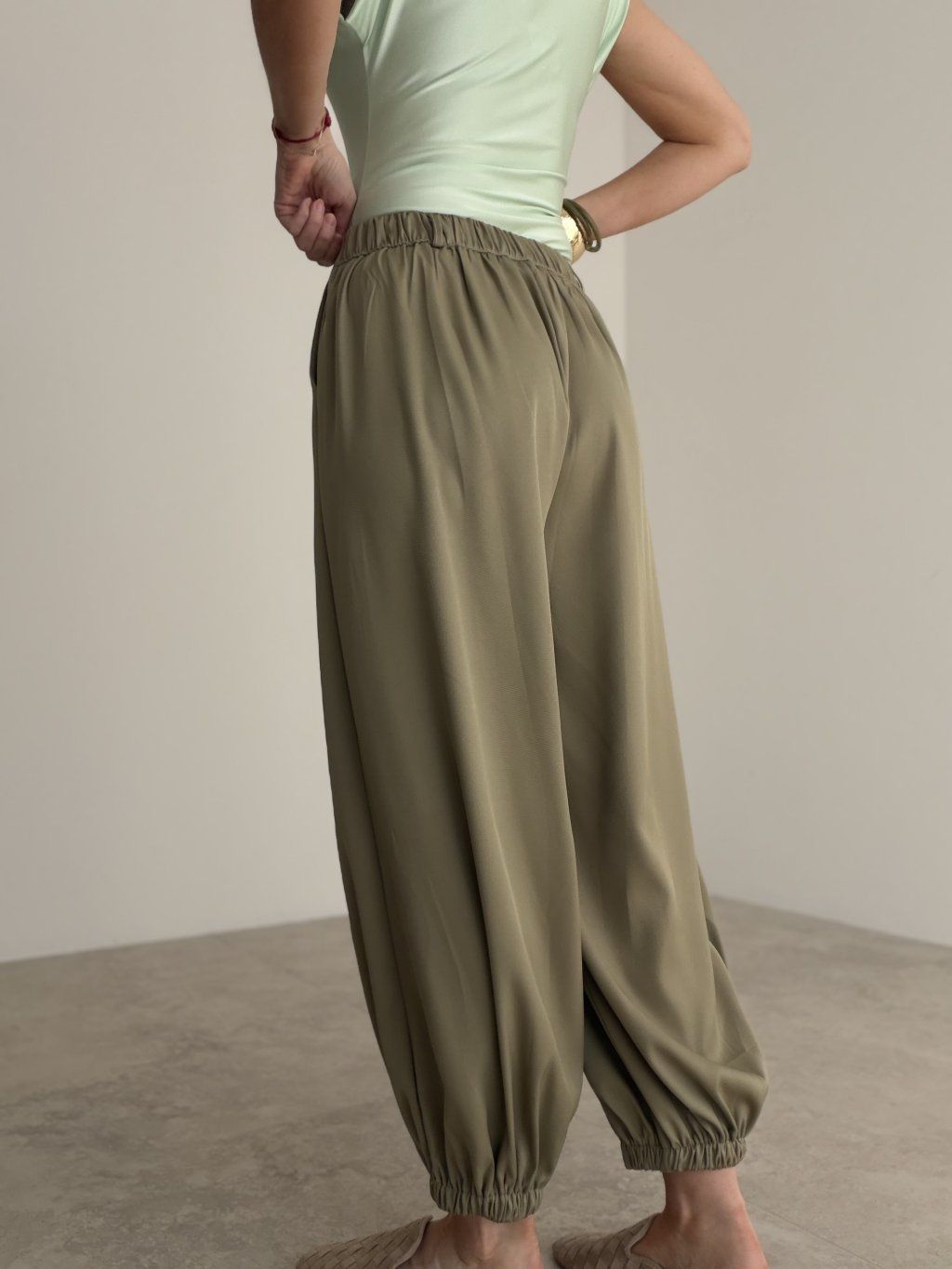 Eleganckie spodnie zachwycają lekkim krojem, wygodą noszenia oraz bardzo kobiecym, dopracowanym wyglądem. Mają luźniejszą sylwetkę, która pięknie układa się w ruchu, a delikatnie połyskujący efekt nadaje im nowoczesny i bardziej szlachetny charakter. Przód prezentuje się czysto i elegancko, natomiast elastyczna tylna część pasa zapewnia większy komfort podczas noszenia.