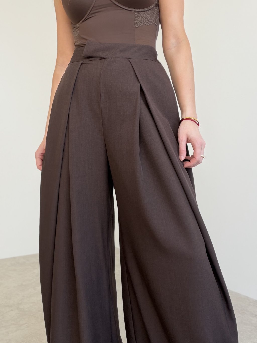 Spodnie wide z wysokim stanem i zakładkami z przodu, które tworzą elegancką sylwetkę. Szeroka nogawka układa się lekko i pasuje zarówno na co dzień, jak i na bardziej formalne wyjścia.