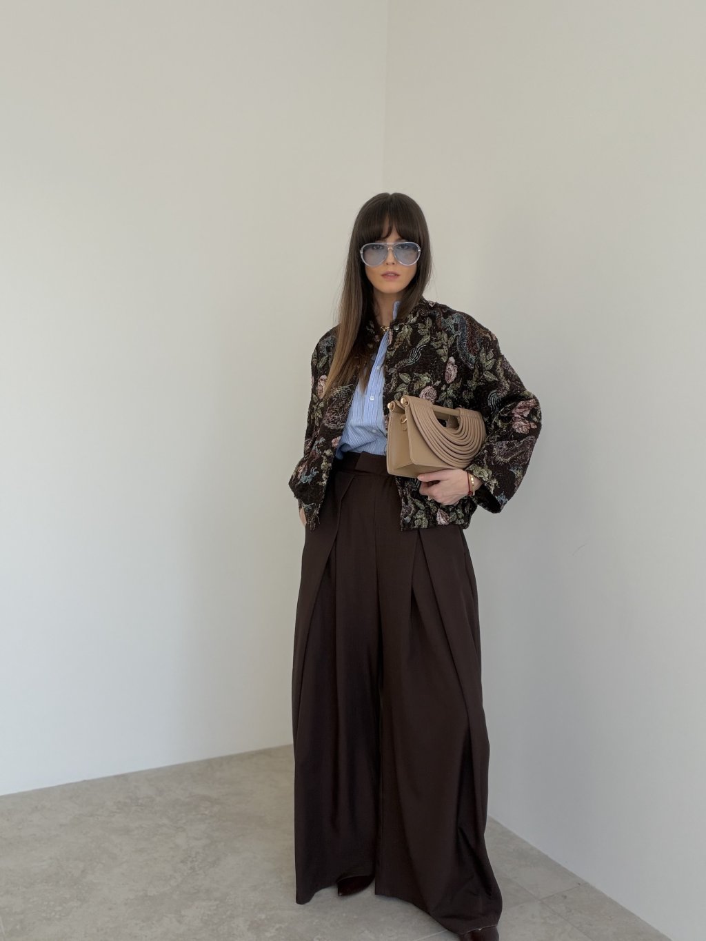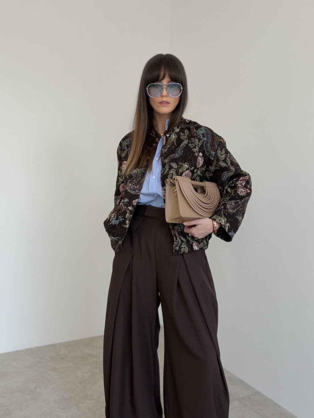 Na elegancko dopełnij stylizację marynarką lub płaszczem o prostych liniach.