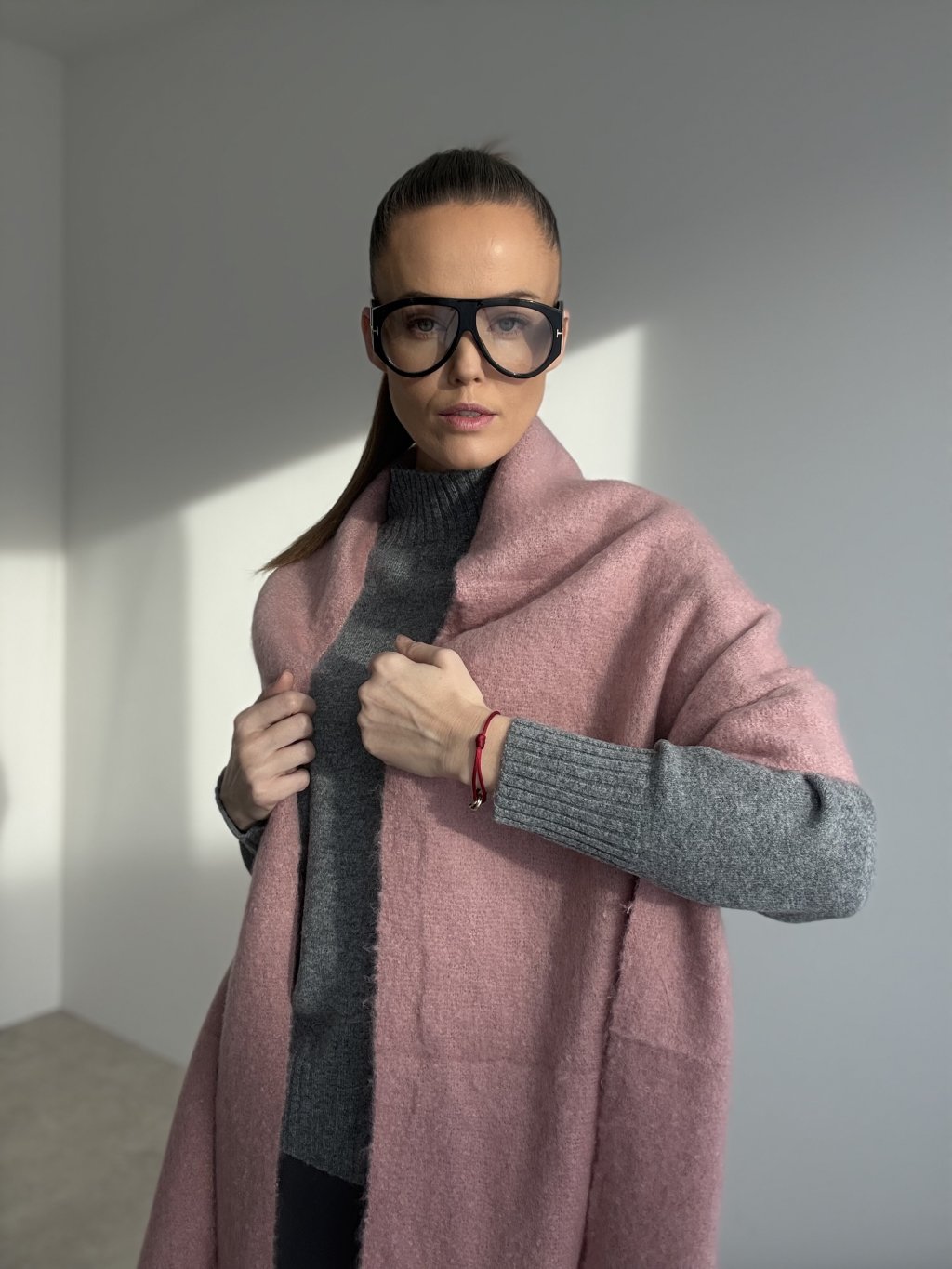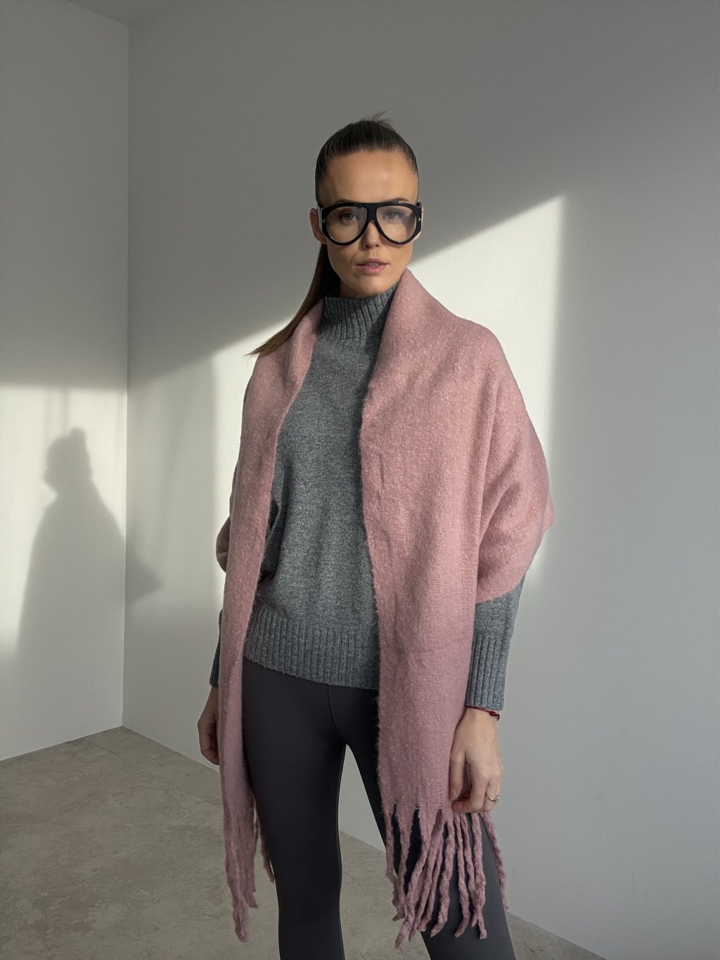 Przytulny, grubszy szal, który skutecznie ogrzewa w chłodne dni i jednocześnie dodaje stylizacji modnego charakteru. Jest miękki w dotyku, ładnie się układa, a dzięki większej szerokości można nosić go nie tylko klasycznie na szyi, ale też zarzucony na ramiona jak narzutkę. Dekoracyjne frędzle na końcach nadają mu nowoczesnego, swobodnego wyglądu. Doskonale komponuje się z płaszczem, kurtką lub ulubionym swetrem i sprawdzi się w mieście, na spacerach oraz w podróży.