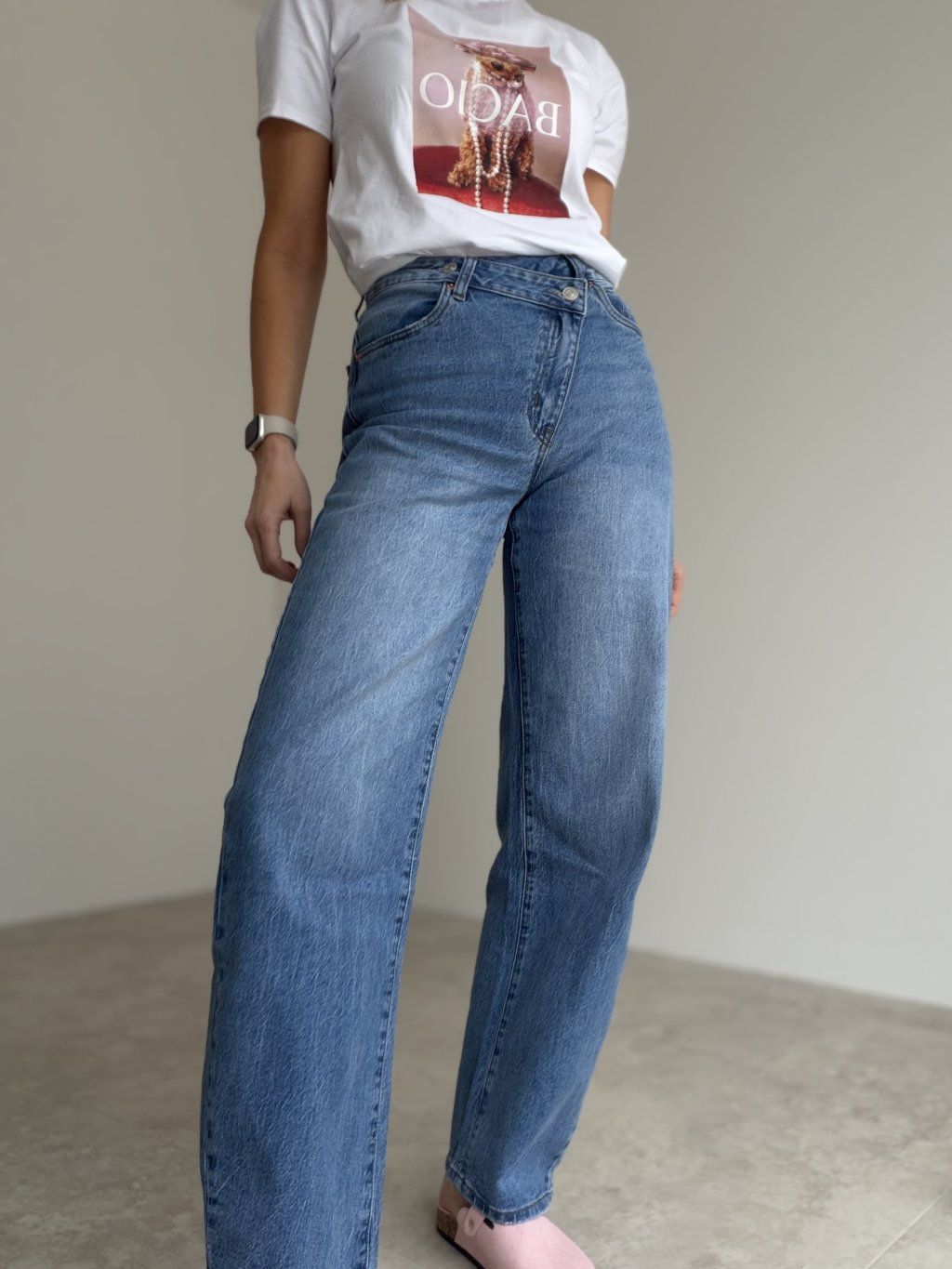 Dżinsy z wysokim stanem, prostszą szerszą nogawką i efektownym detalem zapięcia. Wygodne, stylowe i łatwe do stylizacji.