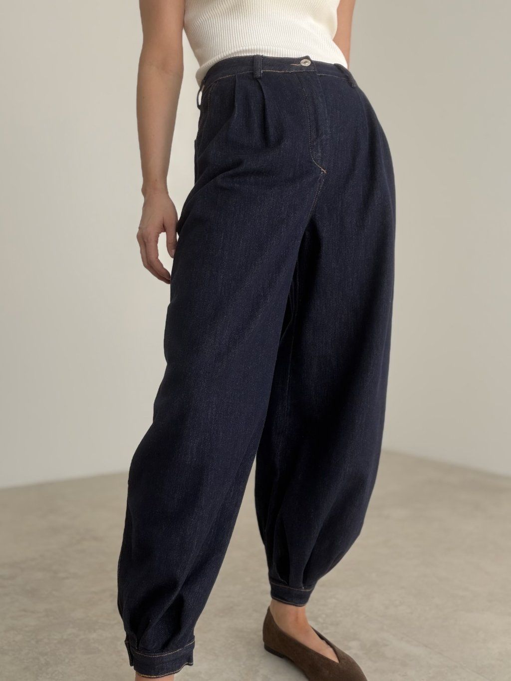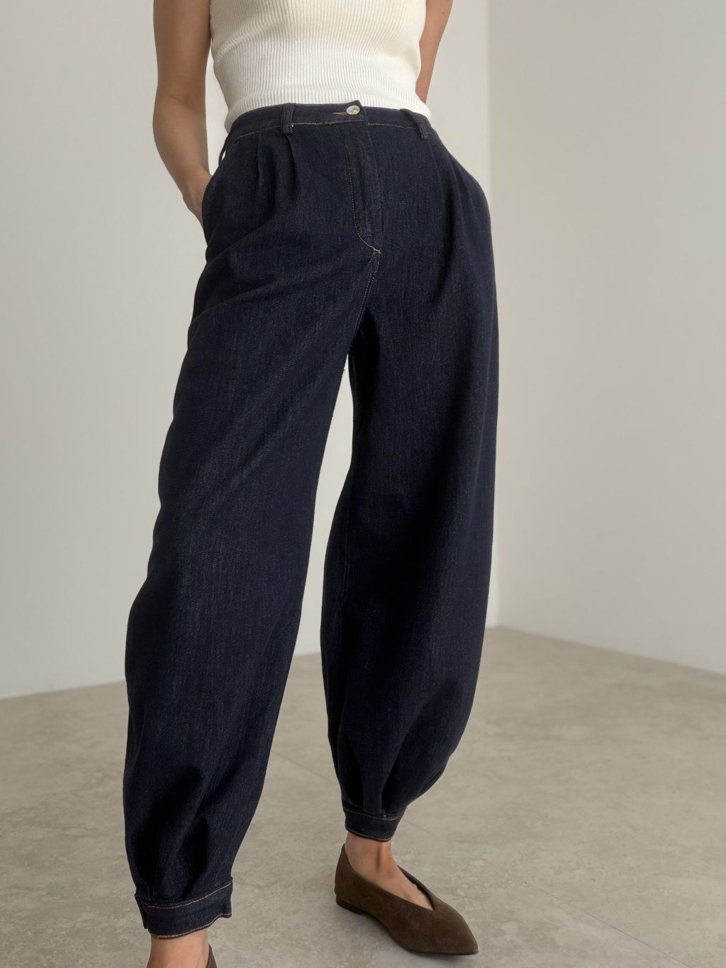 Jeansy balloon z wysokim stanem, luźnym krojem i zwężanym wykończeniem przy kostkach. Nowoczesny i wygodny model do codziennych stylizacji.