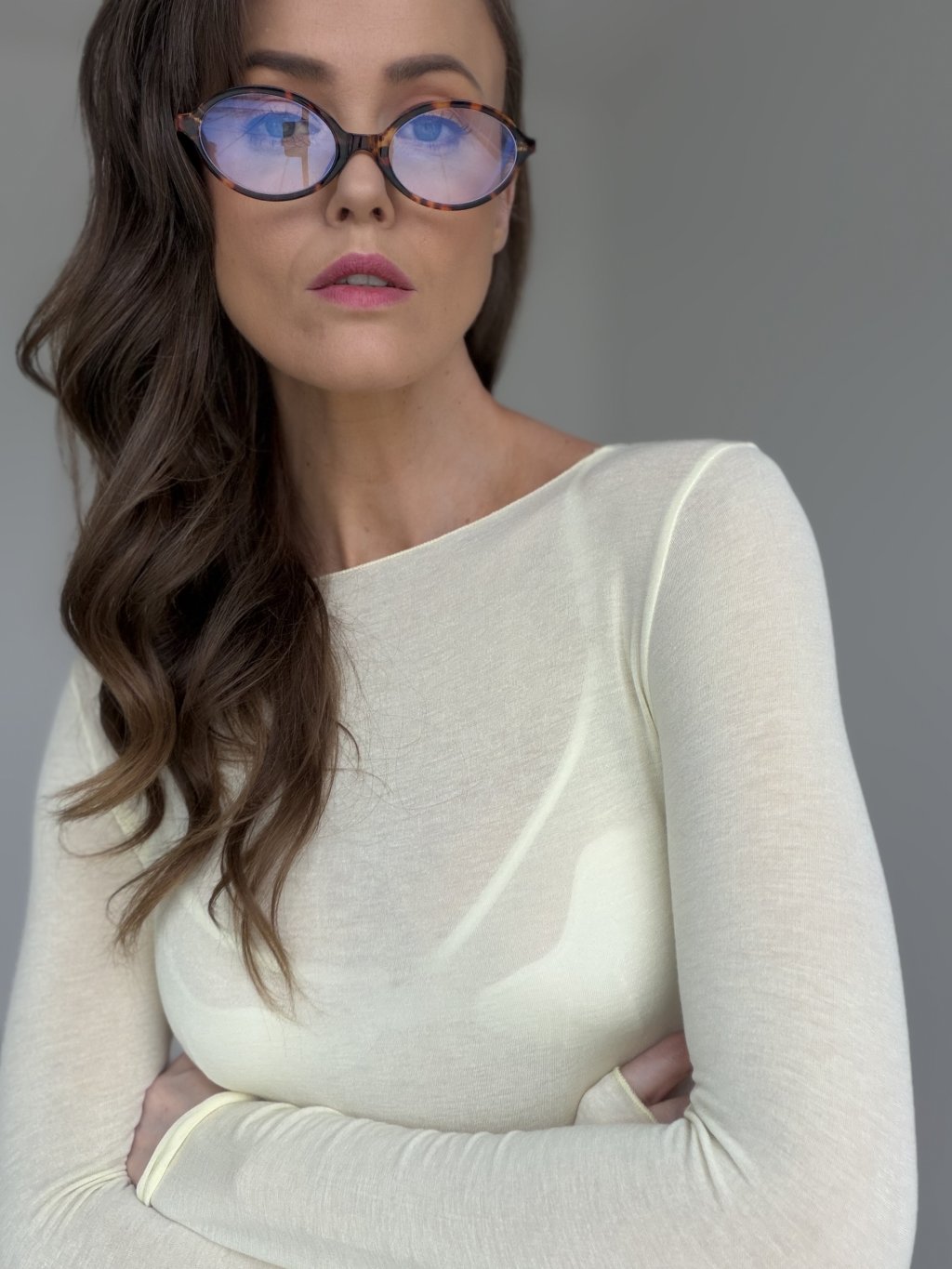 Miękki kaszmirowy top z długim rękawem i eleganckim dekoltem łódką. Lekka, przyjemna w dotyku dzianina komfortowo układa się na sylwetce i świetnie sprawdza się w warstwowych stylizacjach. Prosty, minimalistyczny krój jest ponadczasowy—łatwo łączy się ze spódnicą i spodniami na co dzień i na bardziej eleganckie okazje.