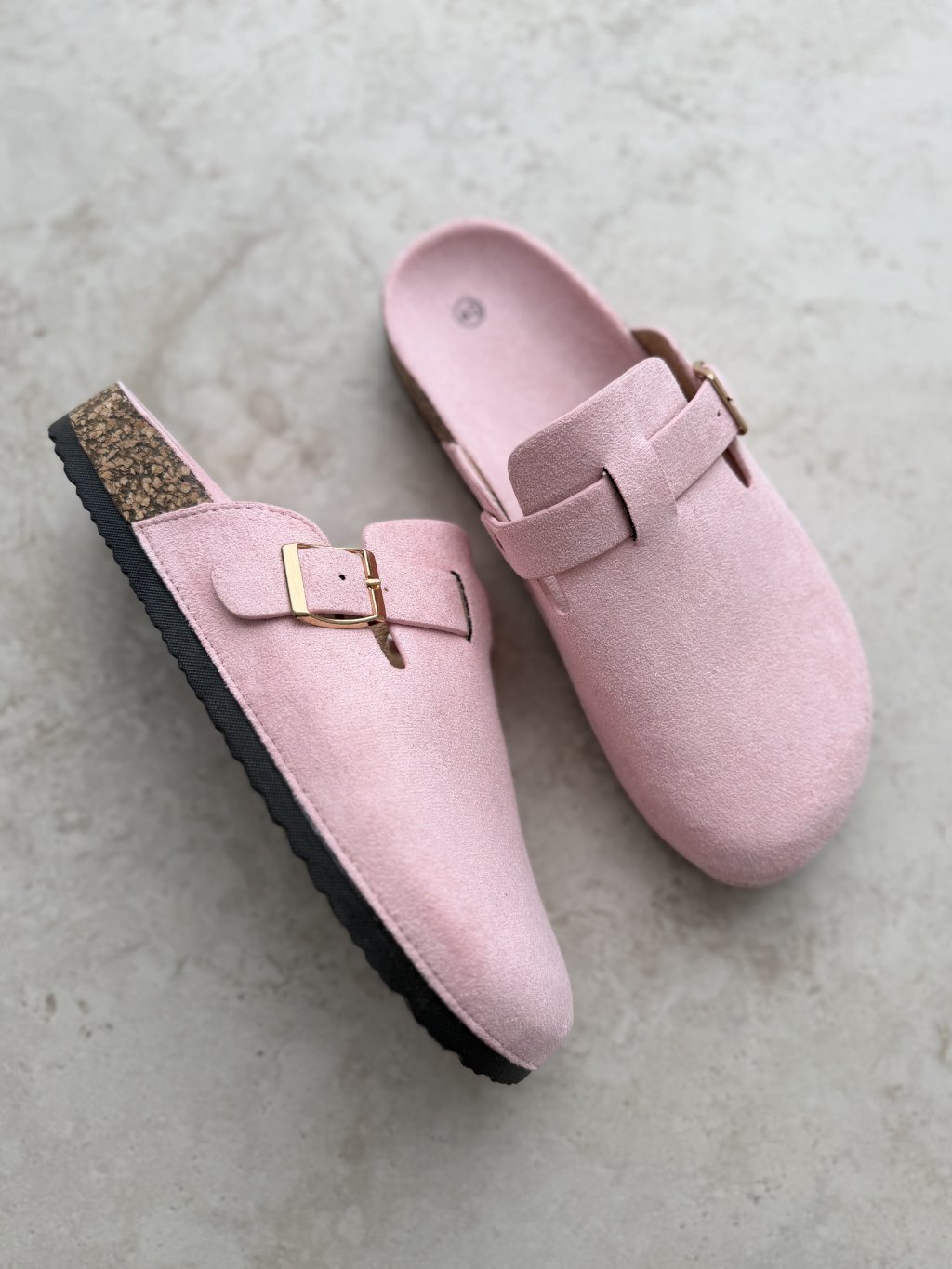 Zabudowane klapki typu mules z regulowaną sprzączką i wygodną wkładką. Zalecamy wybrać rozmiar o jeden większy.
