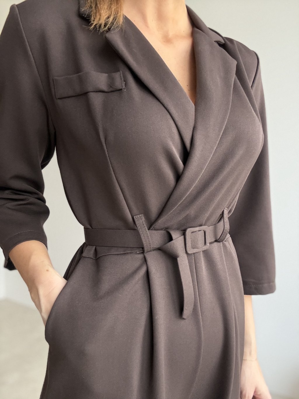 W talii znajduje się pasek z tego samego materiału, który podkreśla figurę i pozwala dopasować szerokość do postavy. Boczne kieszenie dodają kombinezonowi swobodnego, ale wciąż eleganckiego charakteru. To uniwersálny kúsok na pracę, spotkania, przyjęcia i wieczorne wyjścia – wystarczy zmienić dodatki, aby uzyskać zupełnie inny efekt.