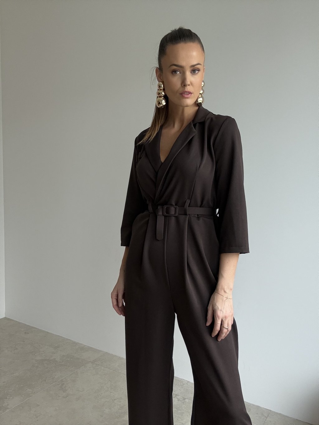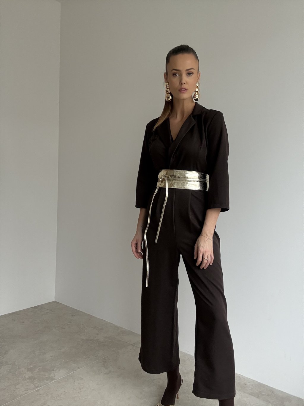Elegancki kombinezon z paskiem, kopertową górą i rękawami 3/4, który podkreśla talię i tworzy kobiecą, dopracowaną stylizację na różne okazje.