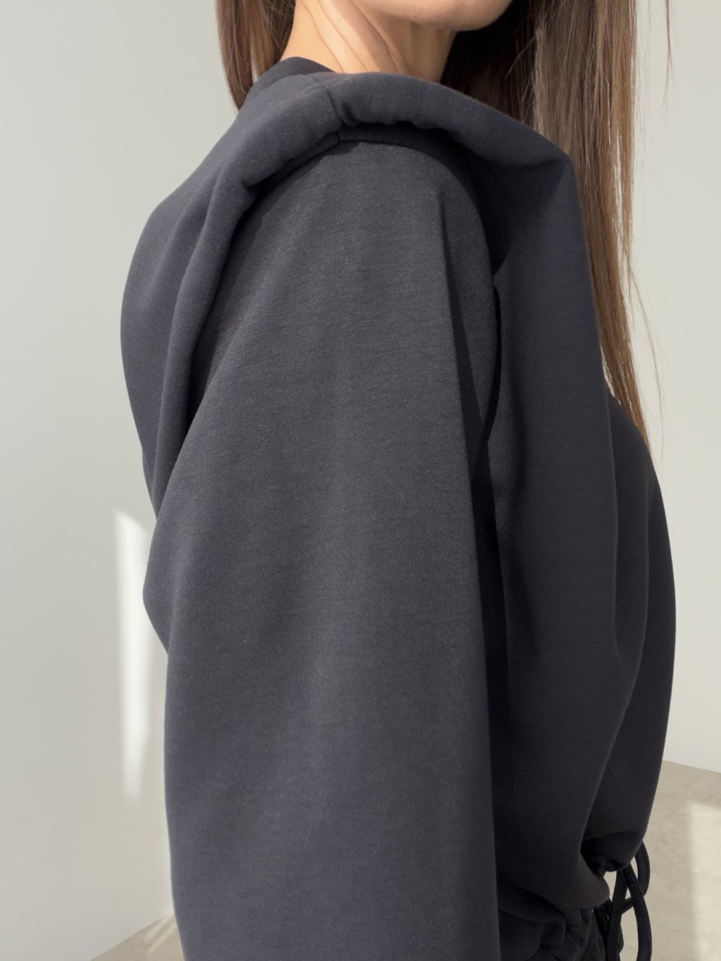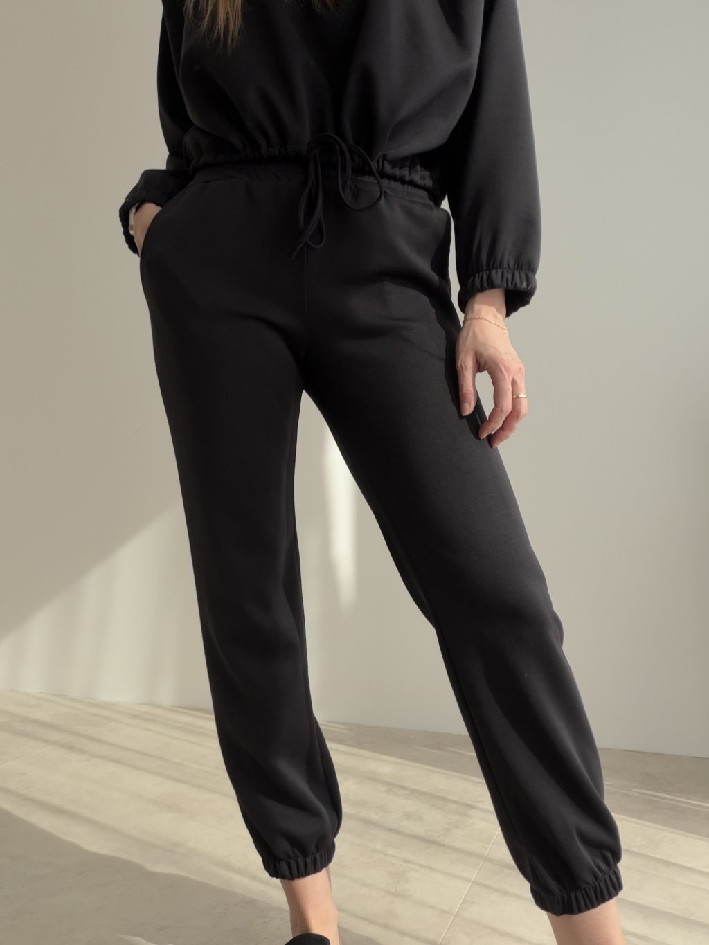 Ten komplet dresowy to świetny wybór, gdy zależy Ci na wygodzie, ale chcesz wyglądać schludnie i nowocześnie. Góra ma czystą formę z wyraźniej zarysowaną linią ramion, która ładnie modeluje sylwetkę, a w talii znajduje się regulowane ściągaczem wiązanie, dzięki czemu dopasujesz ją do figury. Miękki materiał zapewnia komfort przez cały dzień i sprawdza się zarówno na co dzień, jak i w podróży. Spodnie mają wygodny krój z kieszeniami oraz wykończenie przy kostkach, co nadaje całości sportowego, a jednocześnie stylowego charakteru. Komplet możesz nosić razem lub zestawiać elementy osobno z innymi ubraniami.