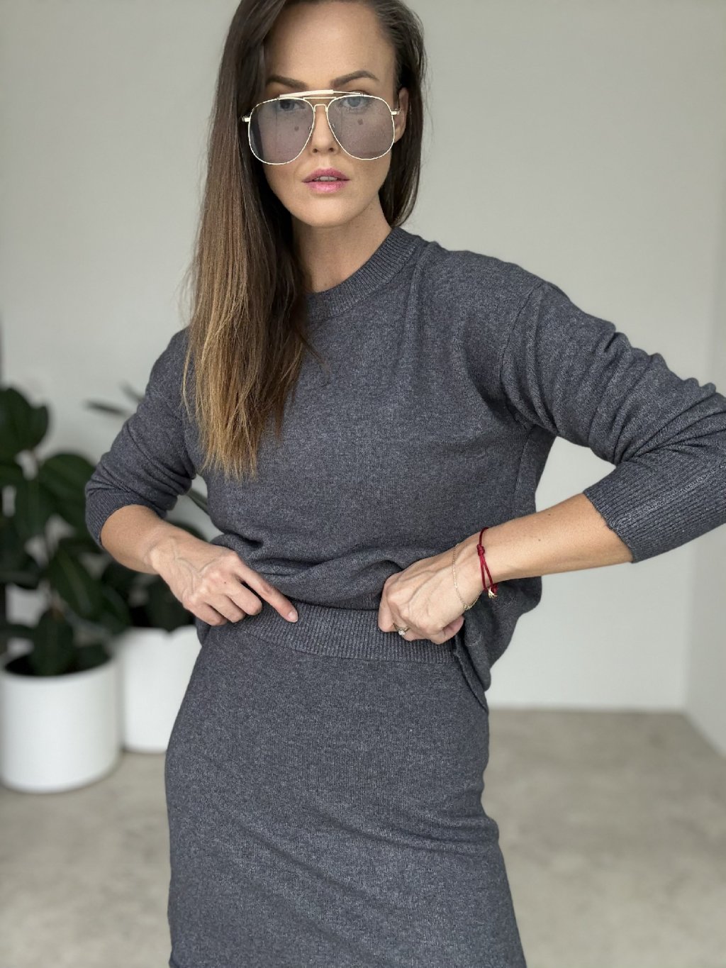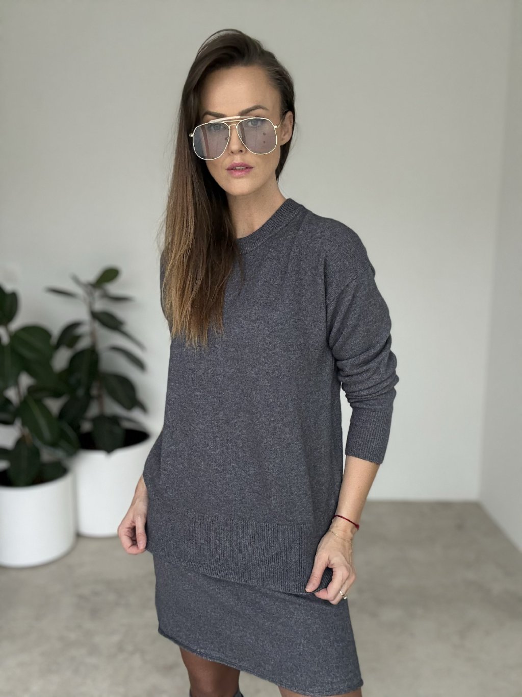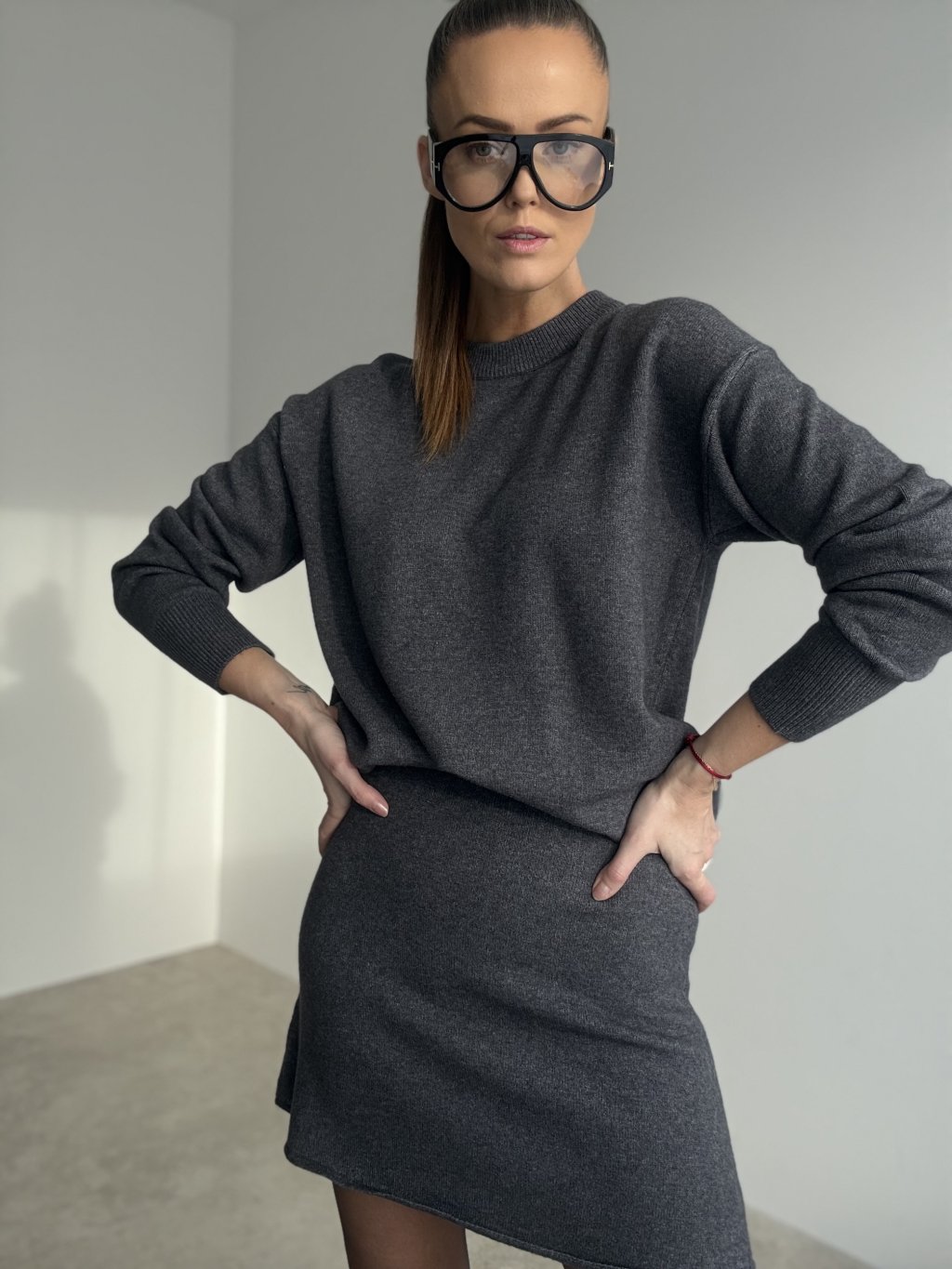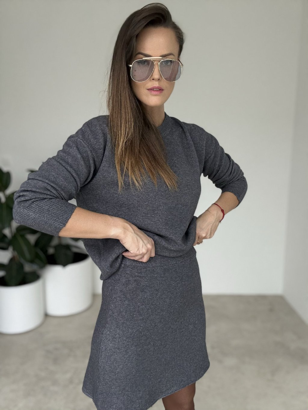 Elegancki dwuczęściowy komplet składa się z luźnej bluzy i wygodnej spódnicy z elastycznym pasem. Miękki i przyjemny materiał gwarantuje komfort noszenia przez cały dzień, a prosty krój wygląda stylowo i ponadczasowo. Komplet idealnie nadaje się na co dzień, ale można go również łatwo dopasować na okazje, kiedy chcesz wyglądać schludnie i nowocześnie.