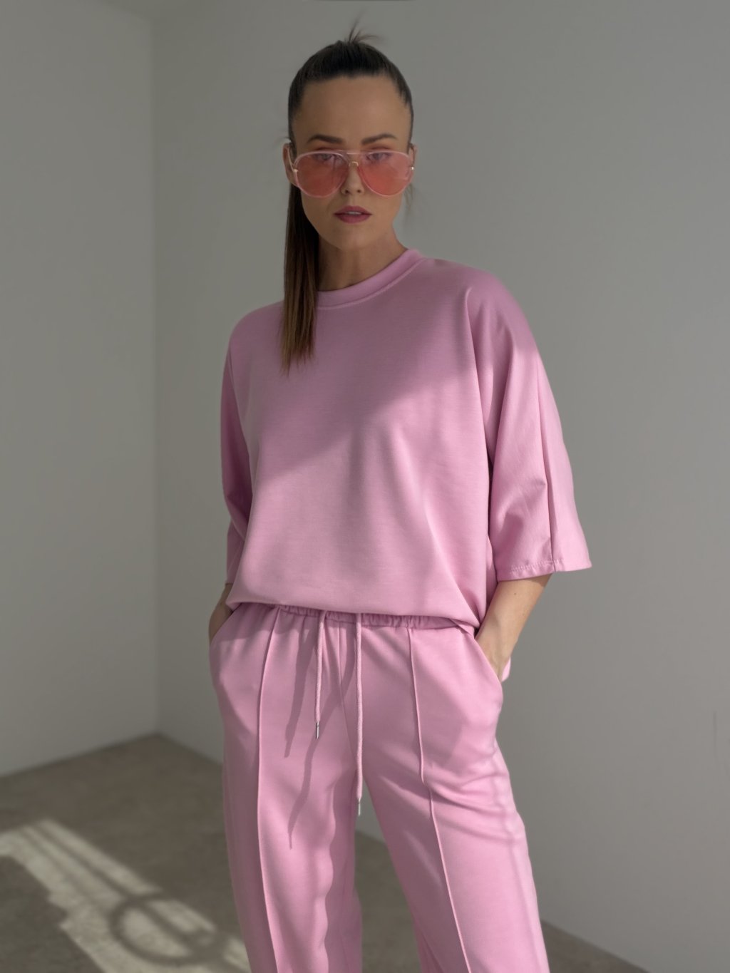 Wygodny dwuczęściowy komplet z miękkiej dzianiny to świetny wybór na co dzień, gdy zależy Ci na swobodzie i dopracowanym wyglądzie. Luźniejsza góra z okrągłym dekoltem i obniżoną linią ramion prezentuje się nowocześnie i lekko, a jednocześnie zapewnia pełen komfort. Spodnie mają elastyczny pas ze sznurkiem do regulacji, praktyczne kieszenie oraz swobodny krój, który układa się naturalnie i nie krępuje ruchów. Komplet możesz nosić w całości, ale równie dobrze sprawdzi się w stylizacjach jako osobne elementy.