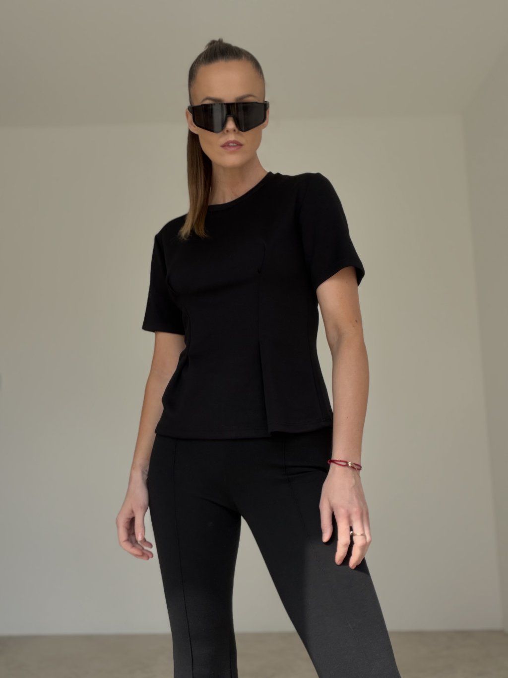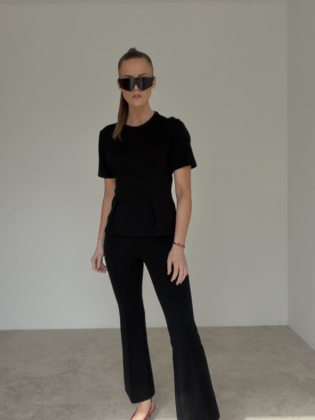 Dwuczęściowy komplet to idealny wybór dla kobiet, które cenią wygodę, proste linie oraz dopracowany, kobiecy wygląd. Górna część z krótkim rękawem prezentuje się minimalistycznie i elegancko, a delikatnie modelujący krój pięknie podkreśla sylwetkę. Dół stanowią dopasowane spodnie z wysokim stanem, które dobrze układają się na ciele i tworzą nowoczesną, ponadczasową stylizację odpowiednią zarówno na co dzień, jak i na bardziej stylowe, swobodne wyjścia. Całość wygląda spójnie, lekko i bardzo łatwo dopasowuje się do różnych dodatków.
