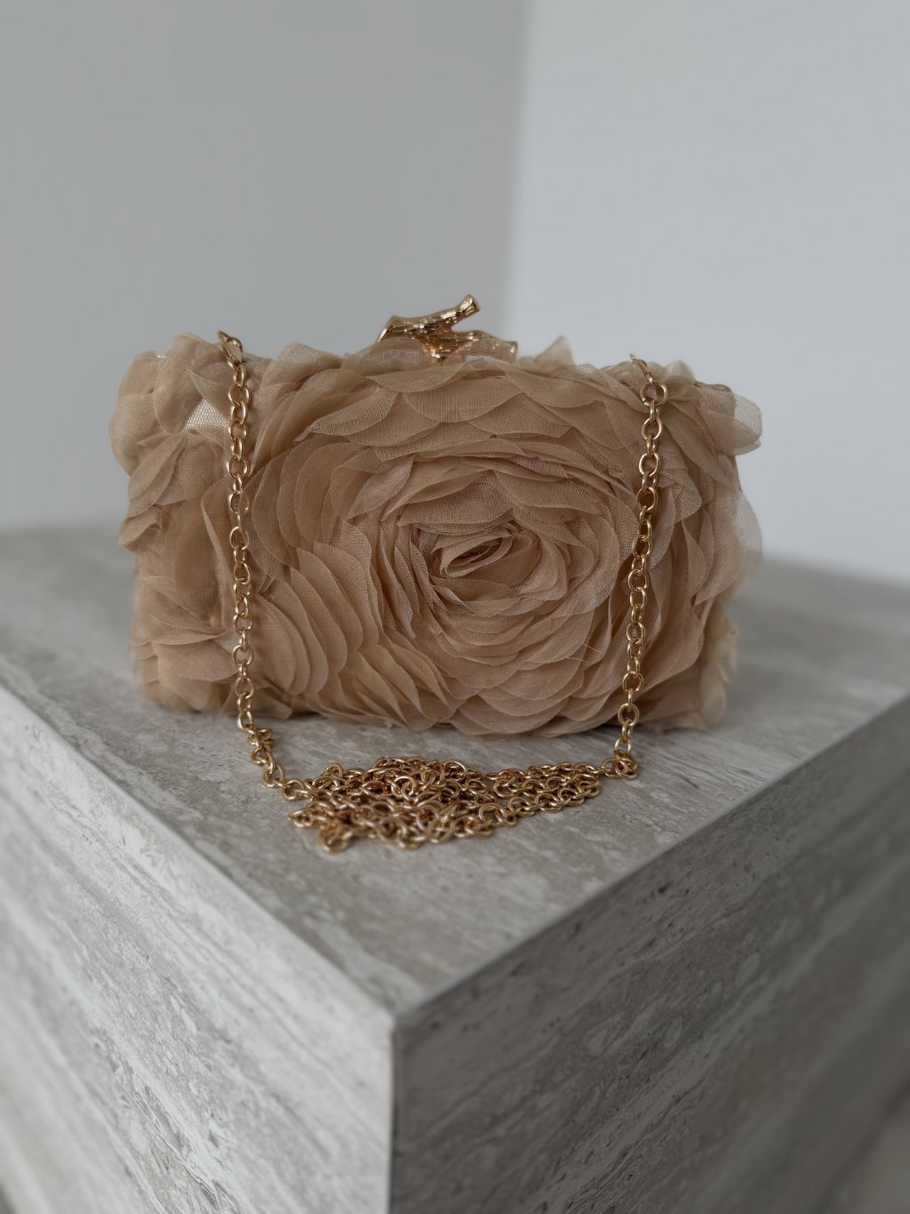 Model zapinany jest na ozdobne metalowe zapięcie i posiada łańcuszek, więc możesz nosić go w dłoni lub na ramieniu. Sprawdzi się na wesela, przyjęcia, bale, kolacje i eventy, świetnie komponując się z satynowymi sukienkami, garniturem i prostymi stylizacjami wieczorowymi.
