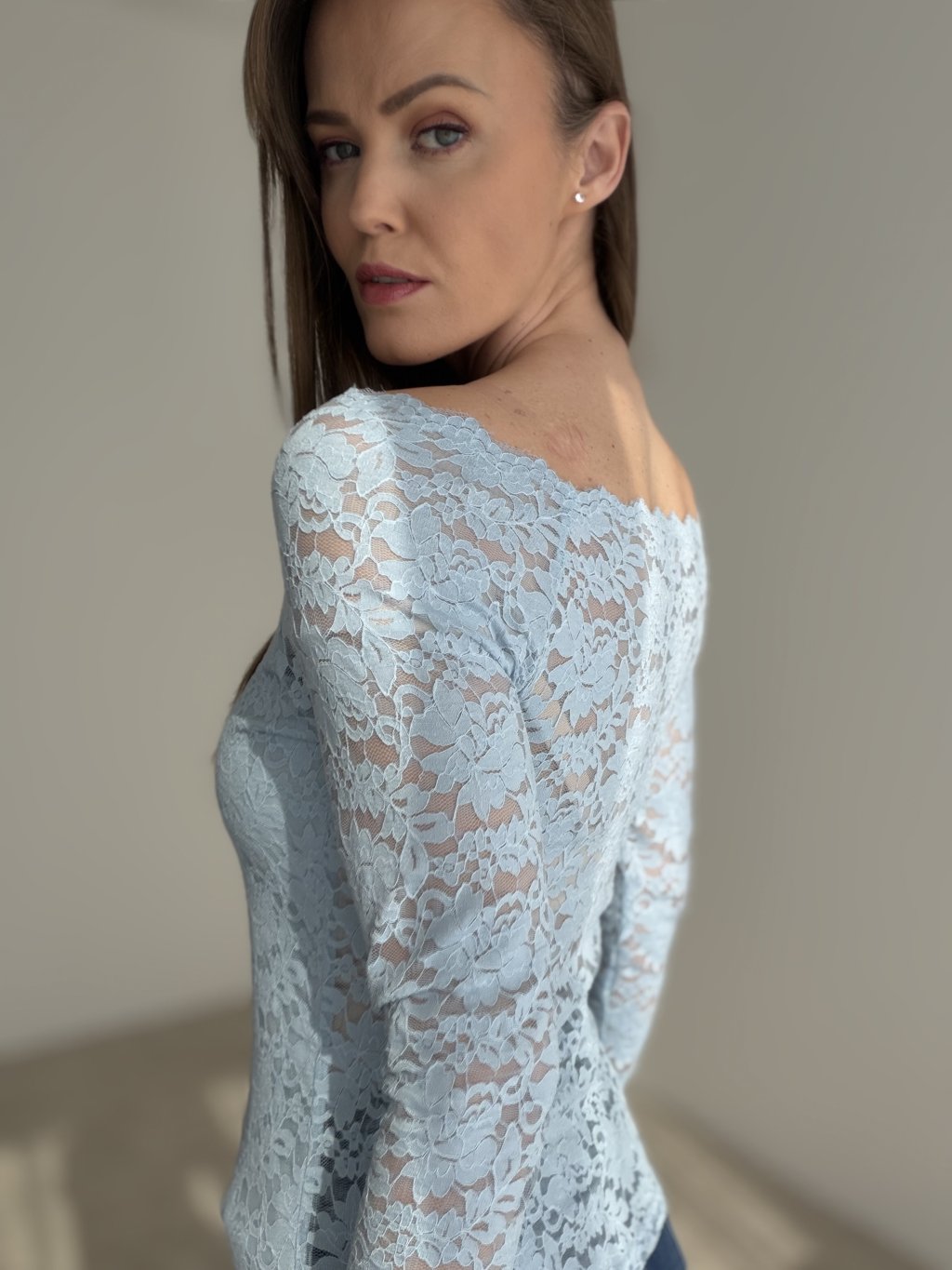Koronkowy top z kobiecym dekoltem i dopasowanym krojem, który dodaje stylizacji elegancji i lekkości.
