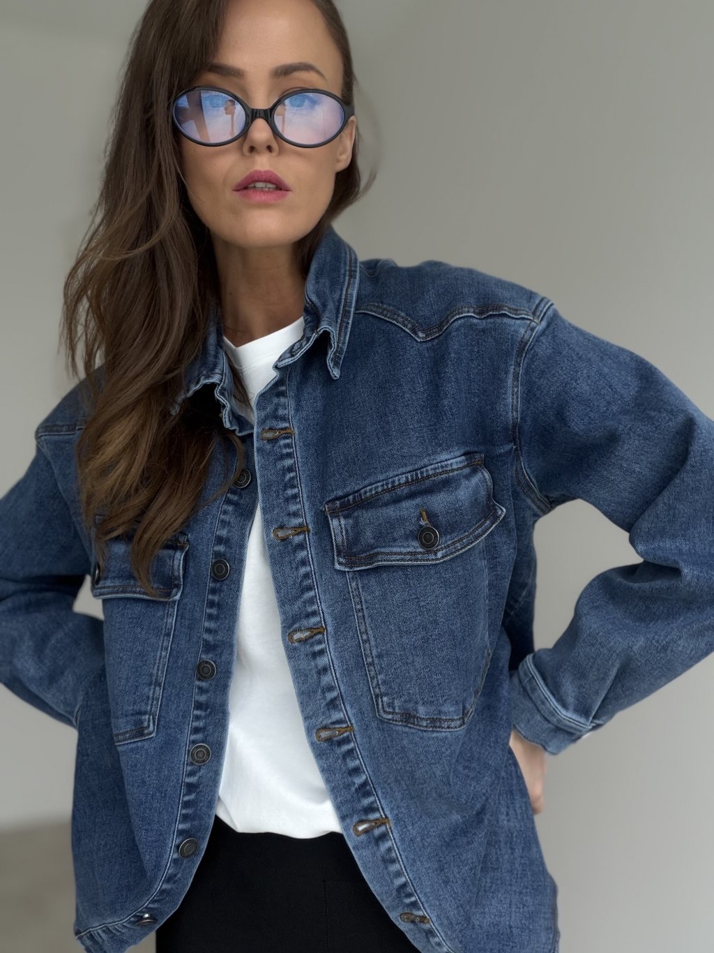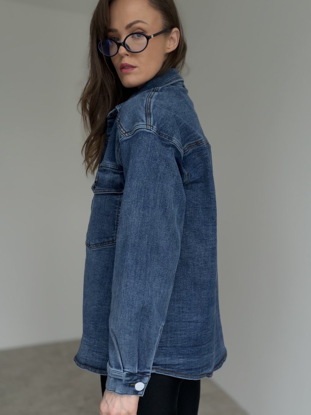 Ta koszula dżinsowa o kroju oversize to uniwersalny element garderoby, który sprawdzi się zarówno jako koszula, jak i lekka warstwa wierzchnia. Ma luźniejsze ramiona i delikatnie wydłużony fason, dzięki czemu świetnie wygląda noszona na T-shirt, top lub cienki golf. Zapięcie na guziki oraz wyraziste kieszenie na piersi nadają jej klasyczny, dżinsowy charakter, łatwy do wystylizowania na miejsko i na co dzień. Materiał jest bardziej strukturalny, ale komfortowy w noszeniu i dobrze trzyma formę, więc stylizacja wygląda dopracowanie bez wysiłku.