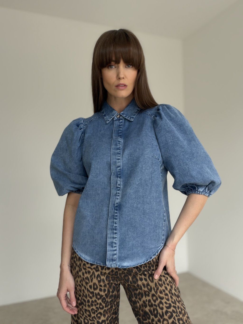 Stylowa koszula jeansowa z kołnierzykiem, zapięciem z przodu i efektownymi bufiastymi rękawami. Nowoczesny element do codziennych i bardziej stylowych zestawień. Broszka nie jest częścią produktu.