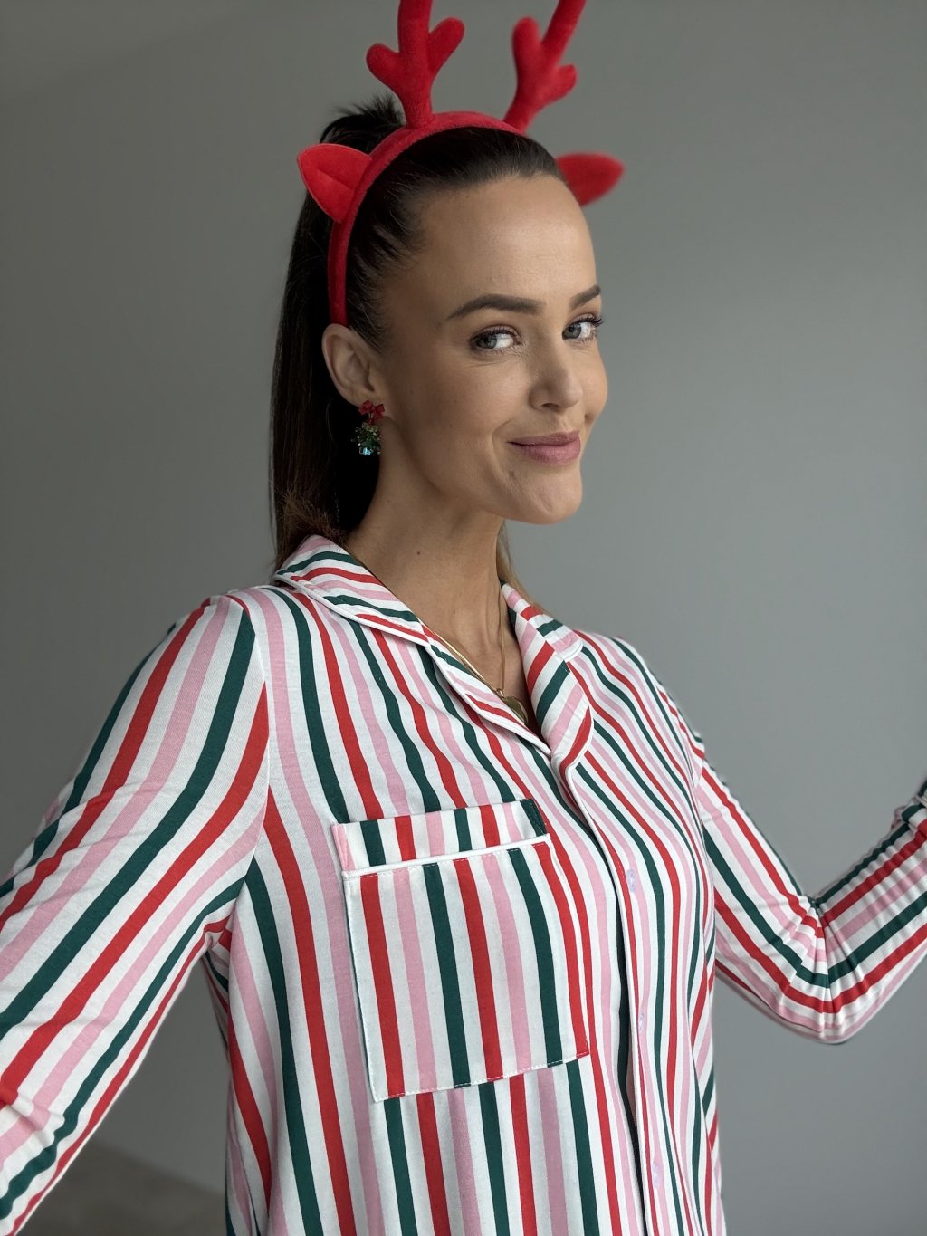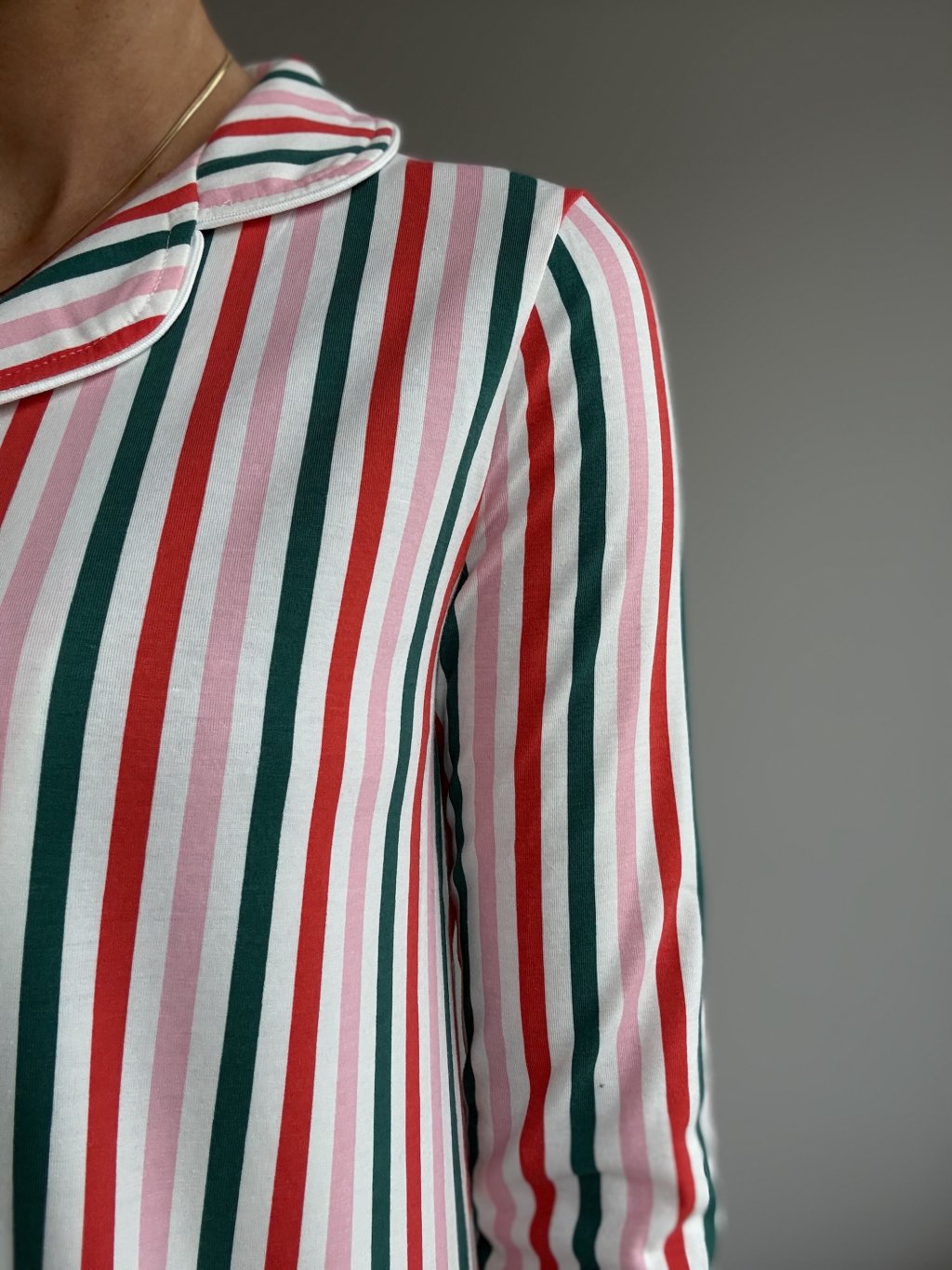 Koszulowa koszula nocna z długimi rękawami i pasiastym wzorem, która łączy radosny, świąteczny charakter z pełnym komfortem noszenia. Miękki, przyjemny w dotyku materiał delikatnie otula sylwetkę, a swobodniejszy krój nie krępuje ruchów ani podczas snu, ani podczas domowego odpoczynku. Klasyczny kołnierzyk, zapięcie na guziki na całej długości oraz naszyta kieszonka na biuście nadają jej elegancki, koszulowy wygląd, dzięki czemu będziesz wyglądać schludnie także przy rodzinnych śniadaniach czy wieczornym relaksie. Długość przed kolano pozwala nosić ją samodzielnie jako koszulę nocną albo w zestawie z legginsami lub domowymi spodniami.