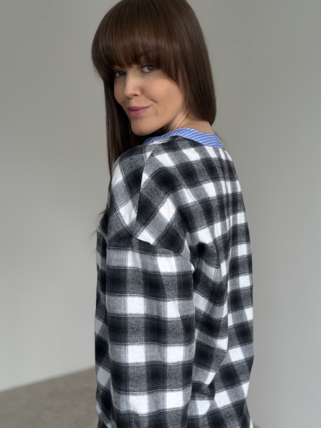 Koszula w kratę o luźnym kroju z kontrastowymi detalami przy listwie i mankietach.