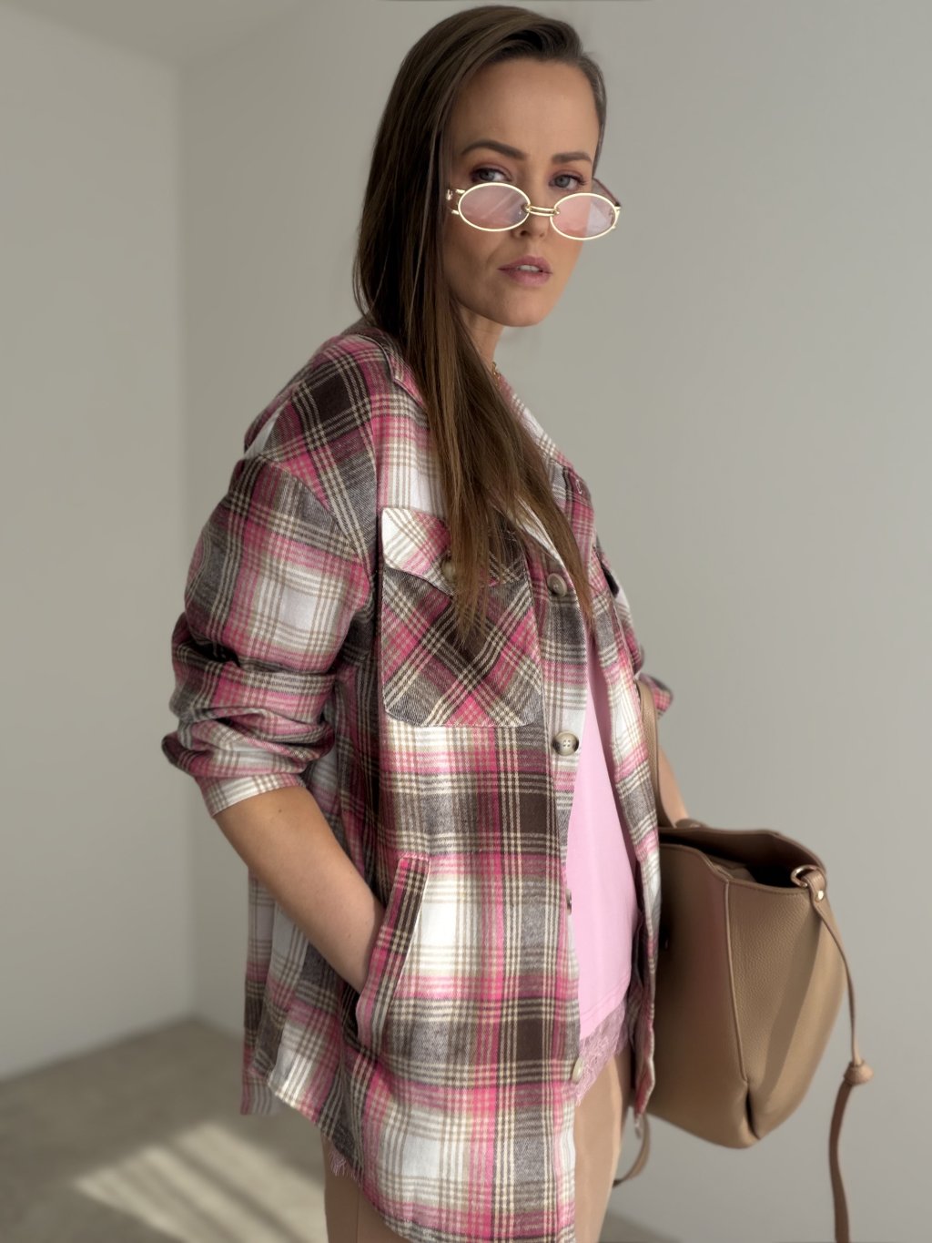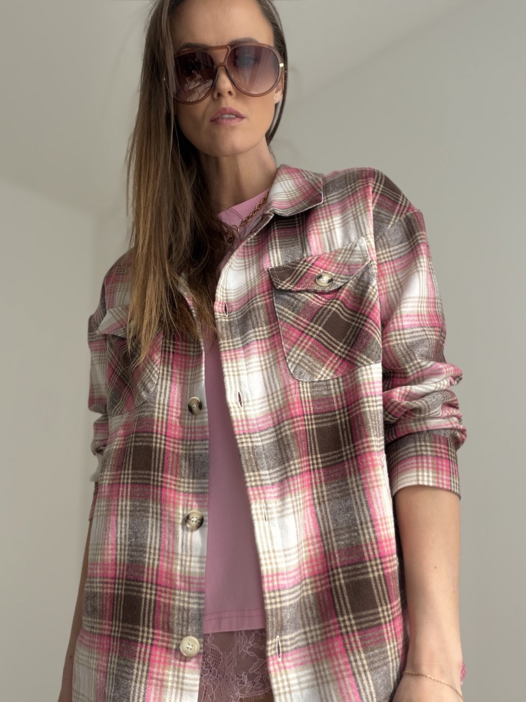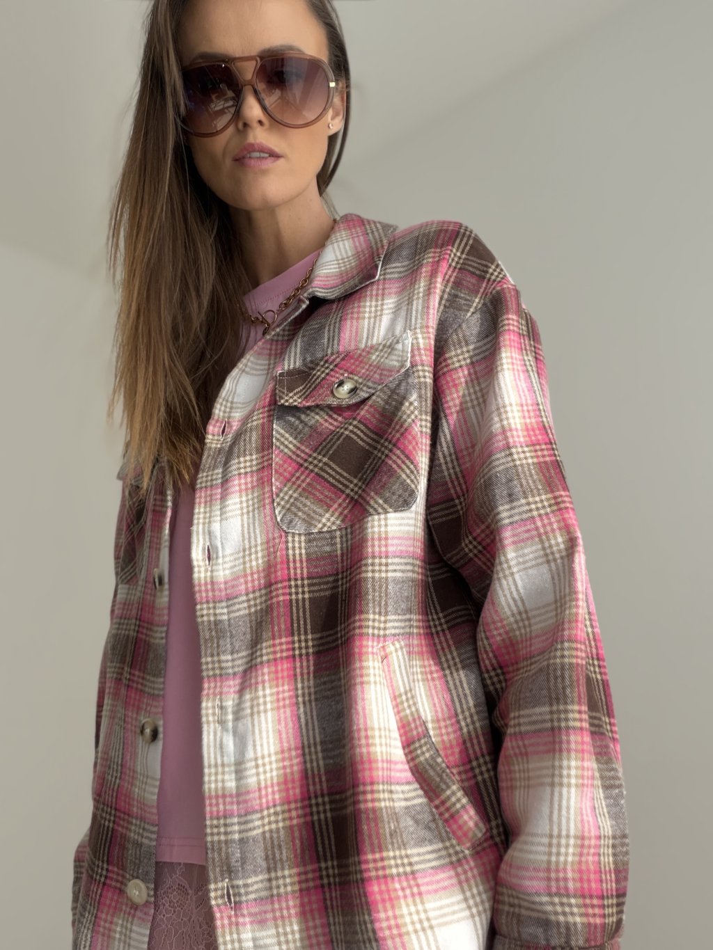 Koszula w kratę to stylowy i ponadczasowy model, który nadaje stylizacji swobodnego, ale jednocześnie dopracowanego charakteru. Luźniejszy krój, klasyczny kołnierzyk i zapięcie na guziki sprawiają, że świetnie nosi się ją zarówno samodzielnie, jak i jako warstwę wierzchnią. Przednie kieszenie oraz delikatnie wydłużony fason dodają całości nowoczesnego wyglądu i czynią z niej uniwersalny model na co dzień.