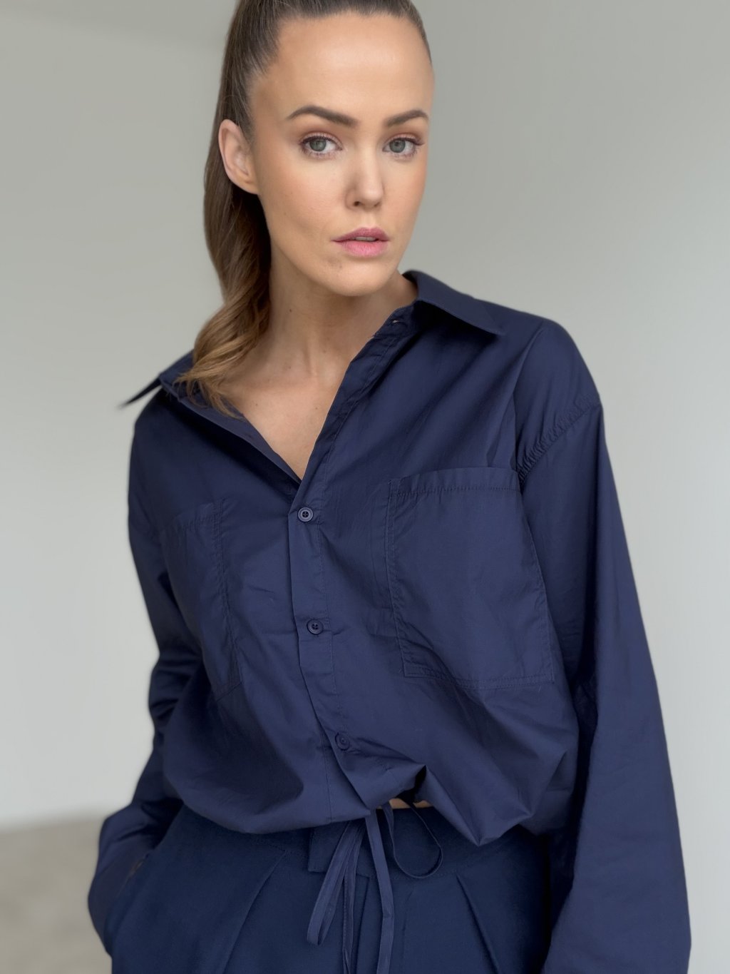 Swobodna i jednocześnie stylowa bawełniana koszula z detalem wiązania w pasie, który umożliwia dopasowanie kroju do figury. Podwójne kieszenie na piersiach i delikatnie marszczone rękawy dodają modelowi niezobowiązującej elegancji. Idealny wybór na co dzień – czy to do miasta, na spacer, czy do swobodnej stylizacji.
