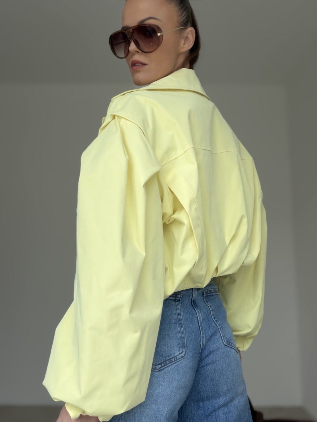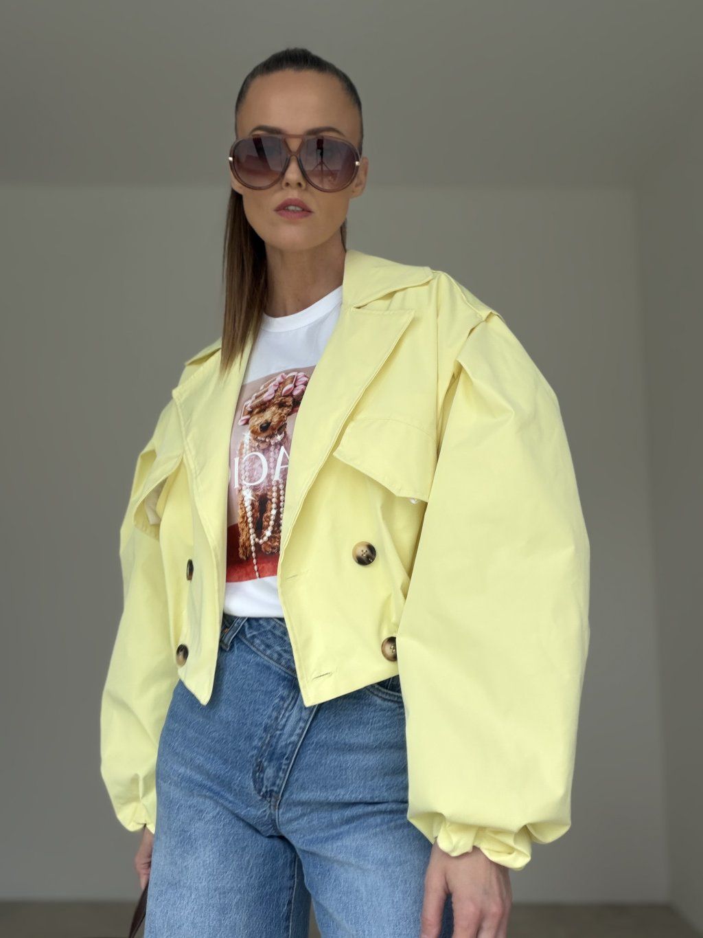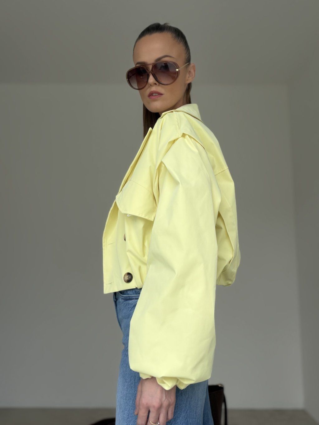 Krótki trencz z efektownym kołnierzem, dwurzędowym zapięciem i obszernymi rękawami, który nadaje stylizacji nowoczesny i elegancki charakter.
