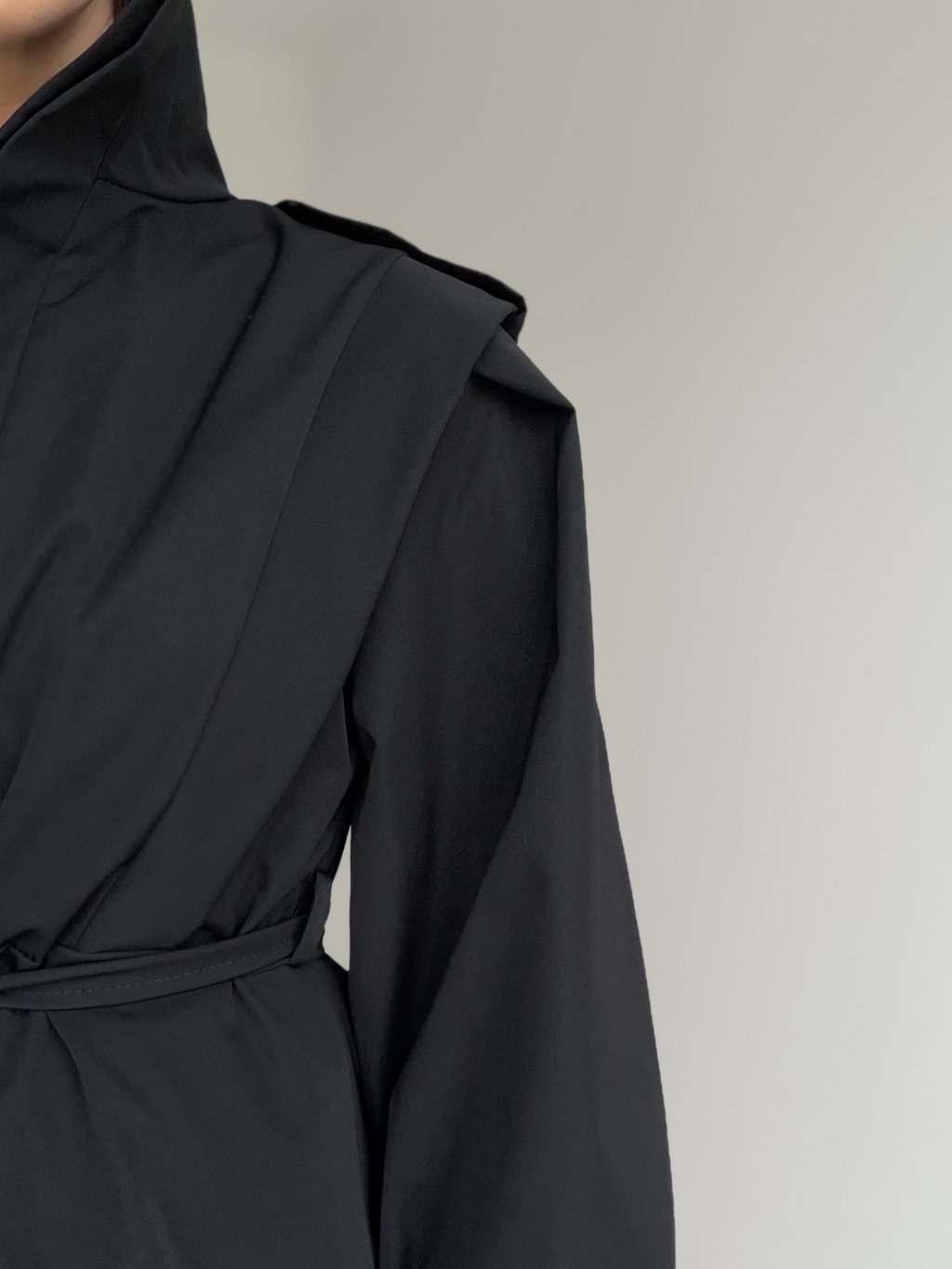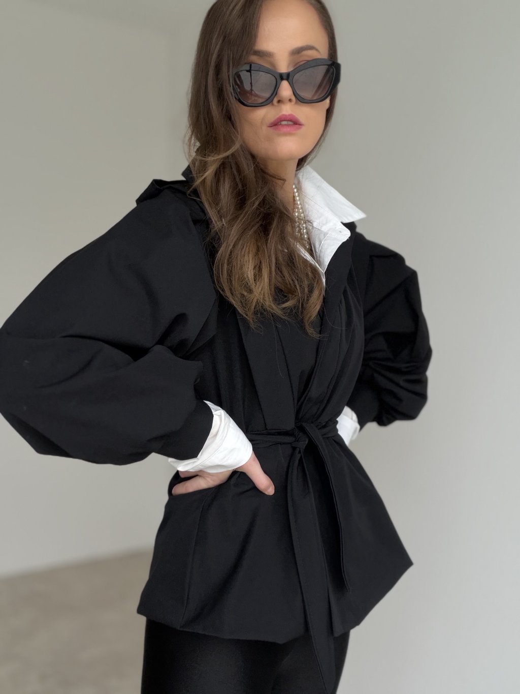 Ten krótki trencz to nowoczesny, wyrazisty model o bardziej usztywnionej formie, który nadaje stylizacji dopracowany, elegancki charakter. Skrócony fason świetnie wygląda ze spodniami z wyższym stanem oraz ze spódnicami, a przy tym nie obciąża sylwetki. Na uwagę zasługują efektownie uformowane, obszerne rękawy oraz detal na ramionach, które tworzą ciekawą, „architektoniczną” linię. Zapięcie na guziki i pasek w talii pozwalają nosić trencz swobodnie jako narzutkę lub przewiązać go, aby podkreślić talię. To idealny model na sezon przejściowy, zarówno na co dzień, jak i na bardziej eleganckie wyjścia.