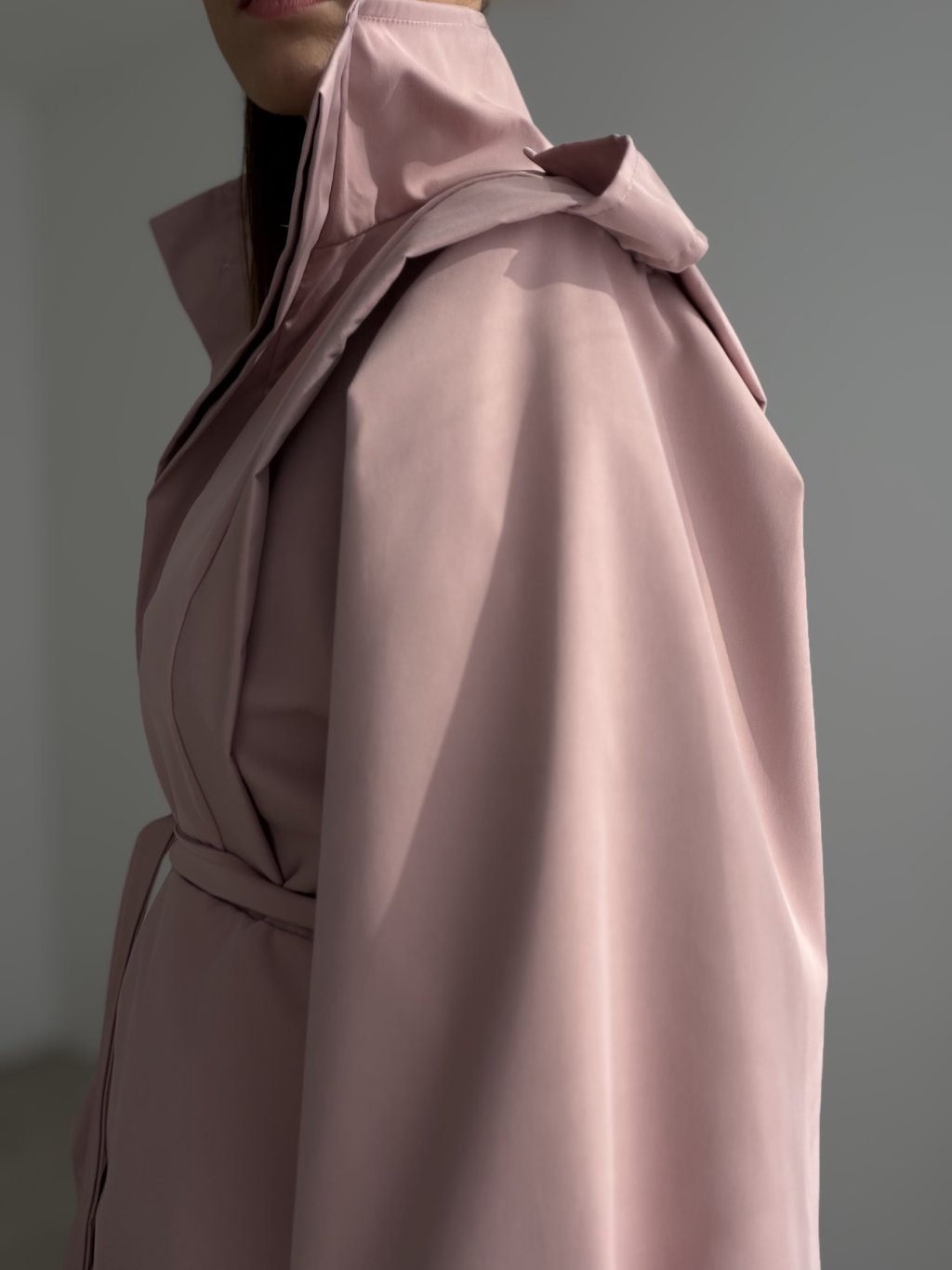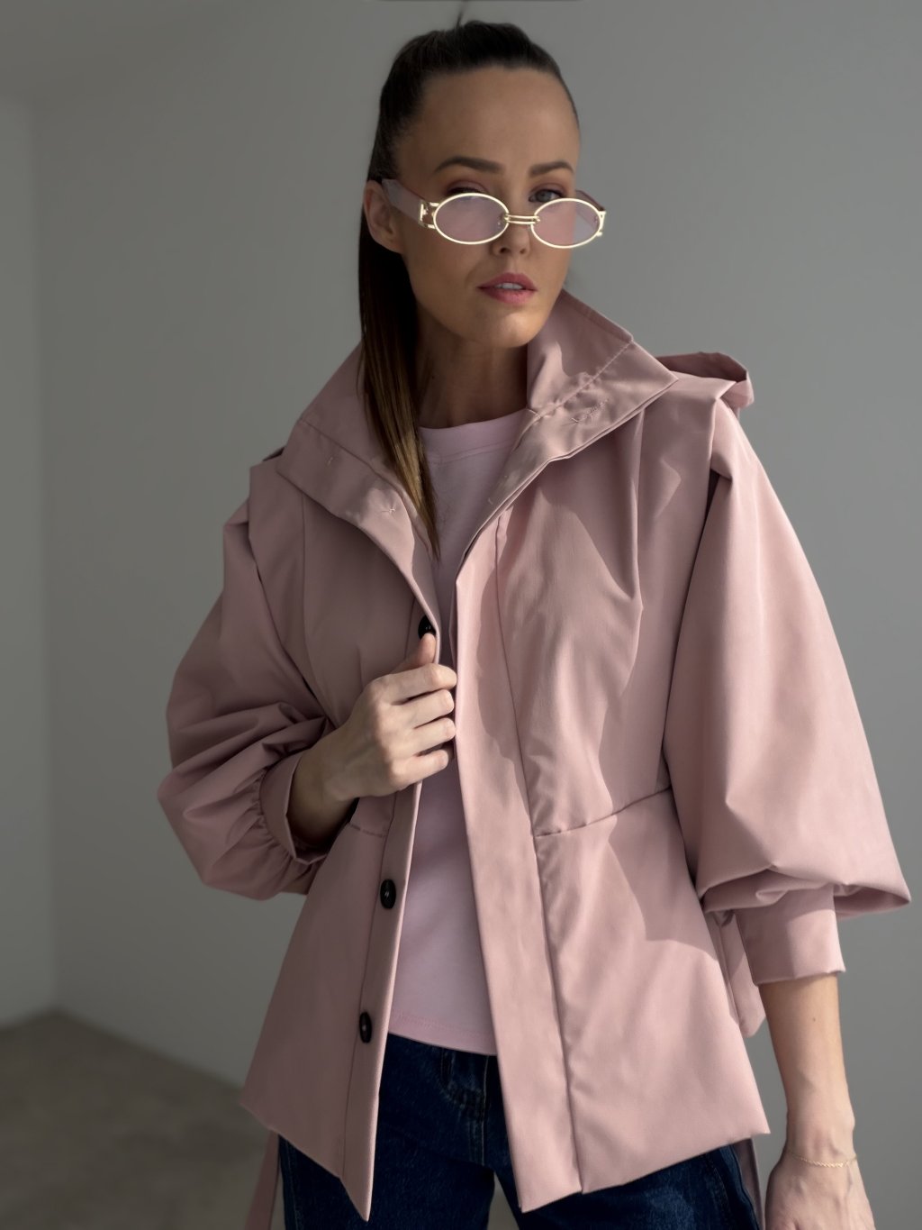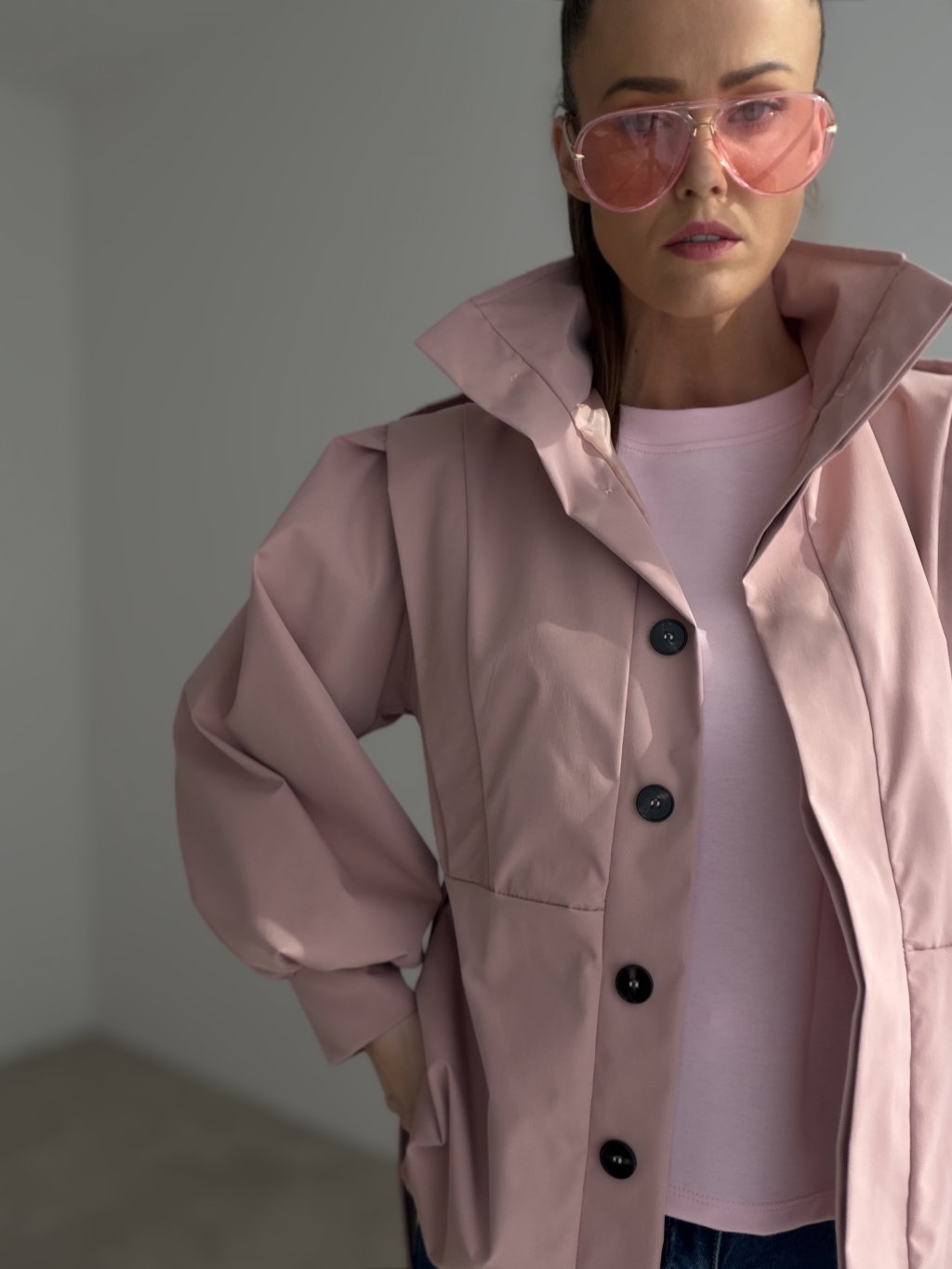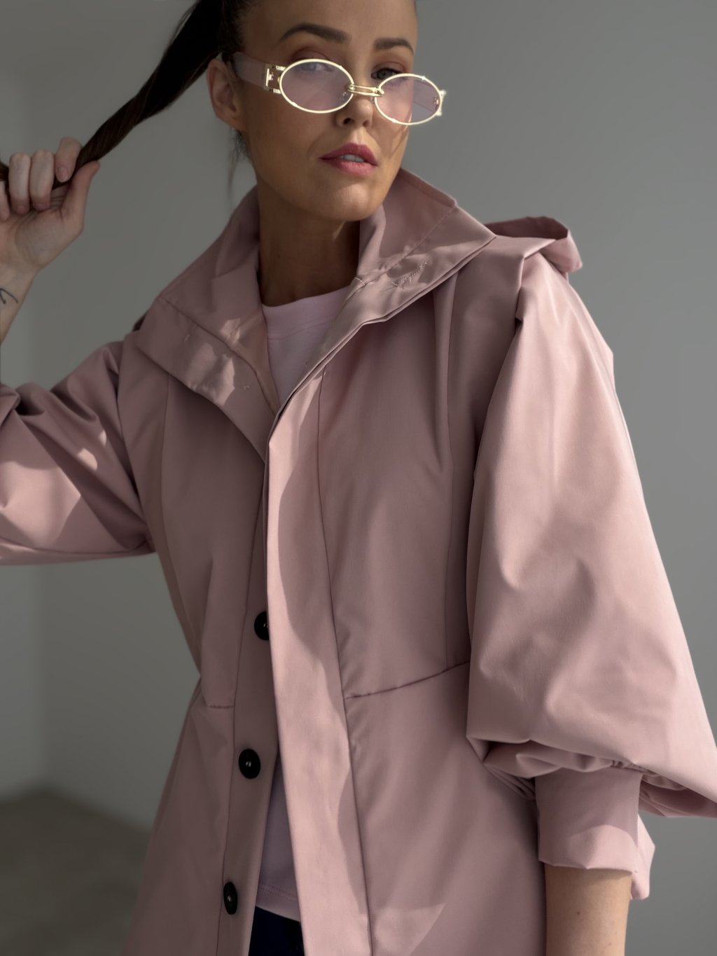 Ten krótki trencz to nowoczesny, wyrazisty model o bardziej usztywnionej formie, który nadaje stylizacji dopracowany, elegancki charakter. Skrócony fason świetnie wygląda ze spodniami z wyższym stanem oraz ze spódnicami, a przy tym nie obciąża sylwetki. Na uwagę zasługują efektownie uformowane, obszerne rękawy oraz detal na ramionach, które tworzą ciekawą, „architektoniczną” linię. Zapięcie na guziki i pasek w talii pozwalają nosić trencz swobodnie jako narzutkę lub przewiązać go, aby podkreślić talię. To idealny model na sezon przejściowy, zarówno na co dzień, jak i na bardziej eleganckie wyjścia.
