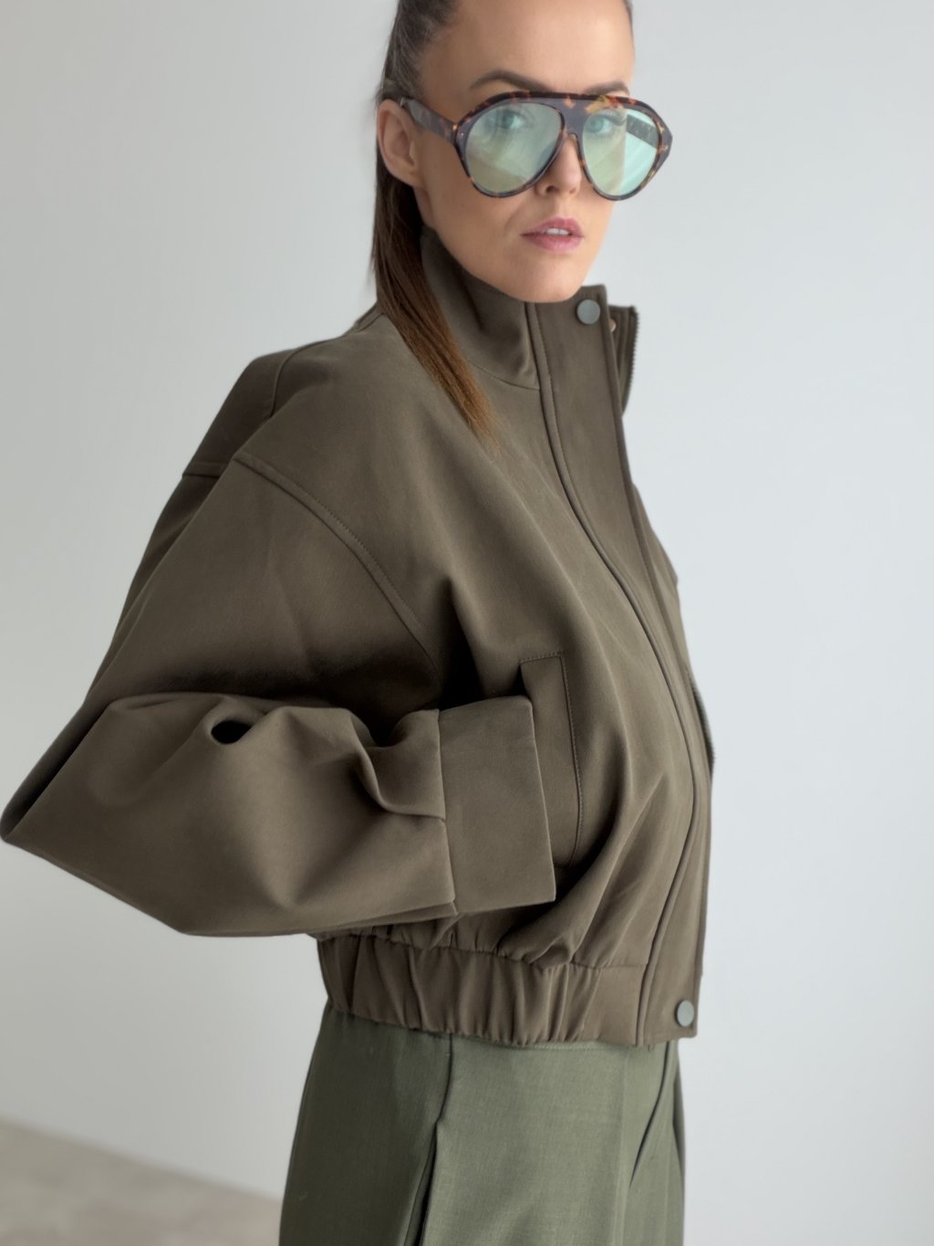 Ta kurtka wyróżnia się nowoczesnym, oversize’owym krojem, który wygląda stylowo, pewnie i jednocześnie zapewnia komfort noszenia. Posiada wyrazisty kołnierz, zapięcie na zamek oraz delikatnie ściągnięty dół, dzięki czemu pięknie trzyma formę i tworzy efektowną sylwetkę. To idealny wybór na okres przejściowy oraz na warstwowe stylizacje w chłodniejsze dni. Świetnie pasuje do codziennych zestawów, ale równie dobrze odnajdzie się w połączeniu z bardziej eleganckimi elementami garderoby, gdy chcesz dodać stylizacji nowoczesnego, miejskiego charakteru. To model, który od razu podkreśla charakter outfitu i nadaje mu modowego wyrazu.