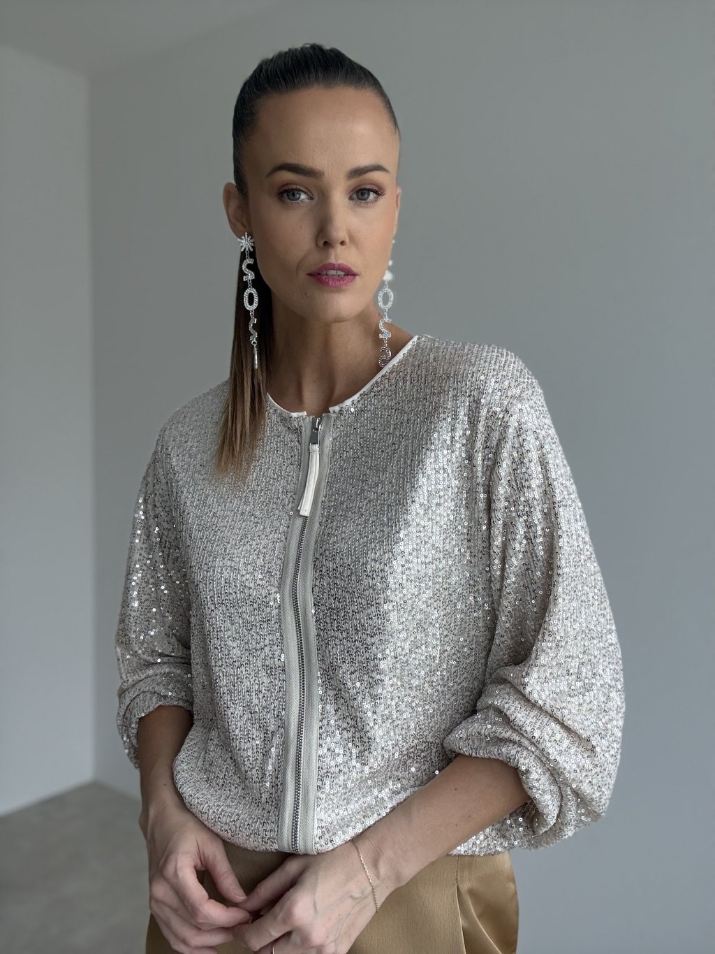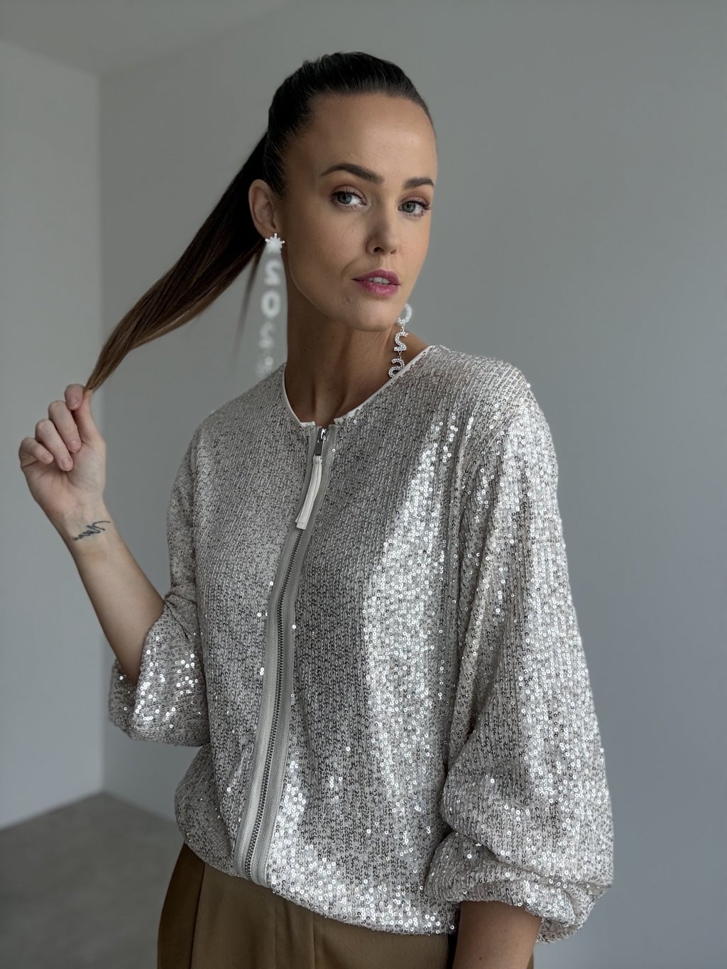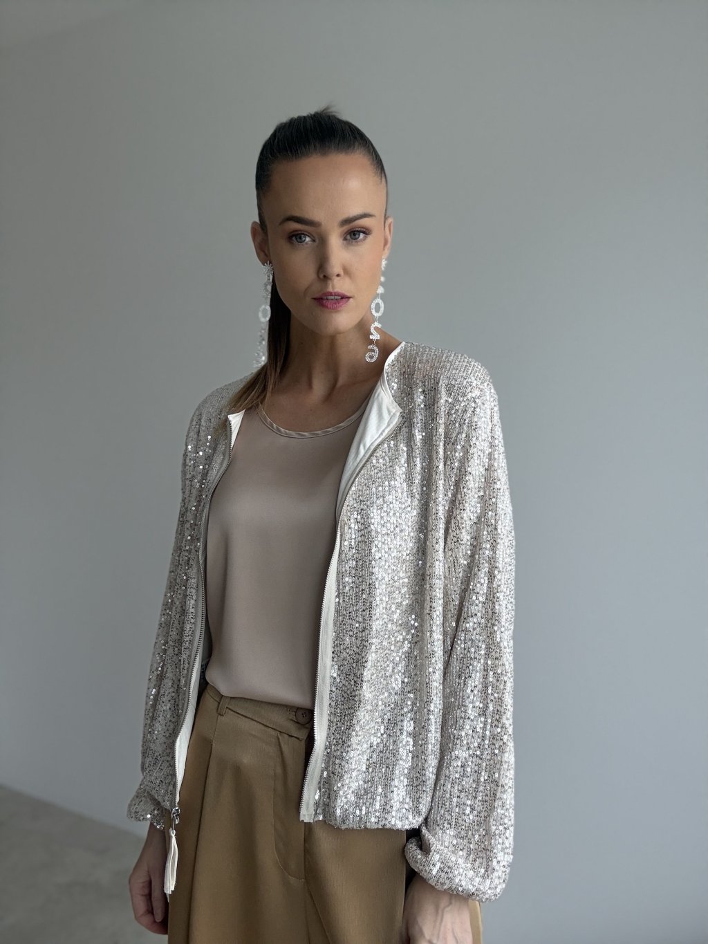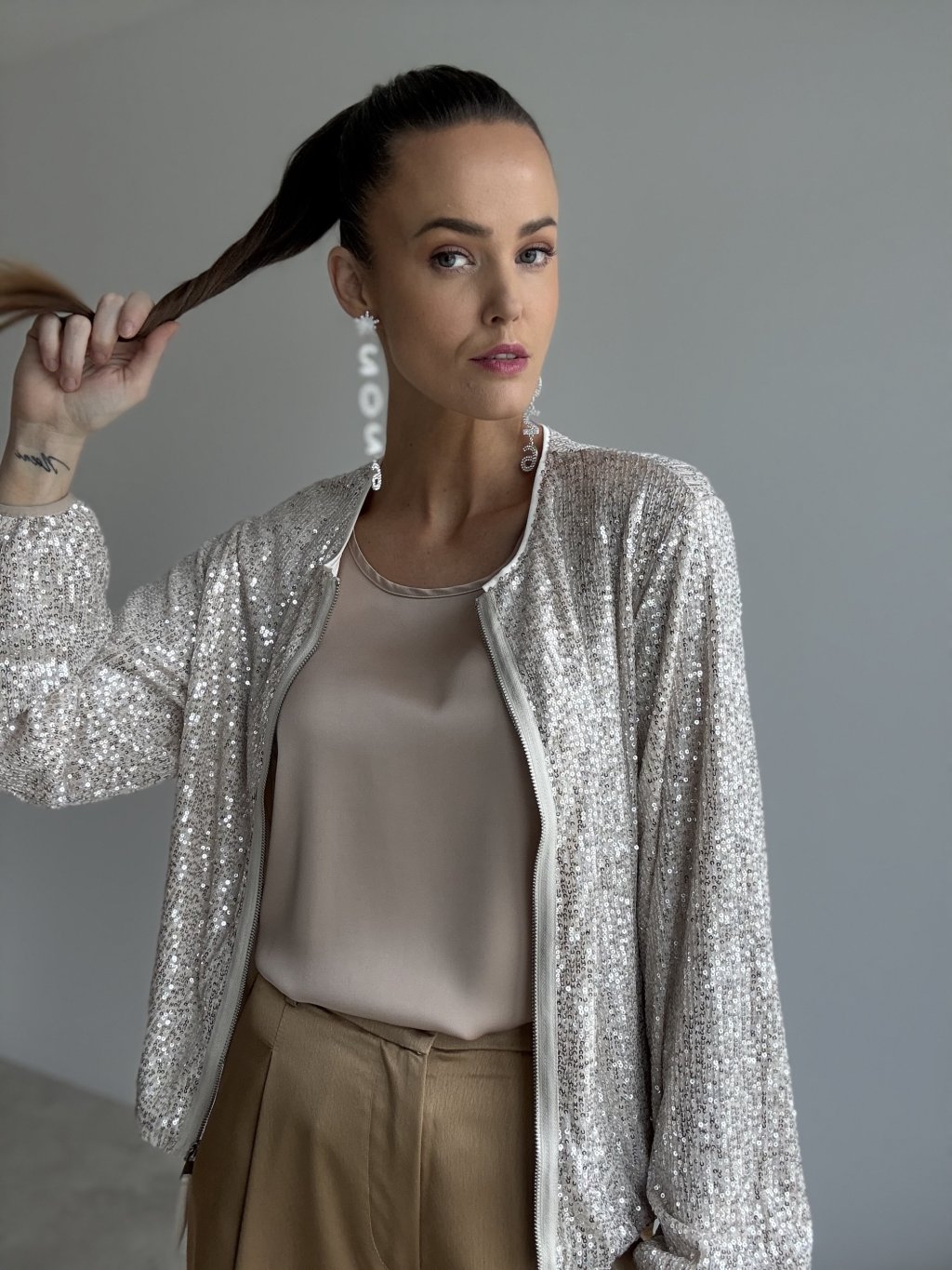 Lekka kurtka na zamek z pełnym, błyszczącym wykończeniem to efektowny element garderoby, który natychmiast nadaje stylizacji wieczorowego charakteru. Prosty, lekko luźny krój wygodnie układa się na sylwetce, nie opina jej i sprawia, że kurtkę można nosić zarówno w ciągu dnia, jak i na wieczorne wyjścia. Delikatne ściągacze w pasie i przy rękawach subtelnie podkreślają linię, dzięki czemu całość wygląda elegancko, ale wciąż swobodnie. Kurtka świetnie komponuje się z eleganckimi spodniami, ołówkową spódnicą oraz jeansami – można nosić ją rozpiętą jako narzutkę albo zapiętą, eksponując jej połyskującą strukturę. Tworzy wrażenie luksusowego bomberu, który sprawdzi się na imprezach, przyjęciach i stylowych spotkaniach.