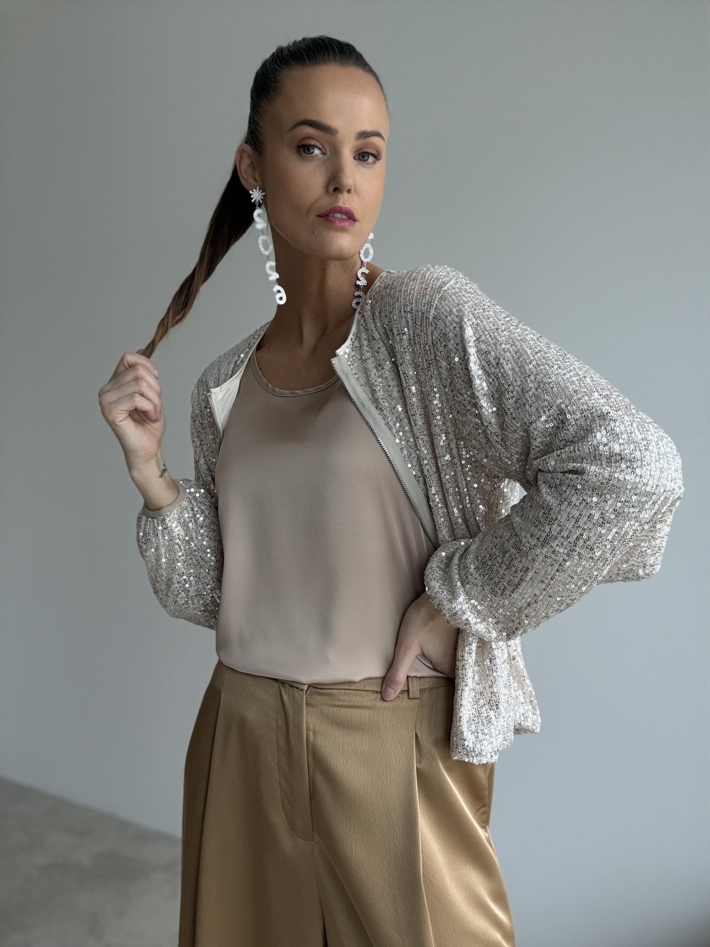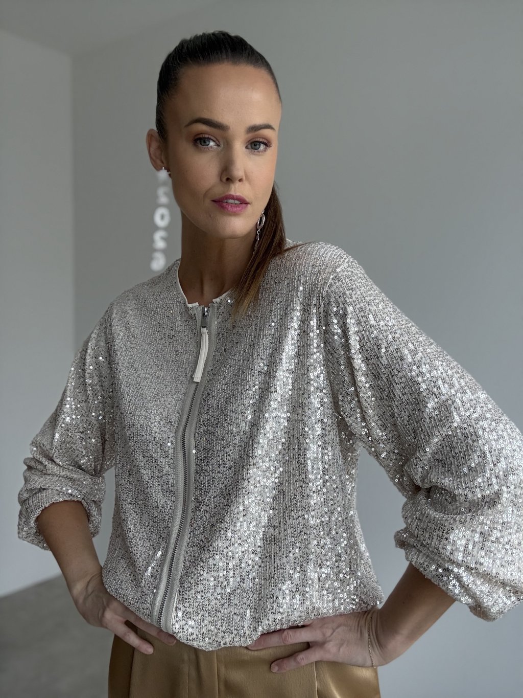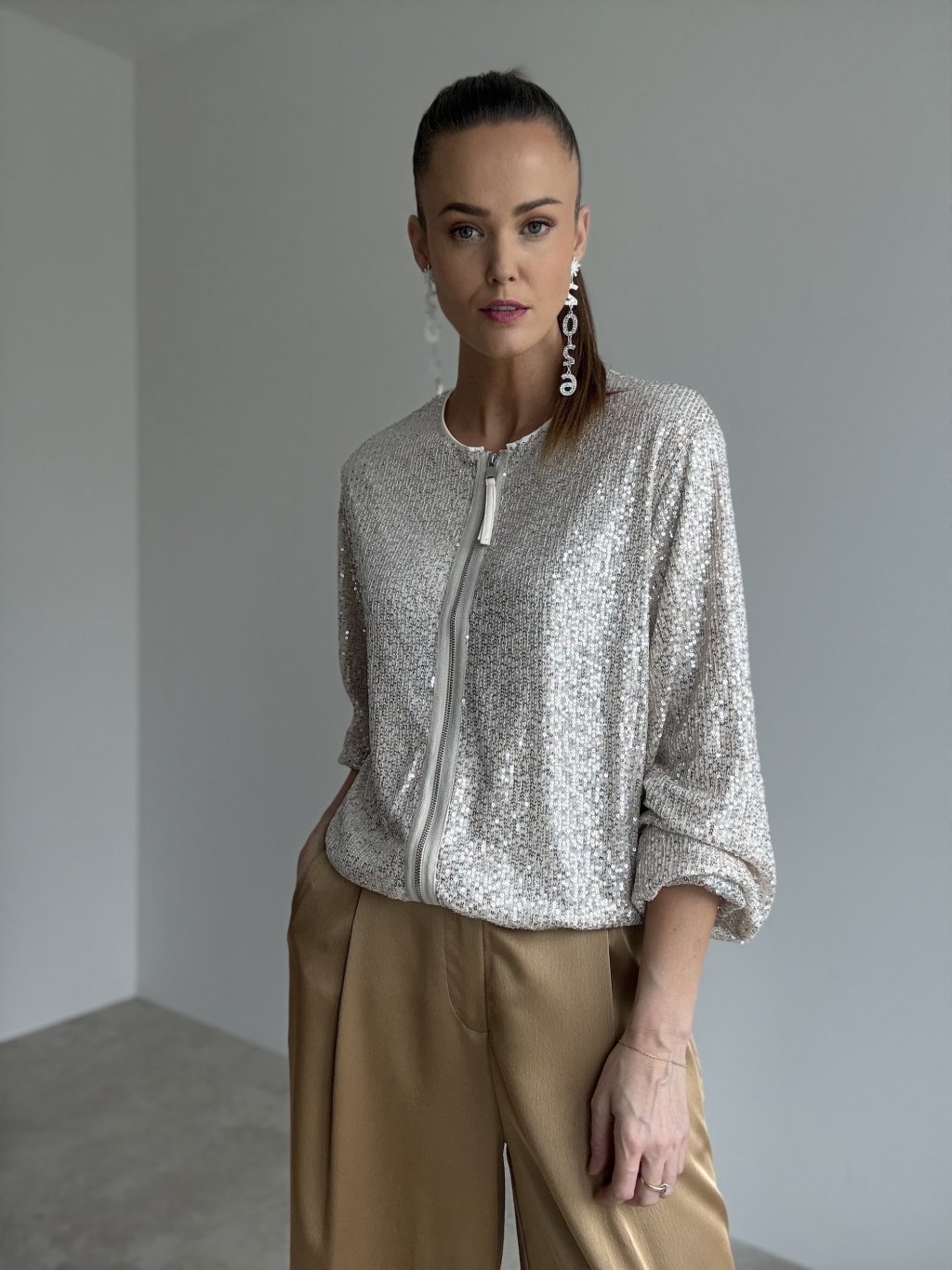 Lekka kurtka na zamek z pełnym, błyszczącym wykończeniem to efektowny element garderoby, który natychmiast nadaje stylizacji wieczorowego charakteru. Prosty, lekko luźny krój wygodnie układa się na sylwetce, nie opina jej i sprawia, że kurtkę można nosić zarówno w ciągu dnia, jak i na wieczorne wyjścia. Delikatne ściągacze w pasie i przy rękawach subtelnie podkreślają linię, dzięki czemu całość wygląda elegancko, ale wciąż swobodnie. Kurtka świetnie komponuje się z eleganckimi spodniami, ołówkową spódnicą oraz jeansami – można nosić ją rozpiętą jako narzutkę albo zapiętą, eksponując jej połyskującą strukturę. Tworzy wrażenie luksusowego bomberu, który sprawdzi się na imprezach, przyjęciach i stylowych spotkaniach.