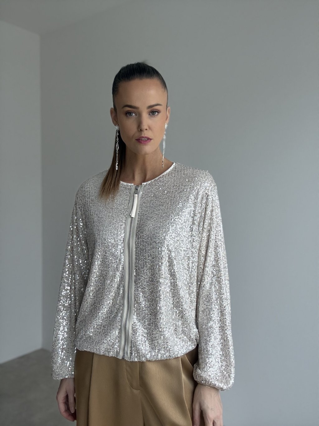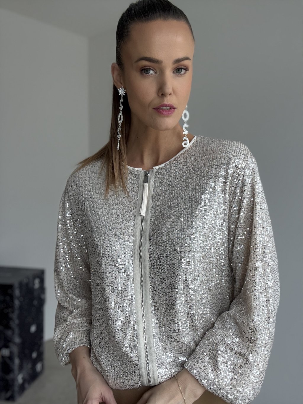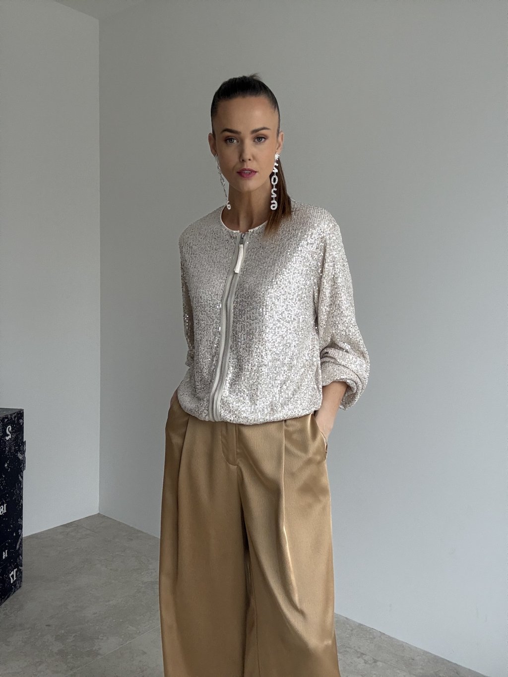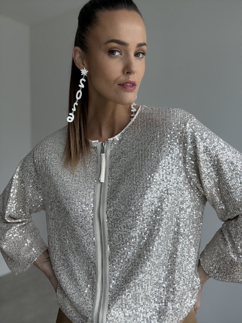 Lekka kurtka na zamek z pełnym, błyszczącym wykończeniem to efektowny element garderoby, który natychmiast nadaje stylizacji wieczorowego charakteru. Prosty, lekko luźny krój wygodnie układa się na sylwetce, nie opina jej i sprawia, że kurtkę można nosić zarówno w ciągu dnia, jak i na wieczorne wyjścia. Delikatne ściągacze w pasie i przy rękawach subtelnie podkreślają linię, dzięki czemu całość wygląda elegancko, ale wciąż swobodnie. Kurtka świetnie komponuje się z eleganckimi spodniami, ołówkową spódnicą oraz jeansami – można nosić ją rozpiętą jako narzutkę albo zapiętą, eksponując jej połyskującą strukturę. Tworzy wrażenie luksusowego bomberu, który sprawdzi się na imprezach, przyjęciach i stylowych spotkaniach.