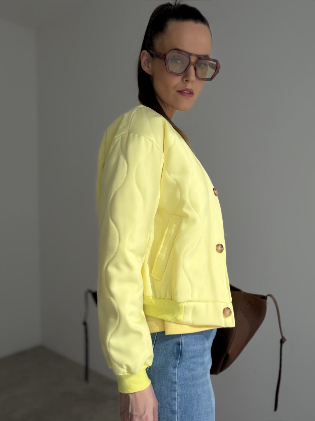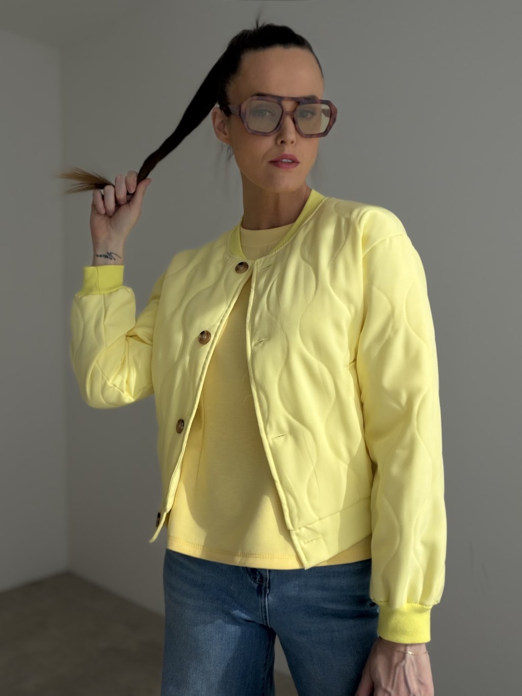 Charakterystycznym detalem jest subtelne pikowanie, które nadaje kurtce wyjątkowy wygląd i elegancką strukturę. Krótszy krój wygląda nowocześnie i pięknie podkreśla sylwetkę. Praktyczne kieszenie oraz zapięcie na guziki uzupełniają całość, dzięki czemu kurtka jest uniwersalnym elementem garderoby.