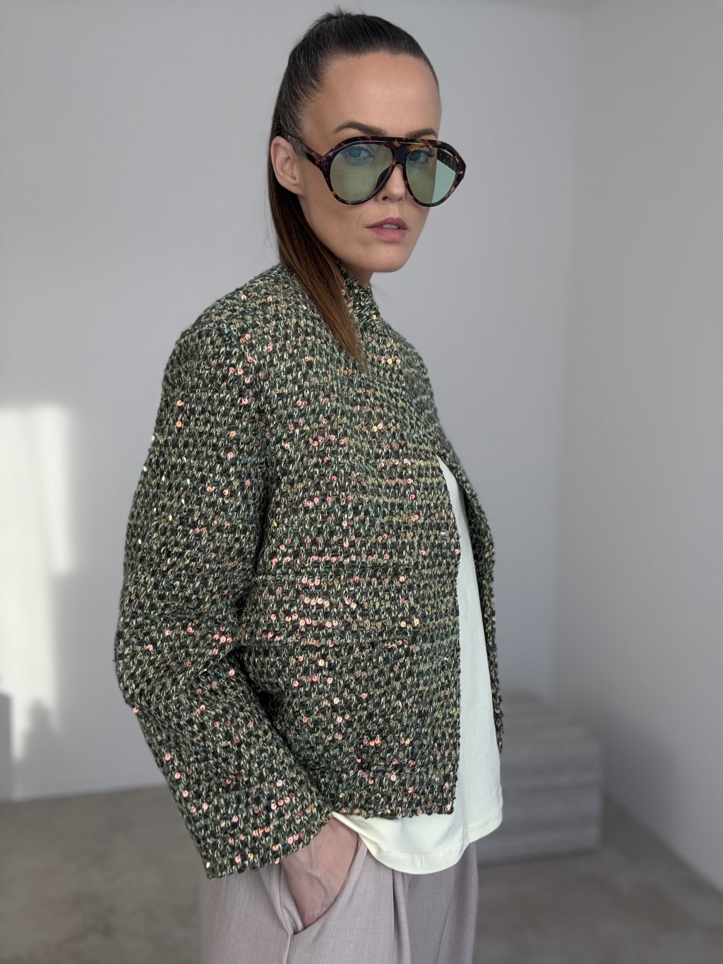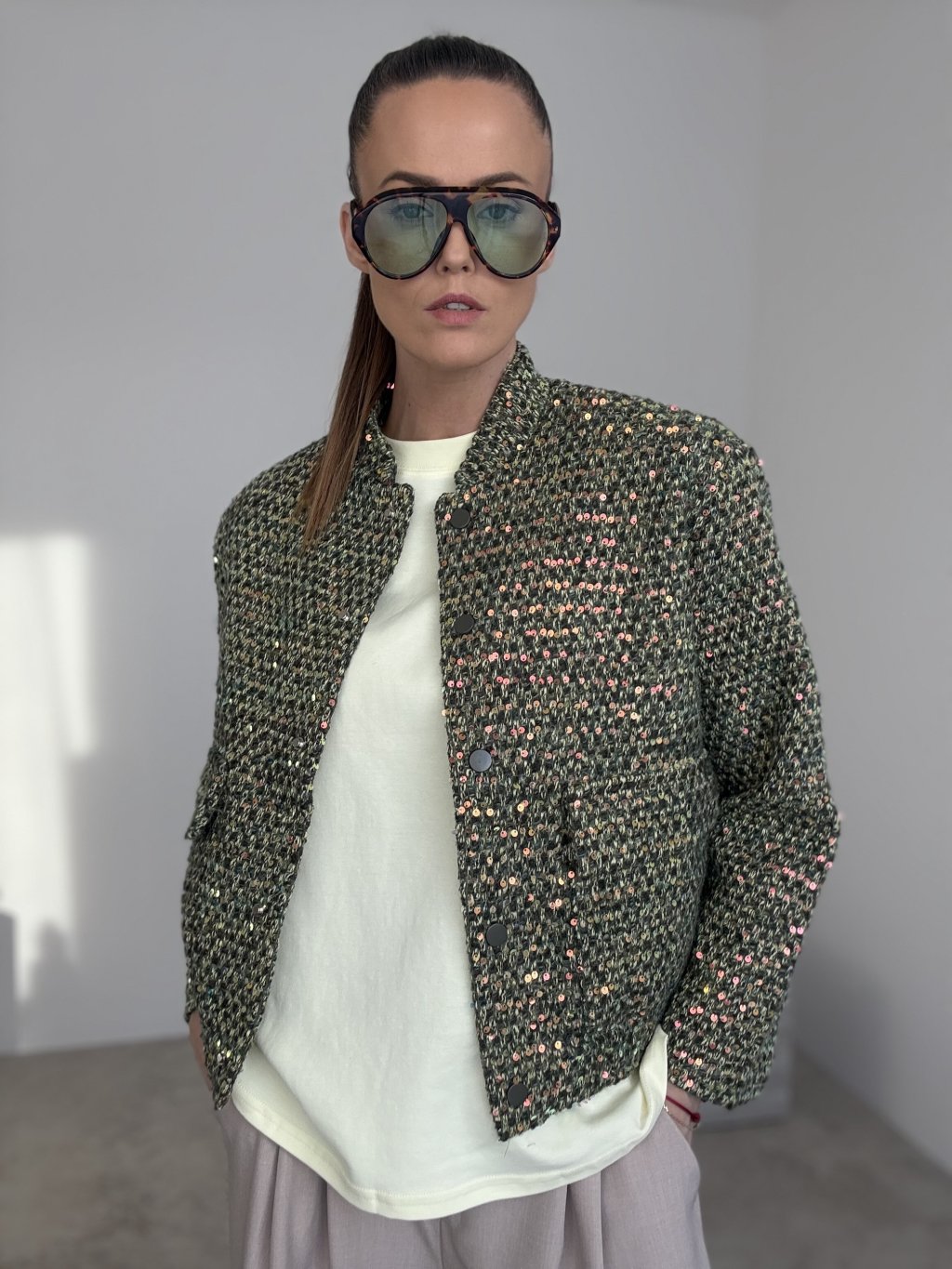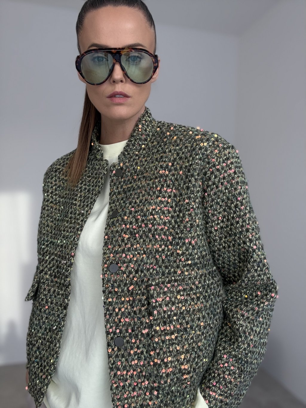 Ta kurtka to wyrazisty element garderoby, który natychmiast podkręca nawet najprostszy zestaw. Ma bardziej sztywny, strukturalny materiał w stylu bouclé/tweed z delikatnym, cekinowym połyskiem, dzięki czemu wygląda elegancko i nowocześnie. Krój jest lekko skrócony i prosty, więc świetnie pasuje do spodni z wysokim stanem, jeansów oraz spódnic. Zapięcie znajduje się z przodu, a całość uzupełniają praktyczne naszywane kieszenie.