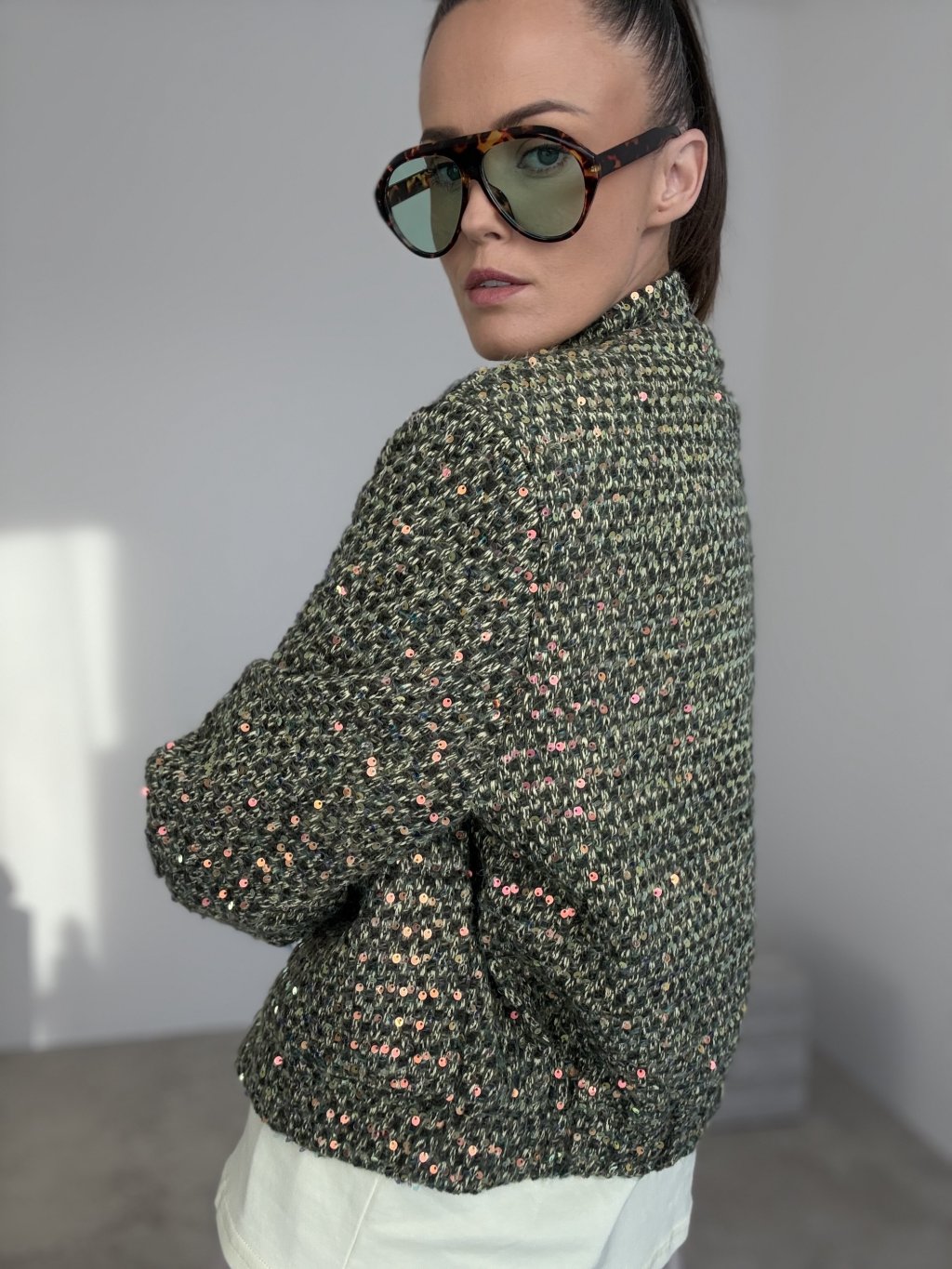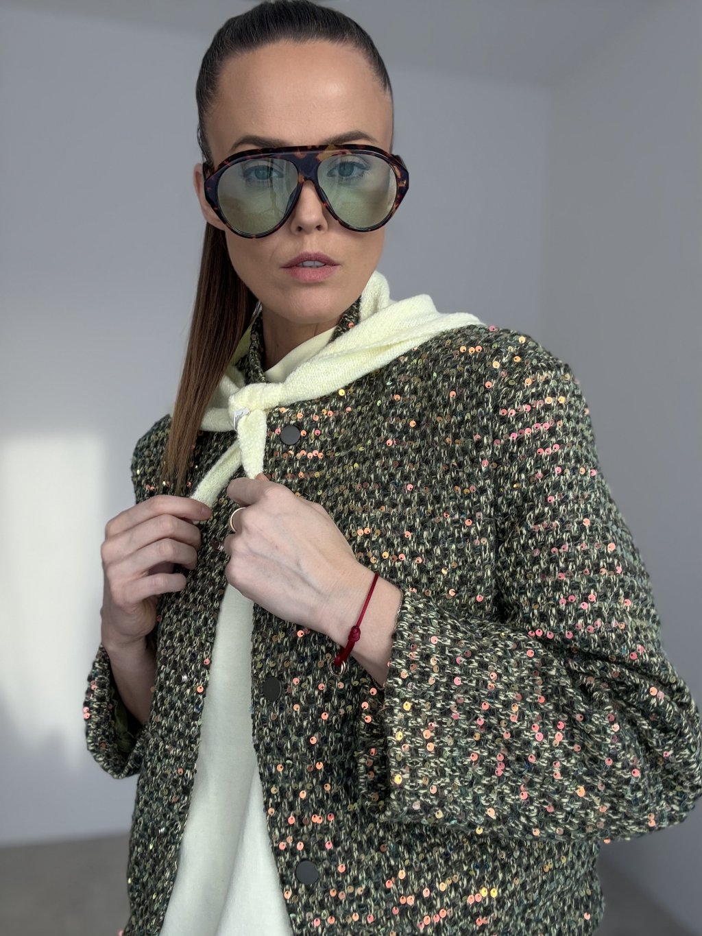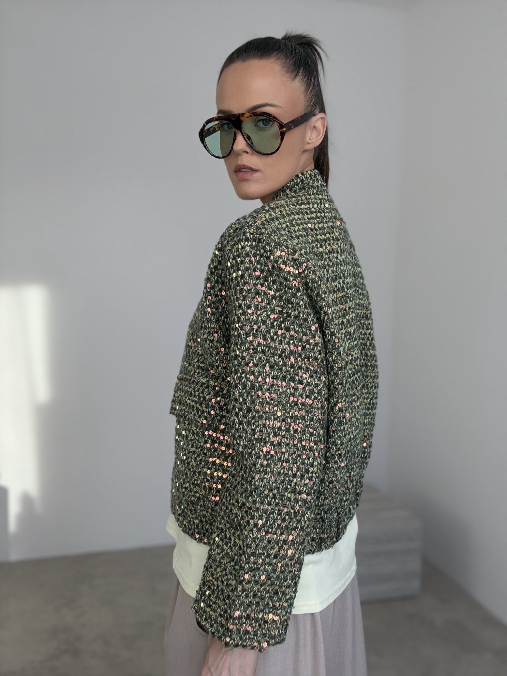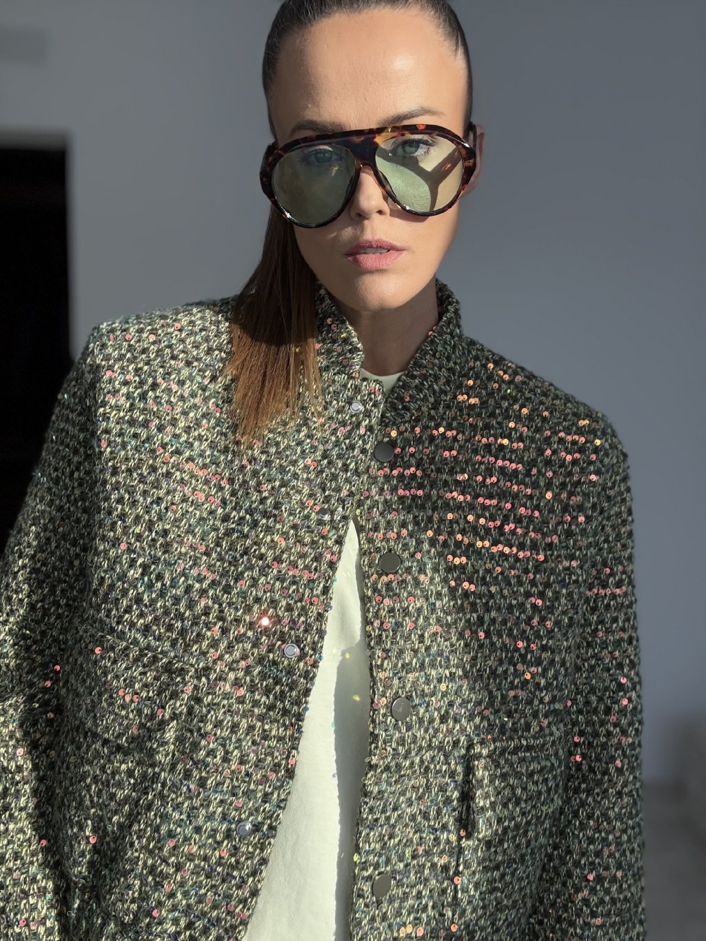 Ta kurtka to wyrazisty element garderoby, który natychmiast podkręca nawet najprostszy zestaw. Ma bardziej sztywny, strukturalny materiał w stylu bouclé/tweed z delikatnym, cekinowym połyskiem, dzięki czemu wygląda elegancko i nowocześnie. Krój jest lekko skrócony i prosty, więc świetnie pasuje do spodni z wysokim stanem, jeansów oraz spódnic. Zapięcie znajduje się z przodu, a całość uzupełniają praktyczne naszywane kieszenie.
