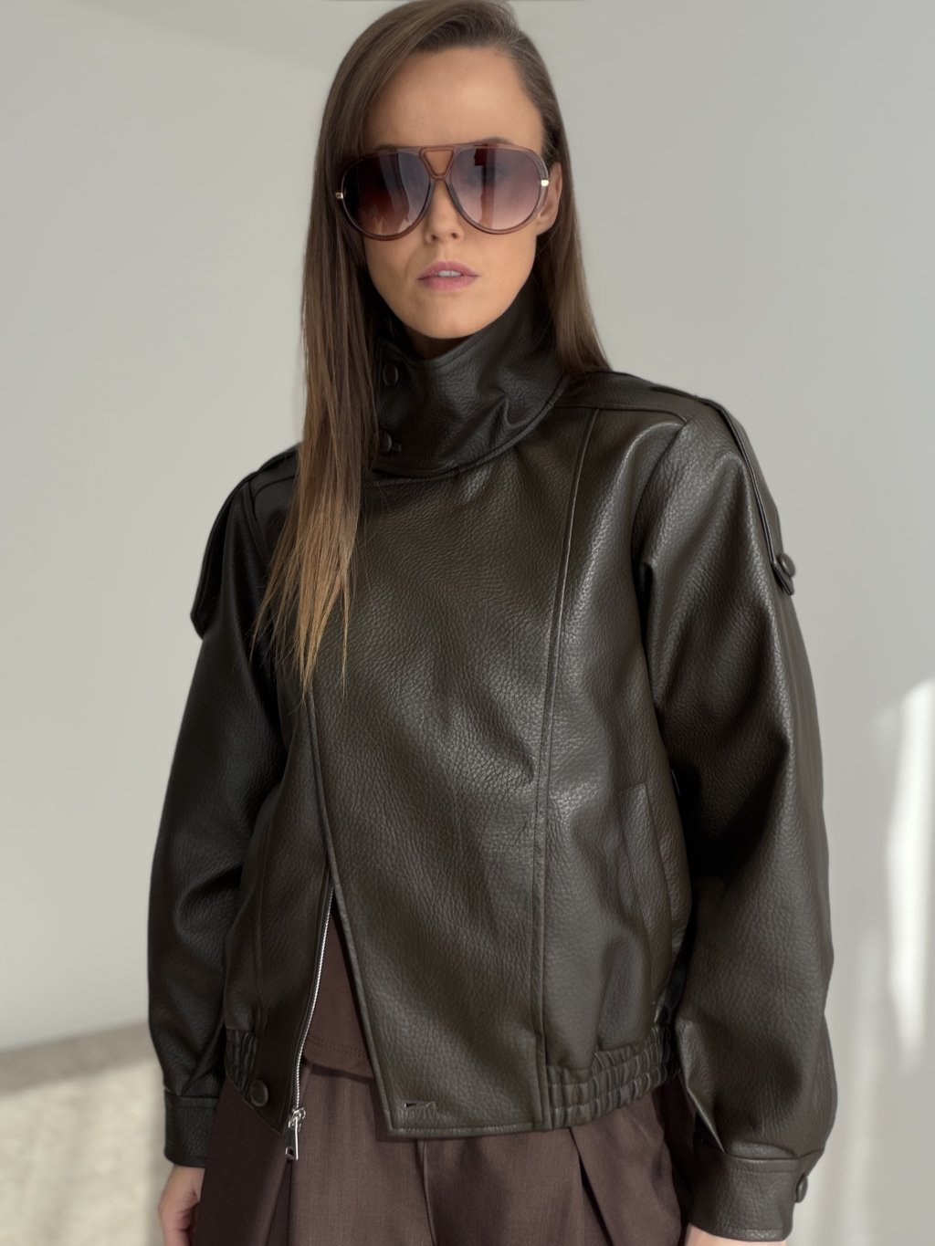 Świetnie wygląda w połączeniu z dopasowanym topem lub body, które pozwala podkreślić krój kurtki.