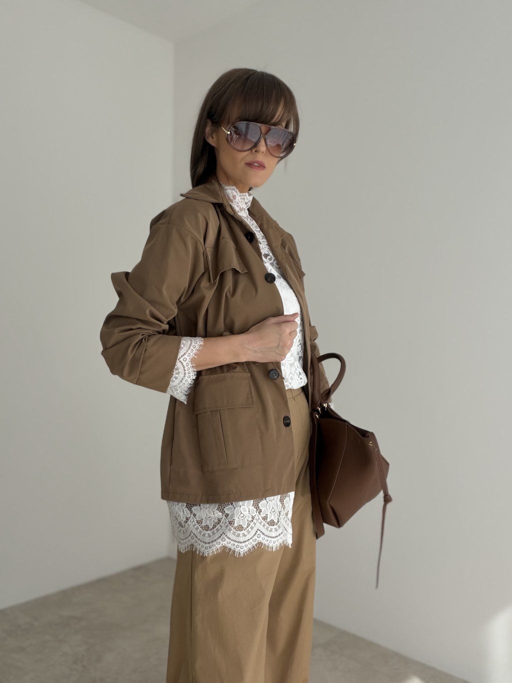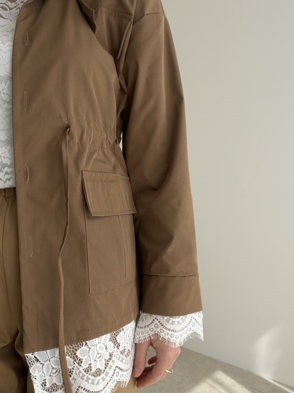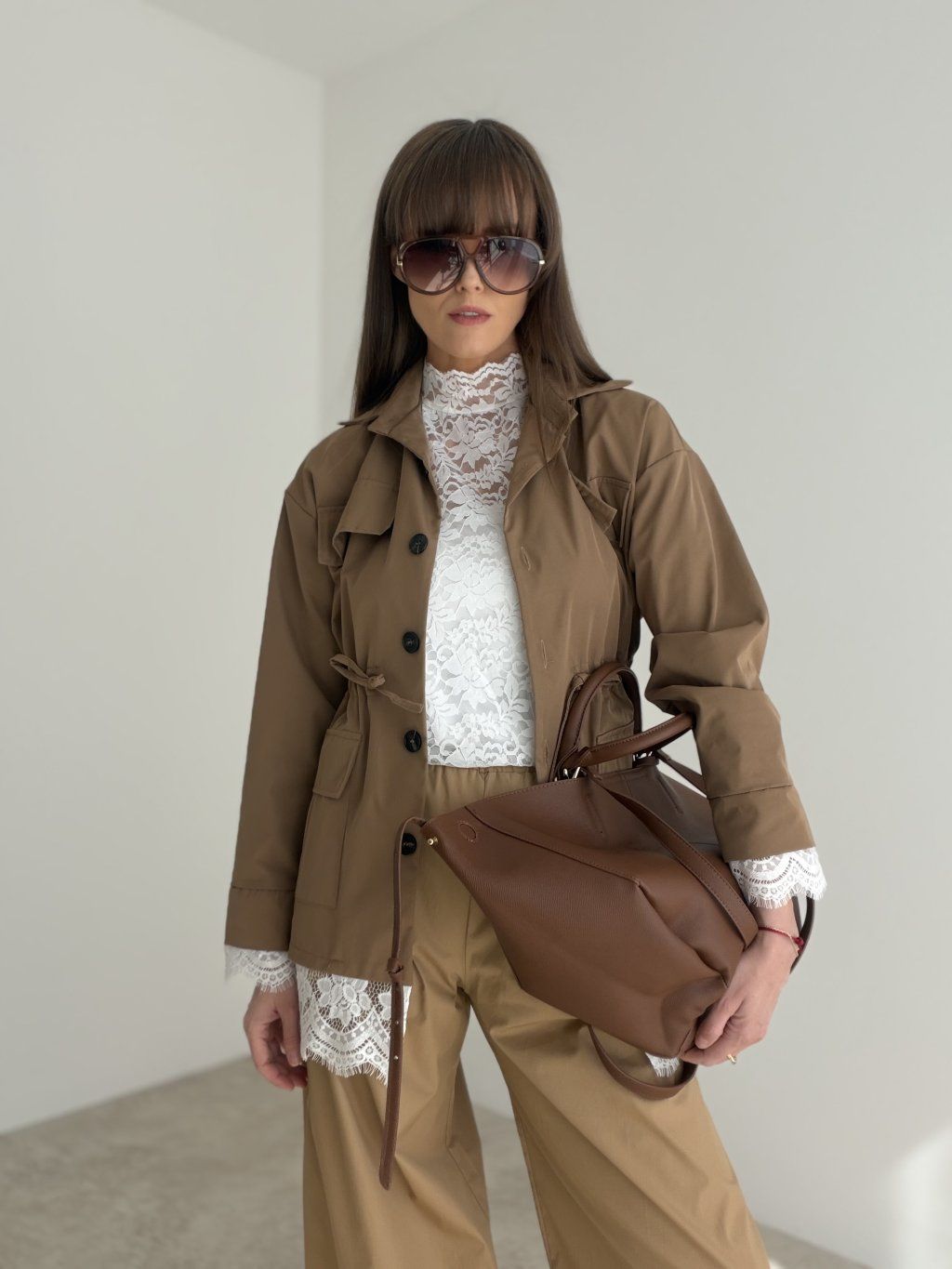 Elegancka kurtka z koronkowymi detalami i wiązaniem w talii, która prezentuje się kobieco, stylowo i pasuje zarówno do codziennych, jak i bardziej eleganckich stylizacji.